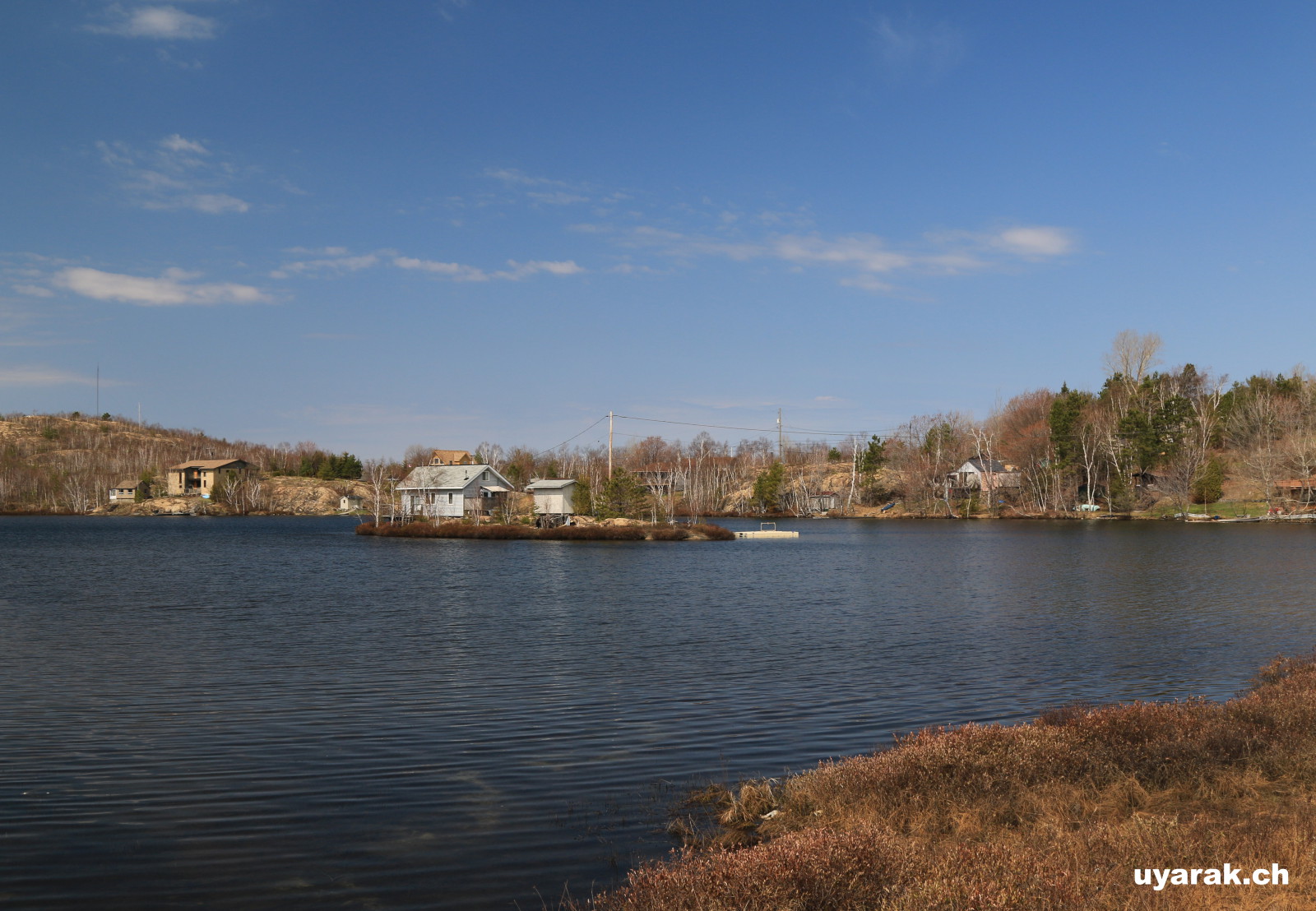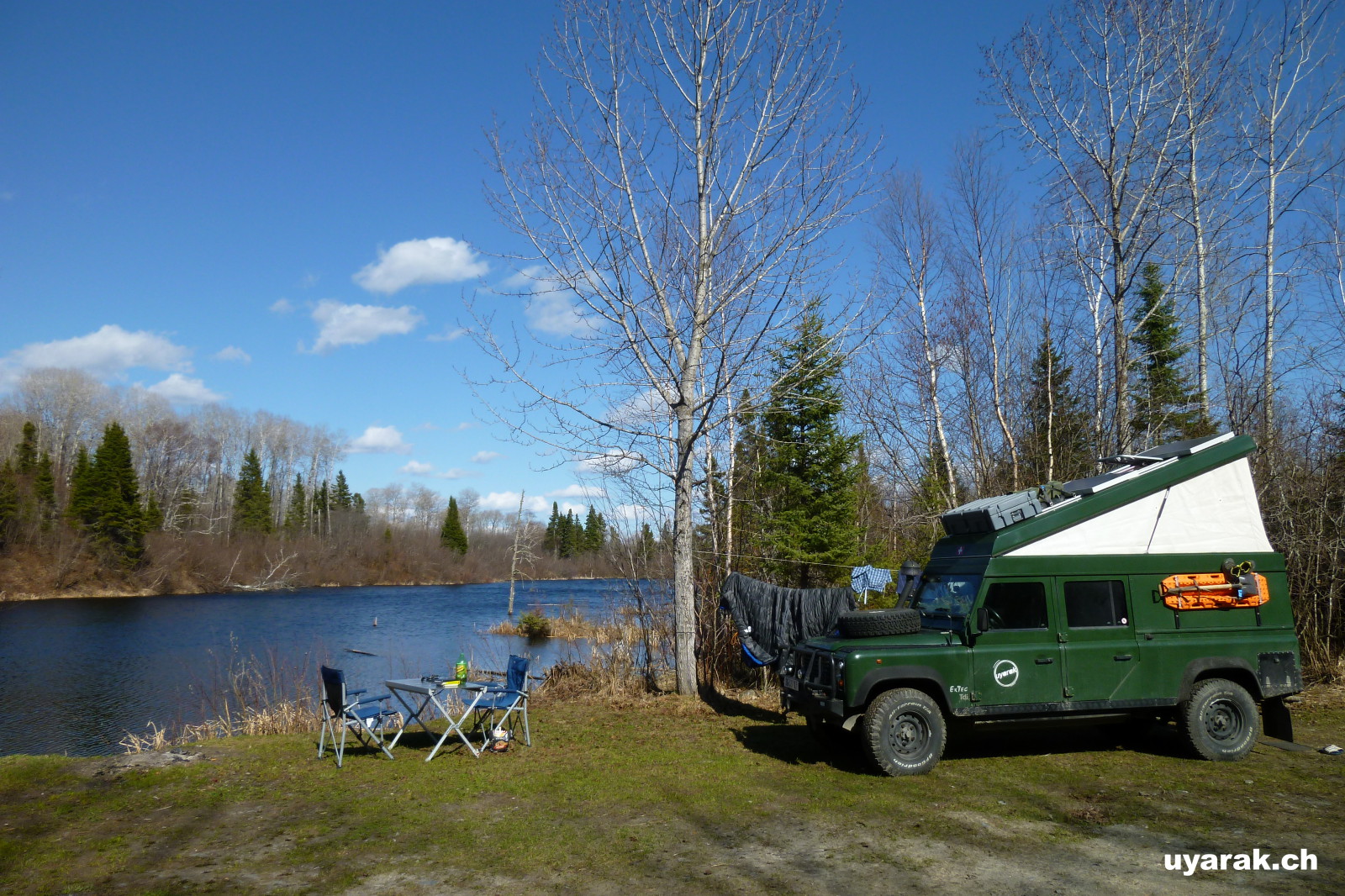 Auch am nächsten Tag legen wir einige Kilometer zurück. Kurz nach Sudbury sehen wir einen alten Land Rover Discovery mit offener Motorhaube auf der Gegenspur stehen. Kurzerhand drehen wir um und fragen nach ob wir helfen können. Das junge Paar wollte soeben auf die Hochzeit einer guten Kollegin. Da das Auto Kühlflüssigkeit verliert geben wir gerne unsere soeben eingekauften Wasservorräte her und begleiten die beiden noch bis zur nächsten Tankstelle. Als er da den Behälter des Kühlwassers öffnet kommt uns das Problem altbekannt vor. Es hat Abgas im Kühlkreislauf, so dass es wie wild nach oben schäumt. Martin und ich ahnen Böses, denn unsere Reparatur hat damals einige Zeit in Anspruch genommen. Während sich die Beiden ein Taxi organisieren, machen wir uns wieder auf den Weg in die Gegenrichtung. Für die Übernachtung haben wir einen guten Tipp bekommen. Nicht weit vor Thessalon hat es 12 Hausplätze welche zum Verkauf ausgeschrieben sind. Die Zufahrten sind bereits präpariert und so wählen wir Nr. 12 mit einer eigenen Bootanlegestelle.