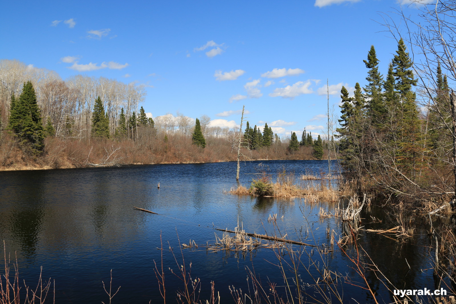 Von Pancake Bay bis zum White Lake Provincial Park ist die Landschaft einfach atemraubend. Grüne Tannen so weit das Auge reicht, überall traumhafte Seen (insgesamt etwa 200'000 in Ontario) umgeben von roten Felsen. Ein richtiges Naturerlebnis. Am Nachmittag folgen wir einer dieser vielen Abzweigungen in den Wald hinein und gelangen an einen super Stellplatz. Gleich nebenan haben Biber das Wasser gute 2 m gestaut. Kurz die Campingstühle ausgepackt schaut ein braunes Pelztier bereits neugierig aus dem Wasser. Am Abend erhalten wir Besuch von einem Jäger. Nach einigen Schüssen kommt er auch schon zurück und wir können seine Beute (2 Spruce Grouse) begutachten. Biberaction pur haben wir am nächsten Morgen. Erstaunt vom lärmigen Erwachen schauen wir aus dem kleinen Dachfenster. Die Sonne scheint direkt auf den mit Nebelschwaden überzogenen See und wir können 3 fleissige Biber beim Dammbau beobachten.