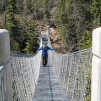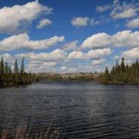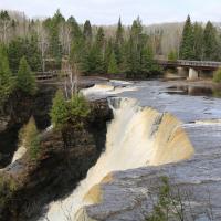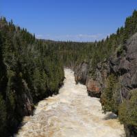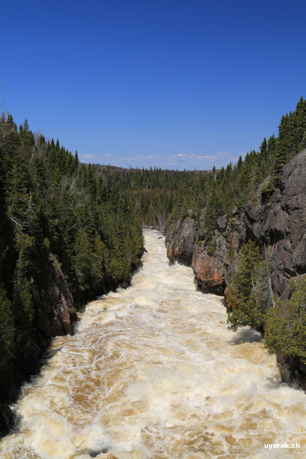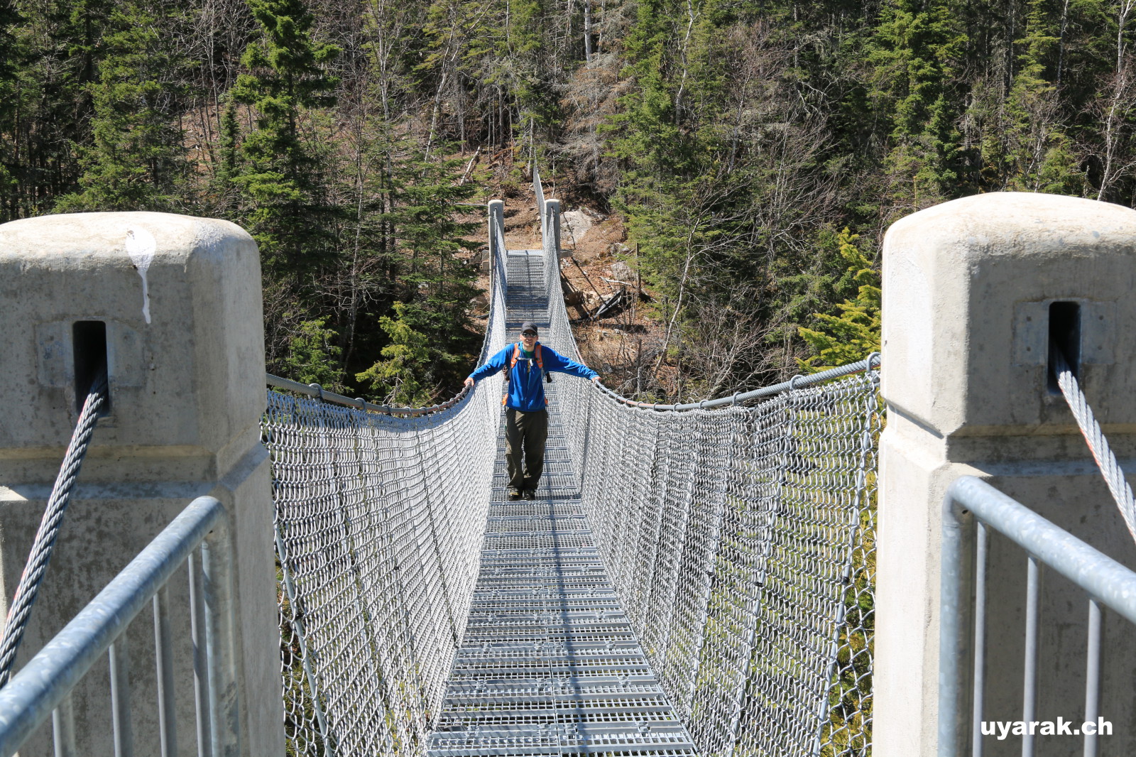 Alles zusammengepackt geht es in den nahegelegenen Pukaskwa Nationalpark. Der Reiz ist gross denn im Reiseführer steht "Trekking im Pukaskwa NP nur mit Wildniserfahrung möglich". Vorerst entscheiden wir uns für einen kleinen Trail da wir nur 1.5 Liter Wasser dabei haben. Für dieses kleine Stück muss ich nicht einmal eine Trekkinghose anziehen. Doch als wir dann losmarschieren entdeckt Martin, dass der lange Trail (insgesamt 60 km) viel cooler wäre, denn er führt zu einer Hängebrücke. Spontan entscheiden wir dieser Route so lange zu folgen bis wir die Hälfte des Wassers getrunken haben. Das Abenteuer kann beginnen. Wir huschen über einen langen Holzsteg der 1 cm unter Wasser steht, springen von einer trockenen zur anderen trockenen Stelle um nicht im Sumpf zu landen, über und unter Baumstämmen durch und immer wieder geht es durch knietiefen Schnee. Ihr könnt euch denken wie meine frisch gewaschene Jeans nach nur 10 Minuten ausgesehen hat. ;-) Es macht richtig Spass, denn das ganze gleicht eher einem Hindernislauf als einem Wandertrail. Super schön ist der dichte Wald, die mit grünem Moos überzogenen Felsen und die Bucht an welcher wir nach gut 5 km Rast machen. Noch weiter solls gehen denn wir haben das Wasser schön aufgespart. Als wir dann nach weiteren 4 km ein lautes Rauschen hören ahnen wir, dass Martins Hängebrücke nicht mehr allzu weit ist. Nur Minuten später stehen wir auf der Brücke bei den Chigaamiwinigum Falls und sind absolut perplex. So etwas hatten wir nicht erwartet. Eine tiefe Schlucht liegt unter uns und der Fluss bringt gewaltige Mengen an tosendem Schmelzwasser. Erst Nachmittags um 16 Uhr sind wir nach insgesamt 19 km zurück beim Parkplatz.