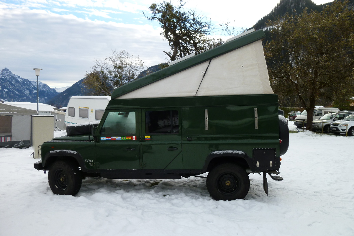 Am frühen Nachmittag fahren wir auf den nahe gelegenen kleinen Campingplatz. Da sind wir beinahe die einzigen Gäste. Die Frage ob wir einen Stromanschluss benötigen lehnen wir danken ab und erklären, dass unser Fahrzeug zwei Boardbatterien hätte, die jeweils beim Fahren und auch durch die beiden Solarzellen auf dem Dach geladen werden. So sitzen wir den ganzen Nachmittag gemütlich im warmen Landy, lesen, lernen und plaudern, denn die Standheizung funktioniert wunderbar. Als es langsam zu dämmern beginnt, bemerke ich ein rotes Lichtlein welches bei der Temperatursteuerung der Standheizung vergnügt jede Sekunde einmal aufblickt. Als ich Martin darauf aufmerksam mache, reagiert dieser aber gar nicht begeistert. Besorgt lehnt er über das Standheizungshandbuch und verkündet schon kurze Zeit danach dass uns der "Pfus" für den Ventilator der Standheizung bald ausgehen wird... Ups. Bedenklich ist nun nur, dass es a) draussen "arschkalt" ist und die Temperaturen in der Nacht noch viel weiter fallen werden und b) wir nicht einfach bei den Verteilerkästen der anderen Camper unser Kabel einstecken können, da nur diejenigen Steckdosen freigeschaltet sind, für welche vorab dafür bezahlt wurde. Aber Martin gibt nicht auf und pilgert auf dem Campingplatz umher bis er kurze Zeit später ganz verschmitzt seinen Kopf zur Landytür hereinstreckt und mir mitteilt, er habe eine Lösung für unser Problem gefunden. Kurz vor Dunkelheit werde er das knitsch orange Anschlusskabel bei einem alten Stall, an dessen Aussenwand eine Steckdose ist, über Nacht einstecken. Dann müssten wir nur noch abwarten und hoffen das niemand merkt, dass die Schweizer dem Nachbarn Strom klauen. Doch keine 2 Minuten nachdem Martin seinen Plan durchgeführt hat, beginn es so fest zu schneien, dass bereits nach 5 Minuten kein orange leuchtendes Kabel mehr zu sehen ist. So können wir uns beruhigt in unser Bett verkriechen. Gegen Mitternacht haben wir dann so mollig warm in unseren Schlafsäcken, dass wir beschliessen die Heizung auszuschalten. Doch bereits 3h später mussten wir diese wieder einschalten da es zu kalt geworden ist. Am Morgen haben wir dafür dann eine lustige Überraschung welche uns nass ins Gesicht tropft. Das ganze Dachfenster ist inwendig mit einer Eisschicht umhüllt, welche nun langsam zu schmelzen beginnt...