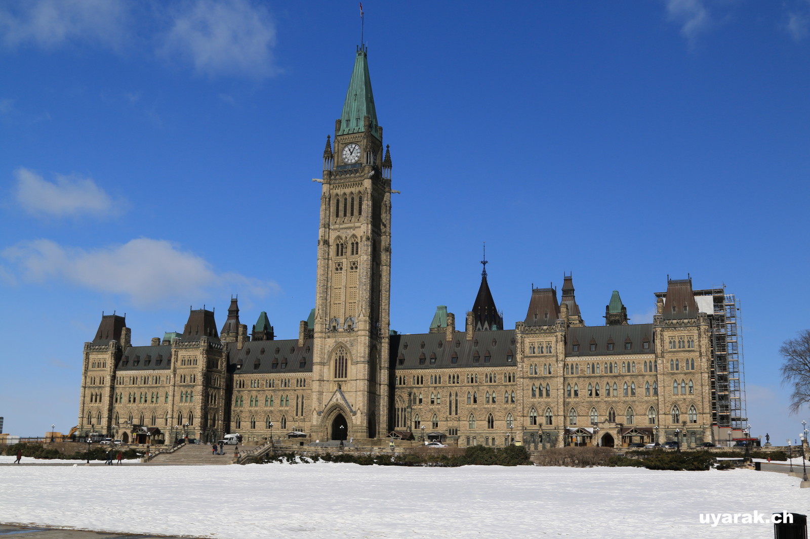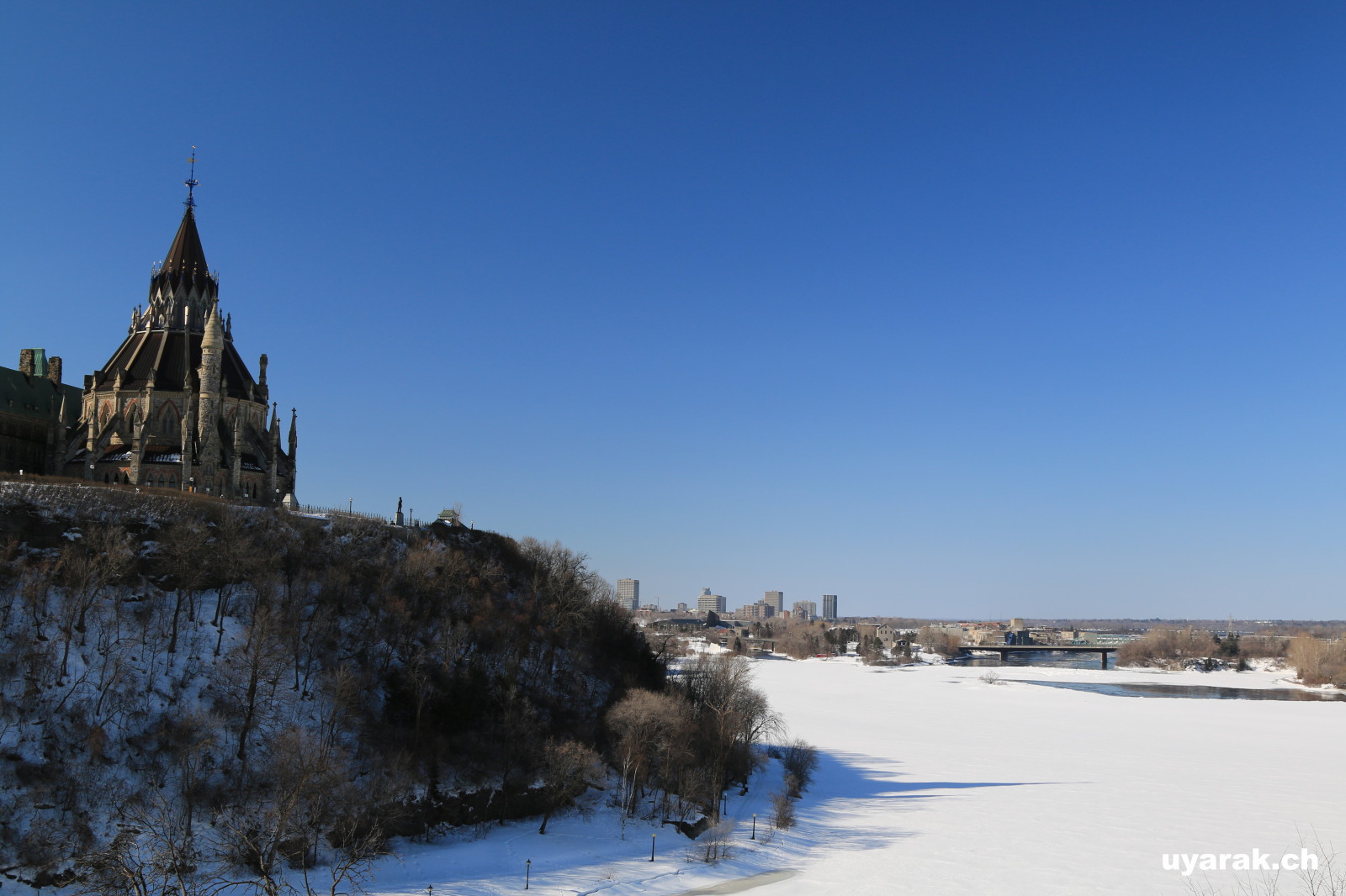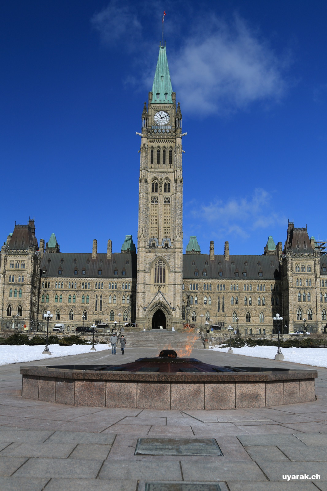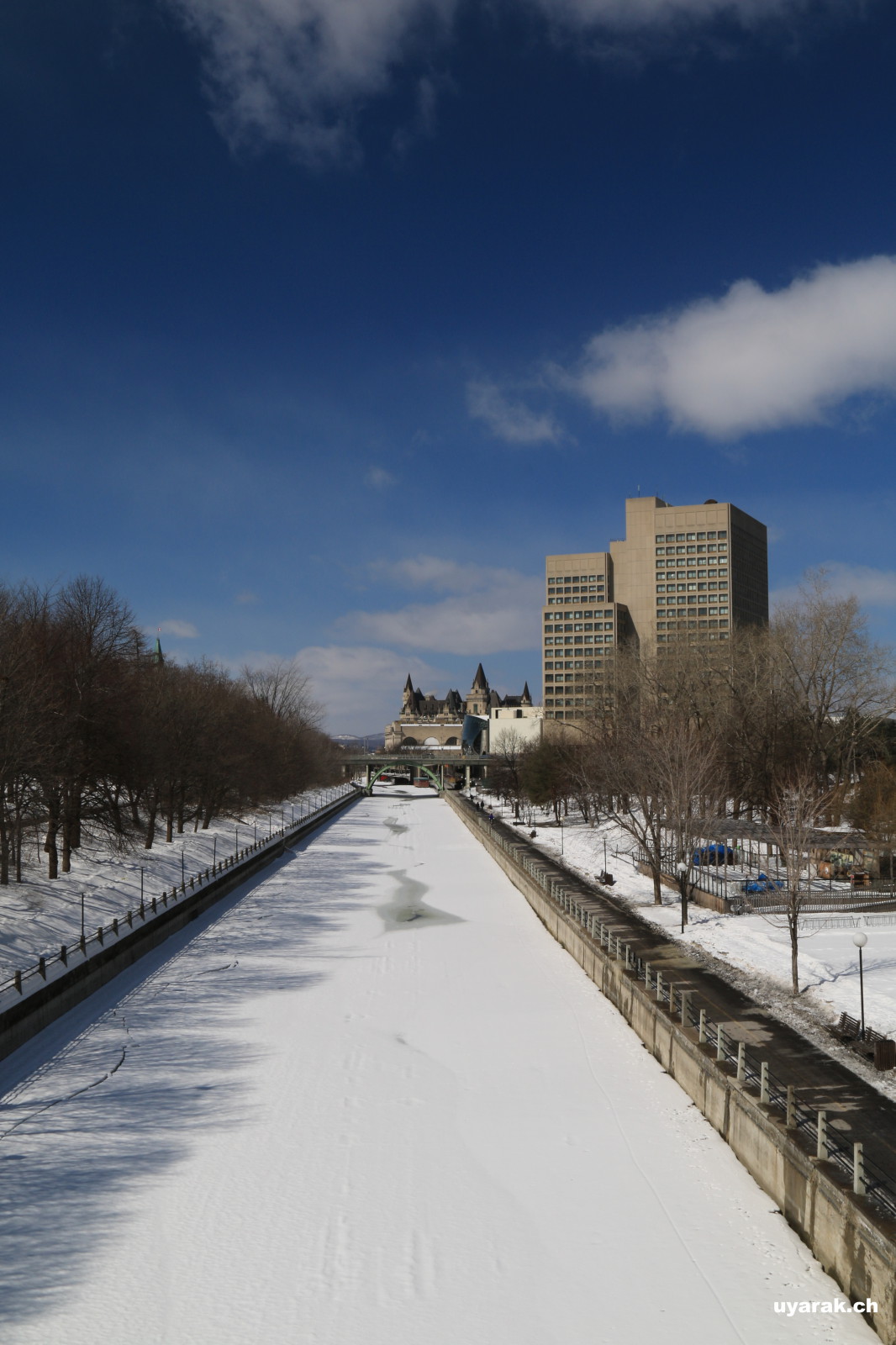 Am Sonntagmorgen scheint die Sonne direkt in unser Zimmer und wir freuen uns auf einen ausgiebigen Spaziergang durch die Stadt. Mit der Kamera ausgerüstet verlassen wir das Hotel und steuern als erstes das Grab des unbekannten Soldaten schräg vis-à-vis von unserem Hotel an. Weiter geht es zum Parliament Hill mit dem kanadischen Parlament und dem Peace Tower. Schnell merken wir aber, dass fotografieren bei diesen Temperaturen nicht so viel Spass macht, da einem die Finger fast abfrieren. Ausserdem hatte Fränzi zu hause aus nicht ganz nachvollziehbaren Gründen beschlossen, alle ihre Thermo-Unterwäsche im Fahrzeug zu verstauen. Daher kaufen wir für sie erstmal neue Strumpfhosen aus Merino-Wolle und schlendern anschliessend durch das gut geheizte Rideau Centre. Am Nachmittag machen wir einen Spaziergang entlang des zugefrorenen Rideau Kanals. Leider ist die Eisdecke bereits an vielen Stellen eingebrochen, so dass die 8 km lange Eislaufstrecke geschlossen ist. Schade, Schlittschuhlaufen auf der weltgrössten Einsbahn hätte bestimmt Spass gemacht. Aber ist vielleicht besser so, denn neben den Eishockey-begeisterten Kanadiern hätten wir bestimmt keine gute Falle gemacht.