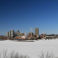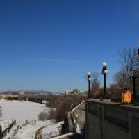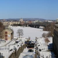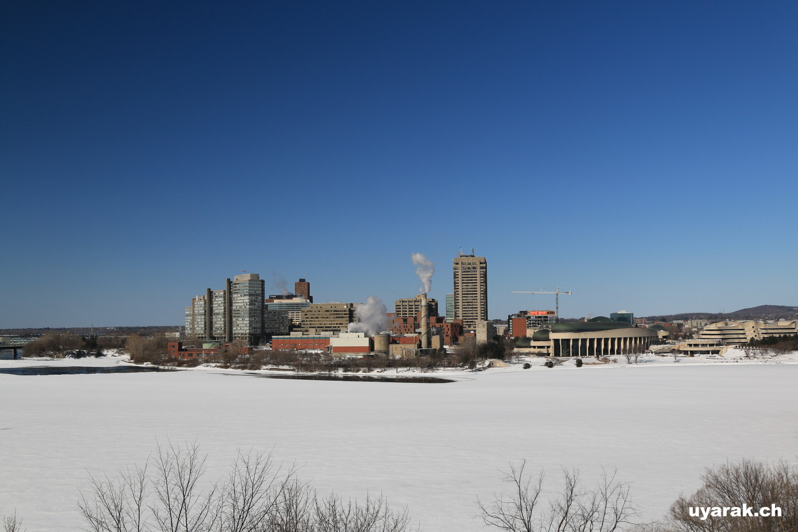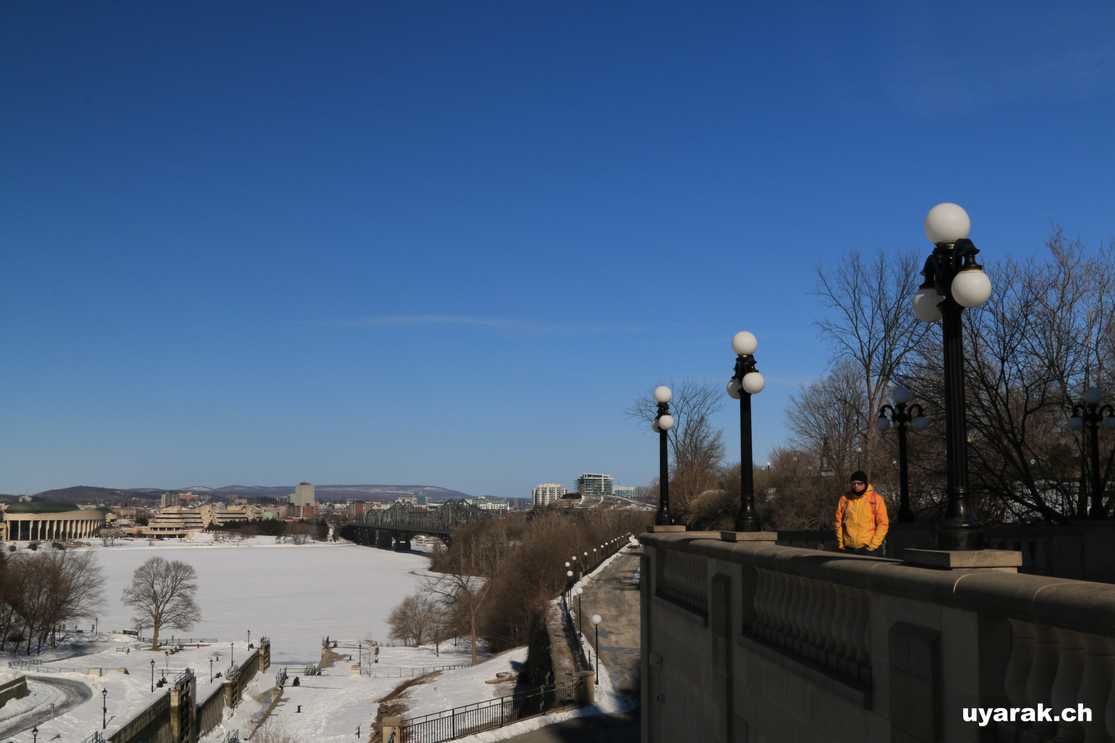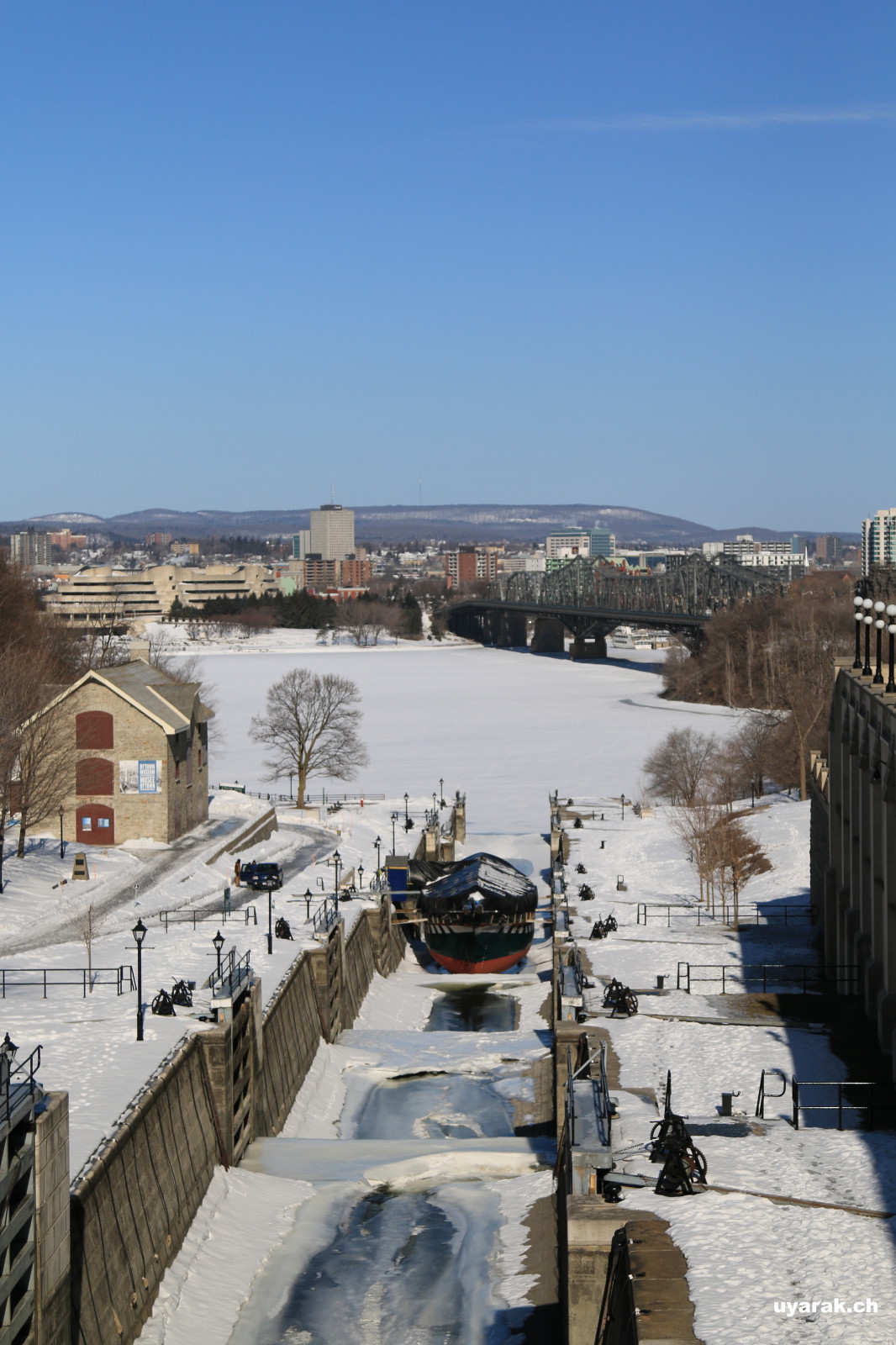 Am Montag sehen wir bereits aus dem Hotelfenster, dass es draussen immer noch gleich kalt ist, denn die Kanadier sind in dicken Mänteln eingepackt auf dem Weg zur Arbeit. Wir haben es nicht ganz so eilig mit dem Frühstück und machen uns gegen zehn Uhr dick eingepackt auf den Weg zum Ottawa River. Auf dem Weg dahin besichtigen wir die Schleusen des Rideau Canal, welche bis heute von Hand betätigt werden. Hier am unteren Ende des Flusses befinden sich acht von insgesamt 45 Schleusen, die auf 23 Standorte entlang des 202 km langen Kanales verteilt sind. Da der Kanal zugefroren ist, können wir leider kein Schiff beobachten, dass durch die Schleusen fährt. Auch auf dem Ottawa River gibt es keine Schiffe zu beobachten, nur ein einzelner Füssgänger ist mit seinem Hund auf dem Eis unterwegs. Später schauen wir uns noch an, wo der kanadische Premierminister und der Generalgouverneur wohnen.