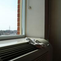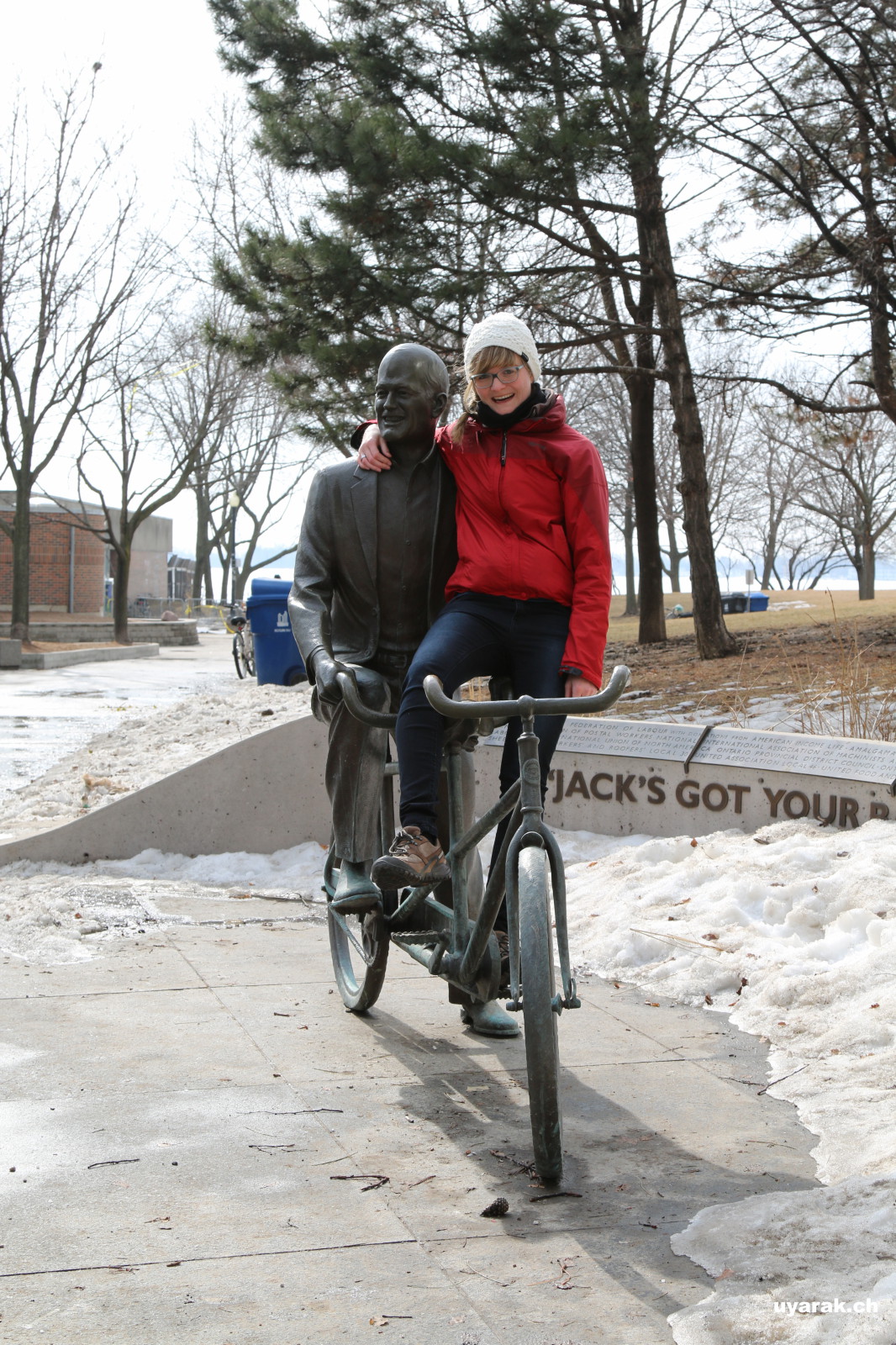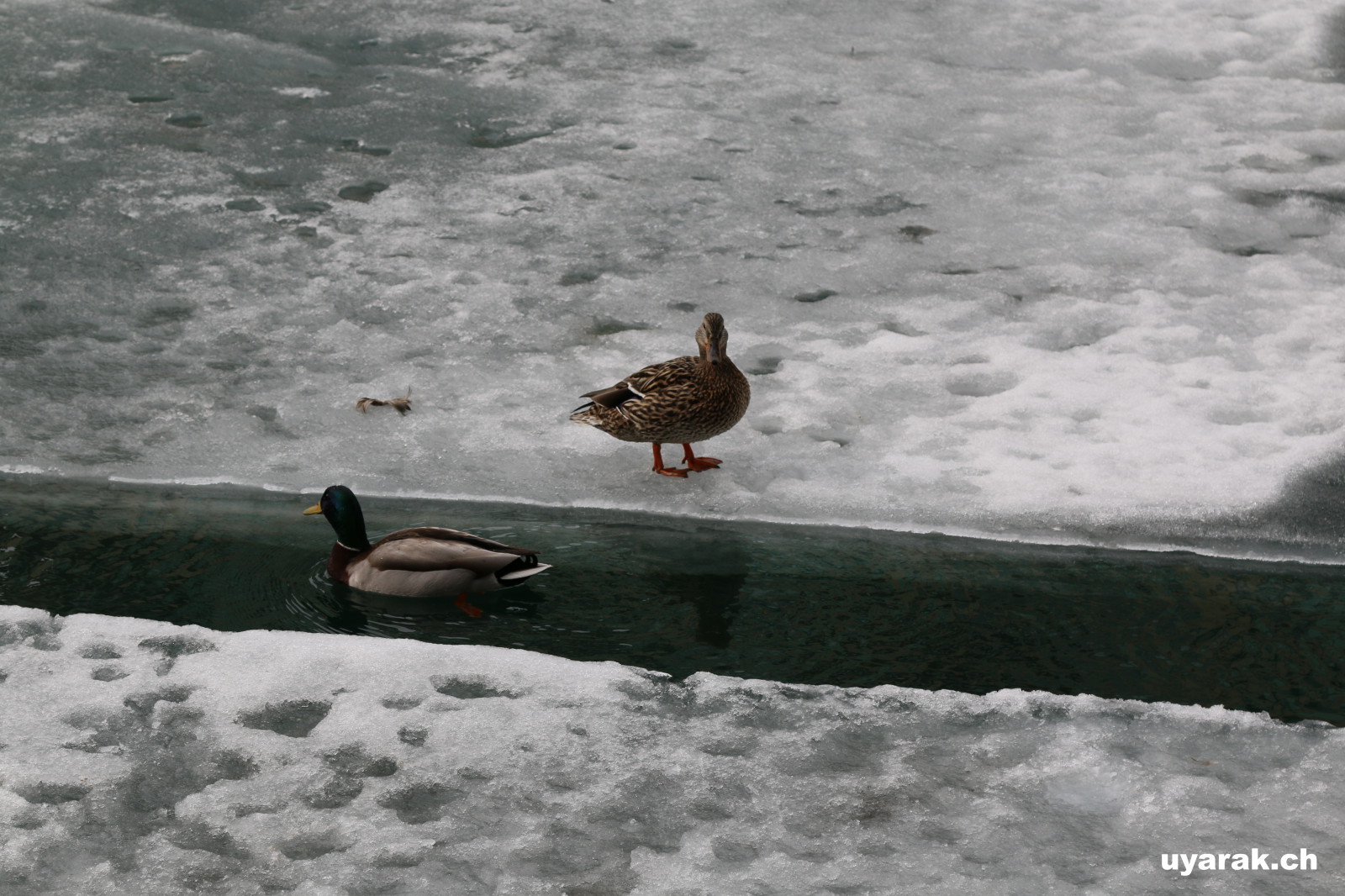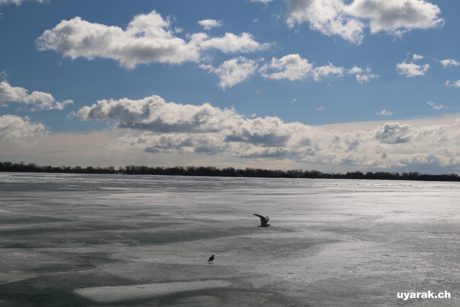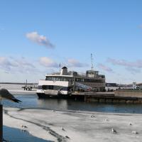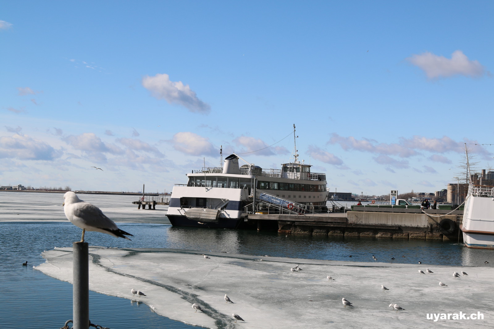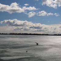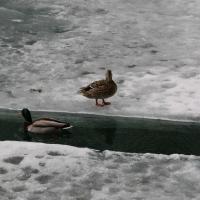 Die Strassenarbeit läuft in Toronto zur Zeit auf Hochtouren. Die ganze Strasse dem Hauptbahnhof entlang sowie die Strassen beim Lake Ontario werden umgebaut. Um uns etwas auszuruhen ziehen wir uns an den Lake Ontario zurück und geniessen denn traumhaften Anblick. Der Winter hat den Lake Ontario eingefroren und so glitzert der ganze See, wenn die Oberfläche die Sonnenstrahlen reflektiert. Wir amüsieren uns, als wir sehen, dass sich auch die Enten zu helfen wissen. Sie nutzen einen schmalen, eisfreien Streifen als Kanal zum Schiffsanleger. Leider ist der Kanal sehr schmal, so dass bei Gegenverkehr eine der Enten jeweils aufs Eis ausweichen muss (siehe Foto).
