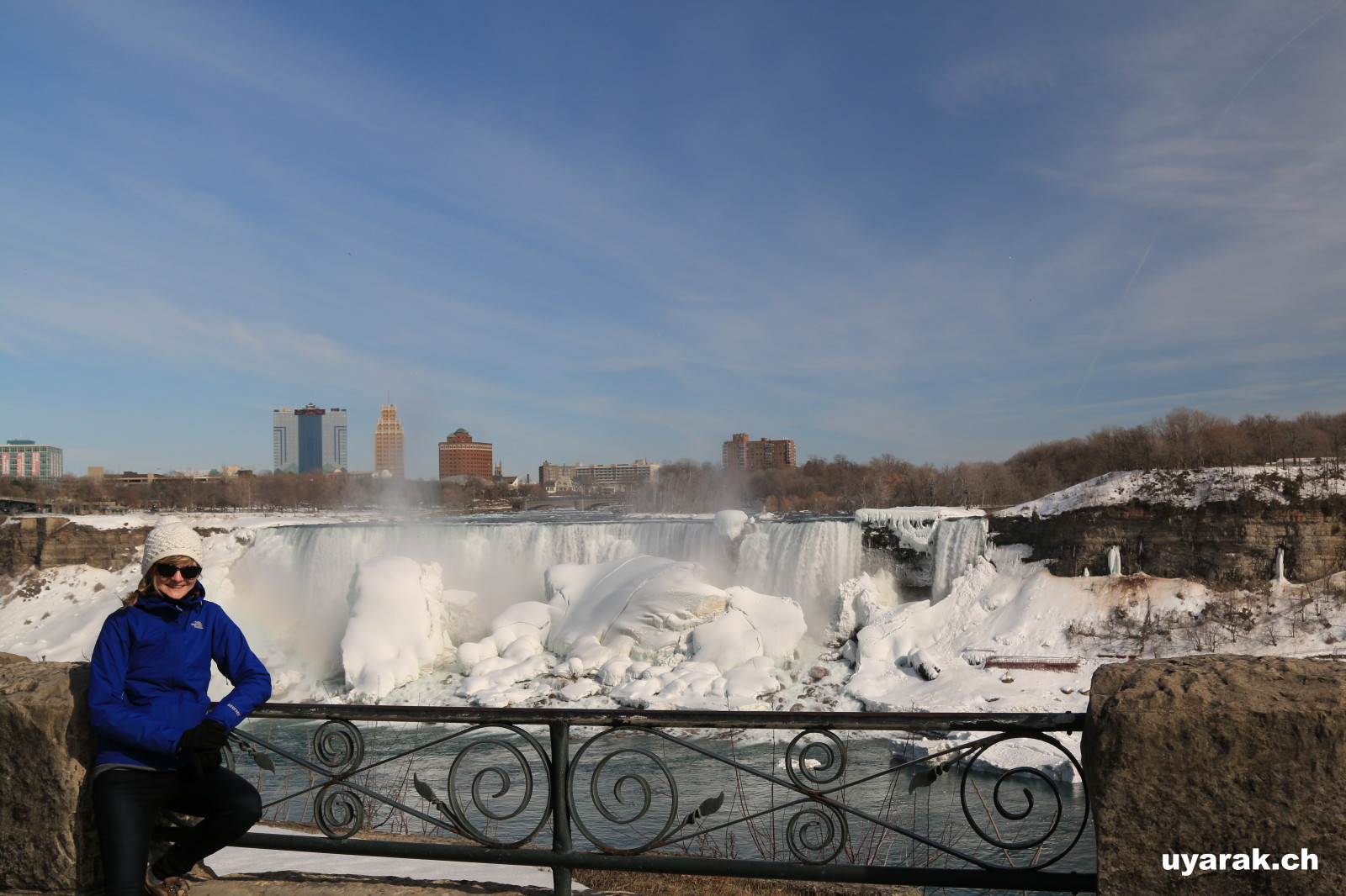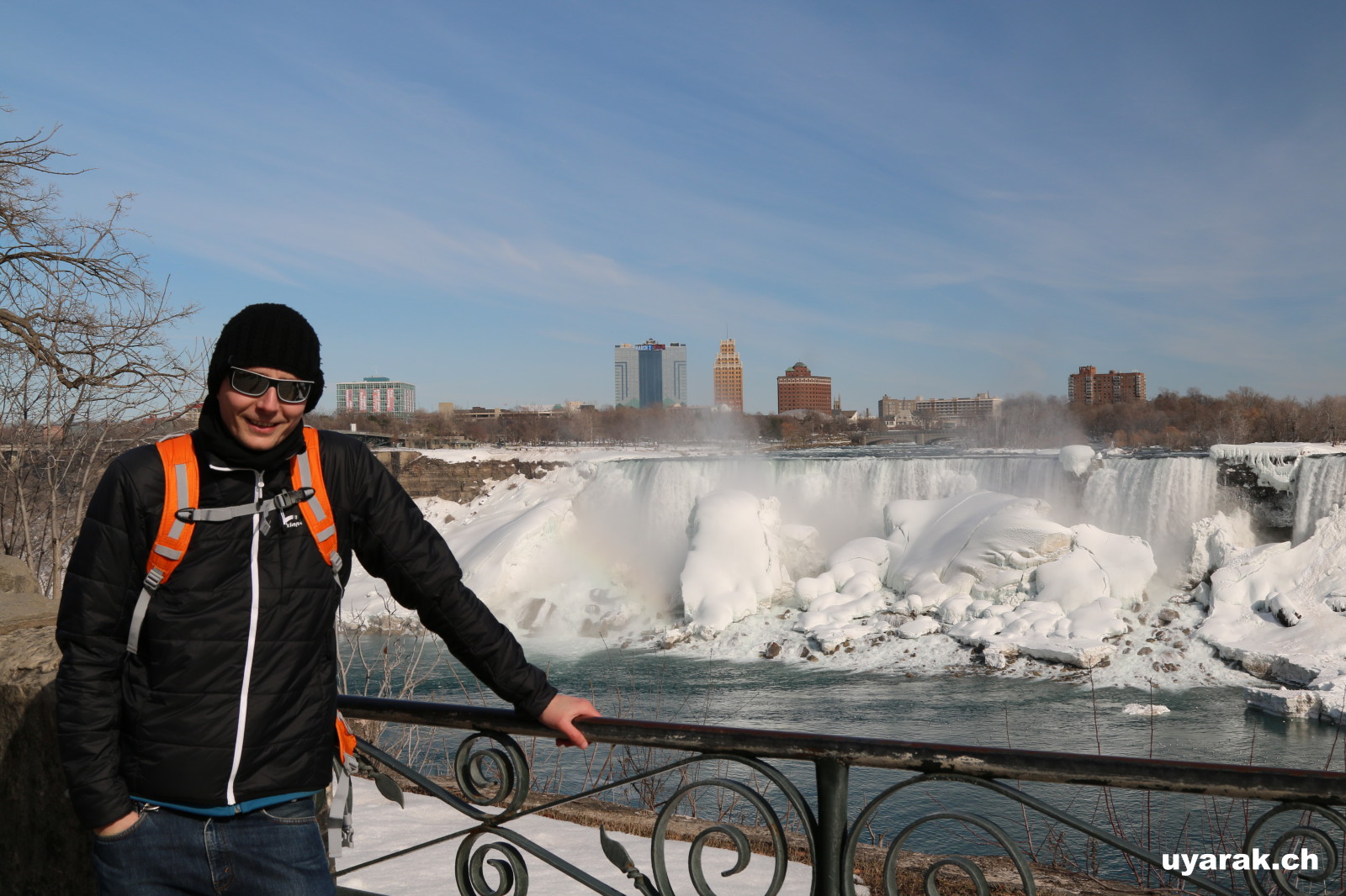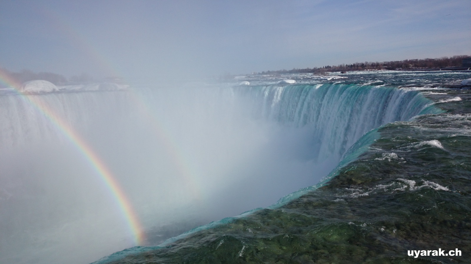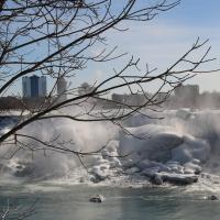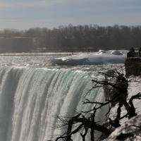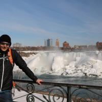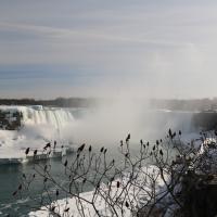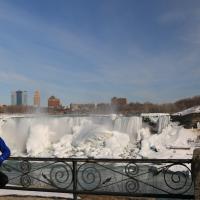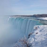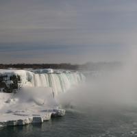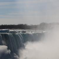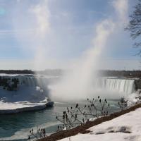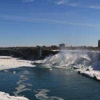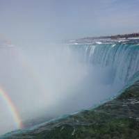 Als wir gegen 15 Uhr zum zweiten Mal die Niagara Fälle besuchen, steht sogar ein farbenfroher Regenbogen für uns beide bereit und wartet nur so darauf bewundert zu werden. Da dieser Winter in Kanada besonders eisig kalt war, haben sich vor den American Falls gigantische Eisblöcke gebildet, welche die Sicht zum Wasserfall schon fast ganz verdecken. Auch der Fluss ist grösstenteils zugefroren und wie dick die Eisschicht wirklich ist, kann man gut erkennen. Die Horseshoe Falls sind unglaublich eindrücklich, denn aus 54 m Höhe donnern auf einer Länge von 700 m gewaltige Mengen an Wasser in den Fluss und bringend dadurch eine riesige Gischtwolke hervor. Wenn man im Reiseführer die waghalsigen Stunts liest, möchte man weder mit dem Kajakfahrer noch mit den Wahnsinningen welche in einem Holzfass die Fälle hinuntergerauscht sind, tauschen.