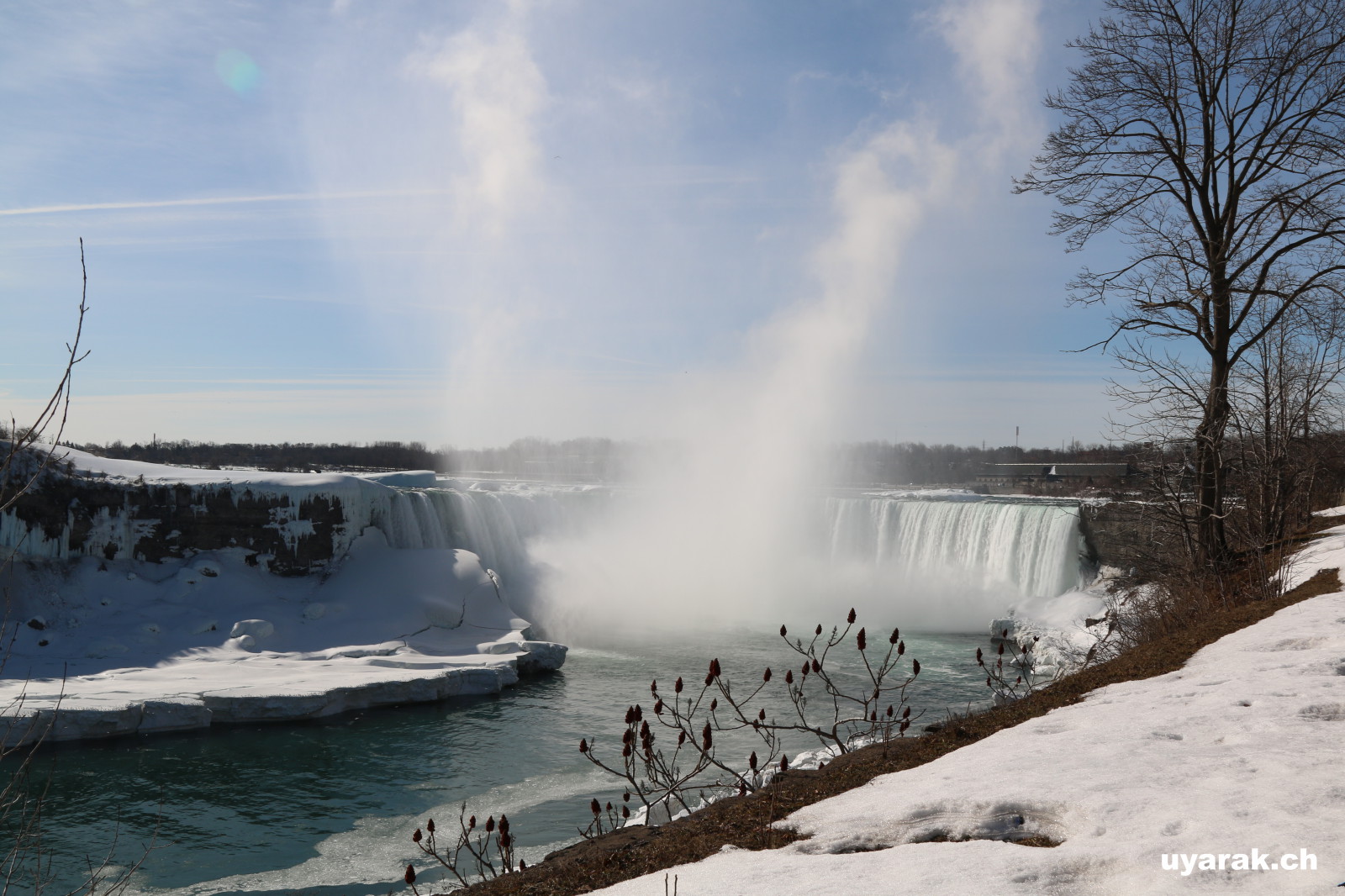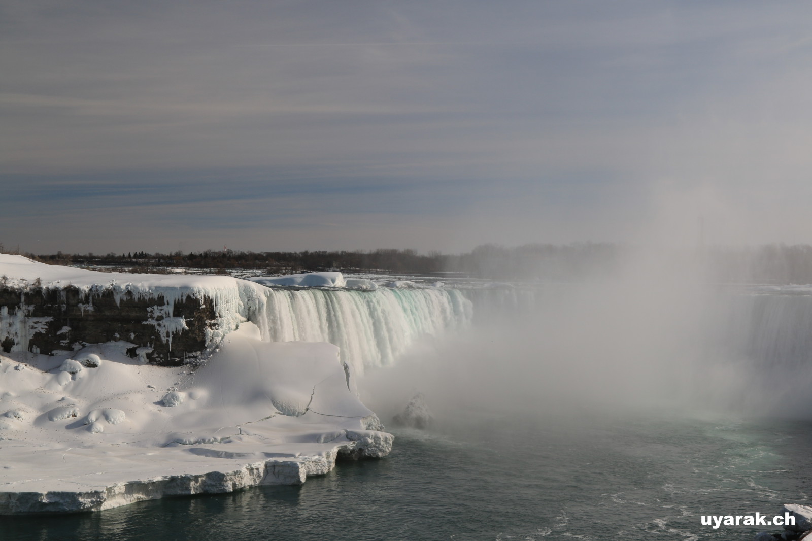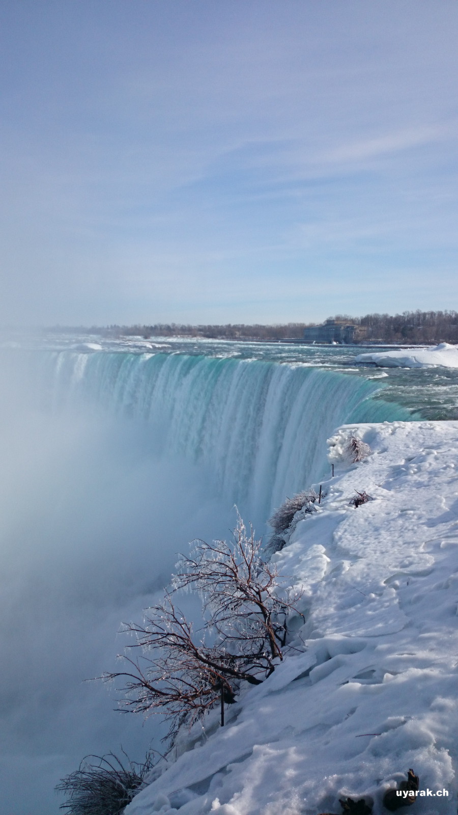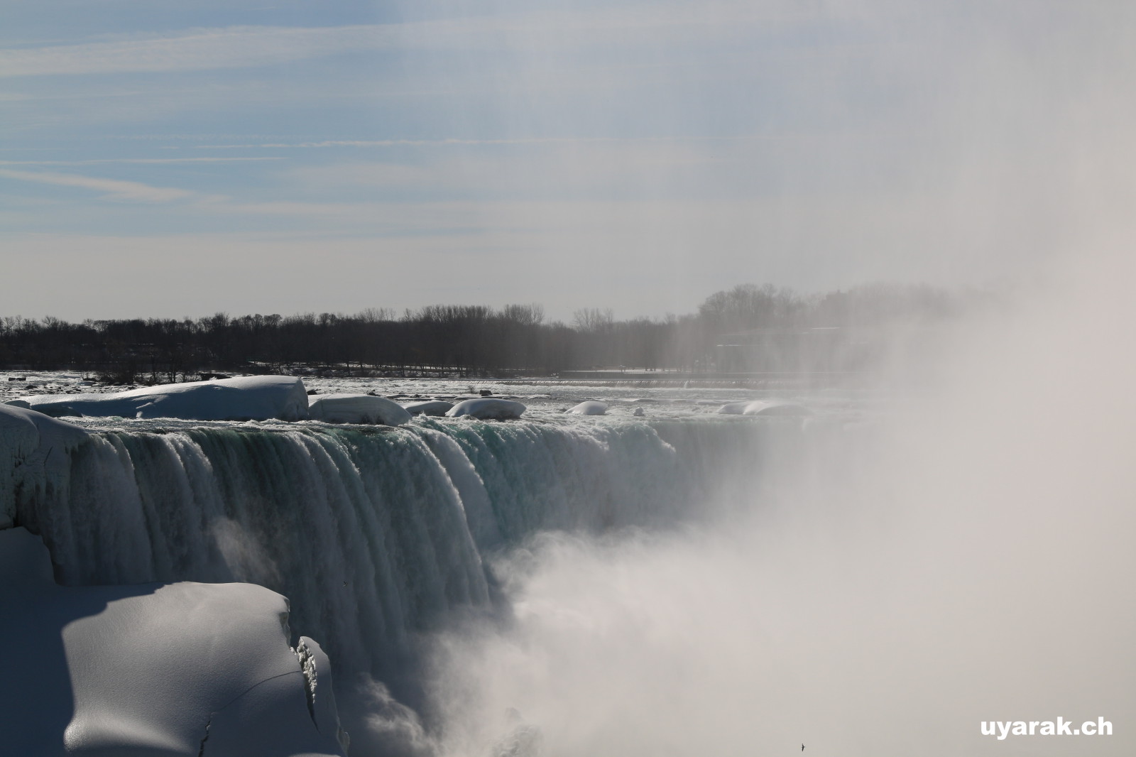 Als wir gegen 15 Uhr zum zweiten Mal die Niagara Fälle besuchen, steht sogar ein farbenfroher Regenbogen für uns beide bereit und wartet nur so darauf bewundert zu werden. Da dieser Winter in Kanada besonders eisig kalt war, haben sich vor den American Falls gigantische Eisblöcke gebildet, welche die Sicht zum Wasserfall schon fast ganz verdecken. Auch der Fluss ist grösstenteils zugefroren und wie dick die Eisschicht wirklich ist, kann man gut erkennen. Die Horseshoe Falls sind unglaublich eindrücklich, denn aus 54 m Höhe donnern auf einer Länge von 700 m gewaltige Mengen an Wasser in den Fluss und bringend dadurch eine riesige Gischtwolke hervor. Wenn man im Reiseführer die waghalsigen Stunts liest, möchte man weder mit dem Kajakfahrer noch mit den Wahnsinningen welche in einem Holzfass die Fälle hinuntergerauscht sind, tauschen.