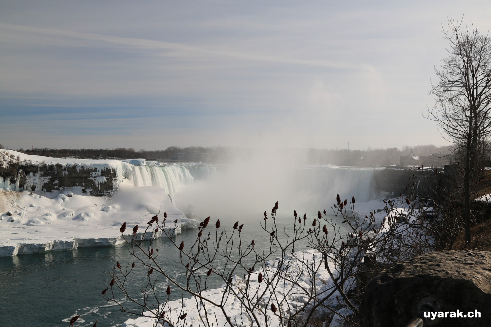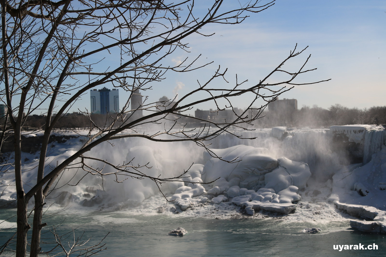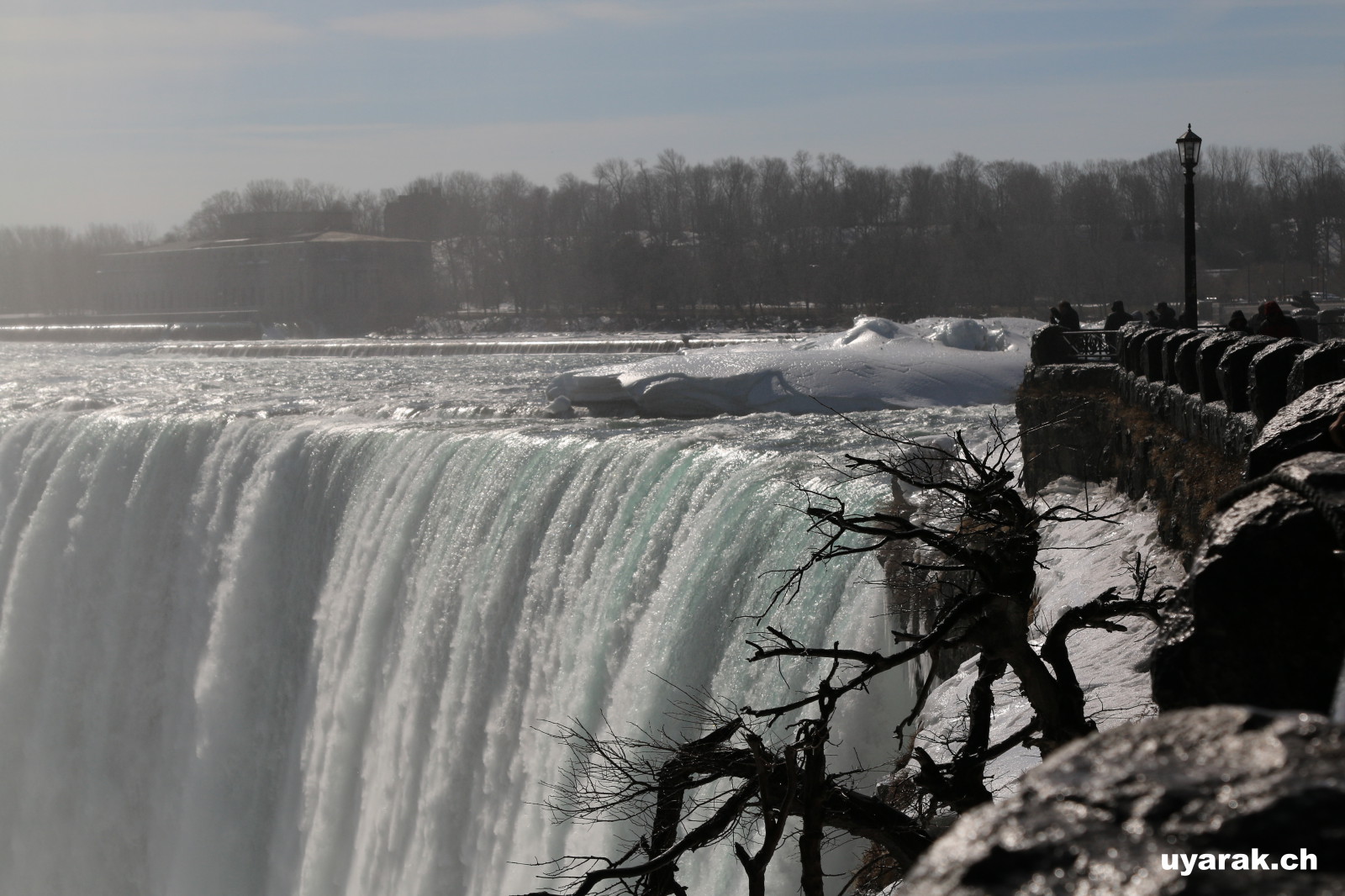 Als wir gegen 15 Uhr zum zweiten Mal die Niagara Fälle besuchen, steht sogar ein farbenfroher Regenbogen für uns beide bereit und wartet nur so darauf bewundert zu werden. Da dieser Winter in Kanada besonders eisig kalt war, haben sich vor den American Falls gigantische Eisblöcke gebildet, welche die Sicht zum Wasserfall schon fast ganz verdecken. Auch der Fluss ist grösstenteils zugefroren und wie dick die Eisschicht wirklich ist, kann man gut erkennen. Die Horseshoe Falls sind unglaublich eindrücklich, denn aus 54 m Höhe donnern auf einer Länge von 700 m gewaltige Mengen an Wasser in den Fluss und bringend dadurch eine riesige Gischtwolke hervor. Wenn man im Reiseführer die waghalsigen Stunts liest, möchte man weder mit dem Kajakfahrer noch mit den Wahnsinningen welche in einem Holzfass die Fälle hinuntergerauscht sind, tauschen.