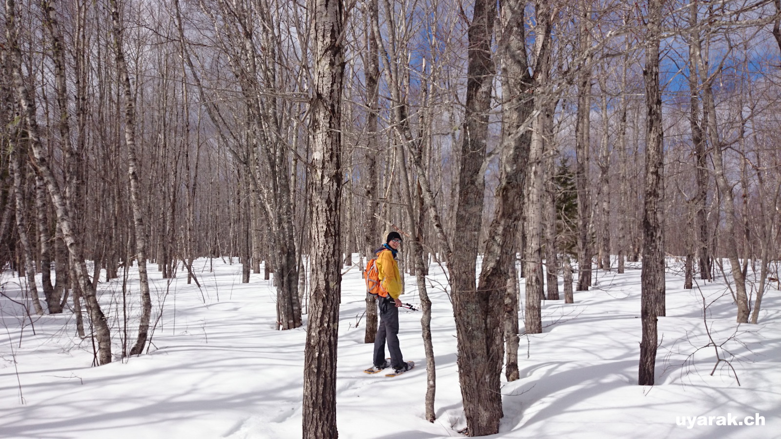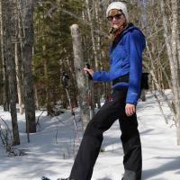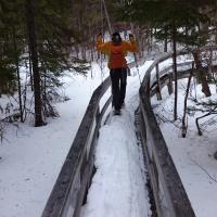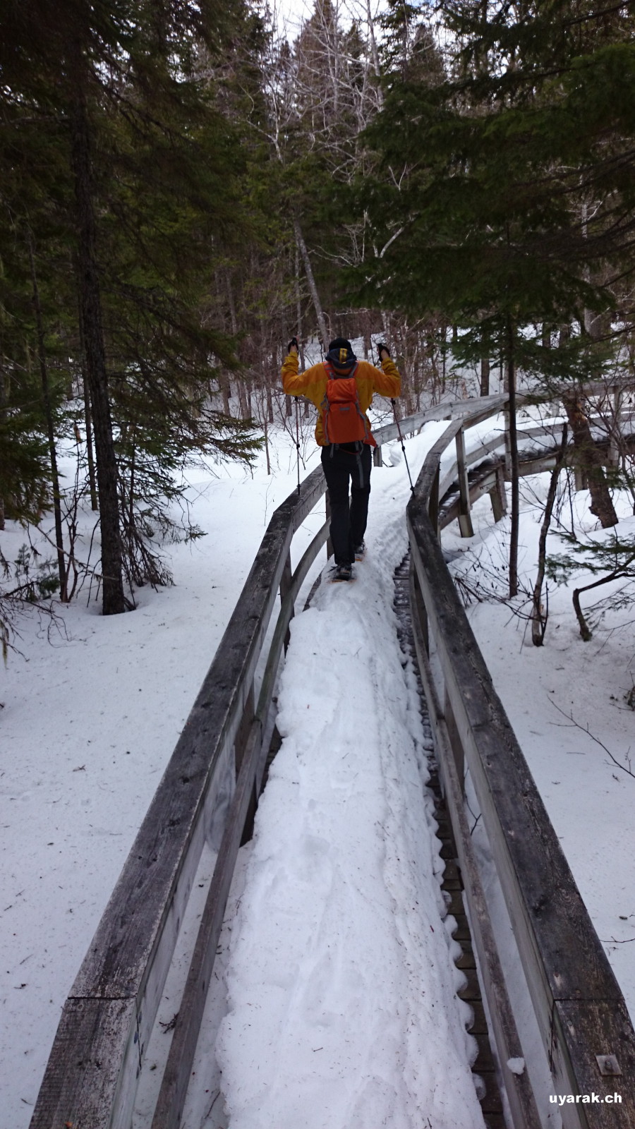 Am frühen Sonntagmorgen treffen wir im Kouchibouguac National Parc ein. Das Besucherzentrum hat wie erwartet geschlossen, doch es gibt eine gute Übersicht mit allen Wanderwegen und so geht es gleich weiter zum Ausgangspunkt der Rundwanderung Claire-Fontaine. Da auf dem Parkplatz noch ein guter Meter Schnee liegt, parkieren wir direkt an der Strasse und ziehen unsere Schneeschuhe an. Der Weg ist zum Glück relativ gut markiert, denn es sind keine Spuren im Schnee zu erkennen, wir sind die ersten seit längerer Zeit die hier durch kommen. An der Ranking Brook Bucht entdecken wir plötzlich Spuren im Schnee. Auf den ersten Blick sehen sie aus wie wenn jemand ohne Schneeschuhe quer durch den Wald gegangen wäre. Doch bei genauerem Betrachten ist zur Erkennen, dass es Spuren von einem Schwarzbären sind und dass es nicht längliche Abdrücke sind, sondern zwei runde ganz nahe beieinander. Sowohl unser Weg, als auch die Bärenspur folgt dem Ufer entlang. Während Fränzi immer wieder über die Schulter zurück blickt, suche ich nach einer guten Stelle um die zugefrohrene Flussmündung zu fotografieren. Nach rund drei Kilometer, geht der Weg über einen Holzsteg, auf welchem natürlich ebenfalls noch Schnee liegt, zwar nicht ganz so viel wie rundherum, aber er reicht noch bis zum Geländer. Ich gehe voraus und stütze mich mit den Stöcken auf dem Holzgeländer ab. Nach ein paar Metern kommt es aber wie es kommen muss, der knapp 40 cm breite Schneedamm bricht unter meinen Schneeschuhen weg, ich lande auf dem Hintern und mein Wanderstock knickt dabei ab. Den Rest des Steges gehen wir dann mehr oder weniger auf allen vieren, so dass wir uns mit den Händen auf dem Geländer abstützen können. Am Nachmittag fahren wir noch nach Miramichi und dann weiter der Küste entlang. Auf der Suche nach einem Übernachtungsplatz fahren wir auf Hay Island, welche mit einem Damm und einer Brücke mit dem Festland verbunden ist. Sowohl auf dem Damm als auch auf der Brücke liegt jedoch noch sehr viel Schnee und es hat erst wenige, dafür sehr tiefe Spuren. Langsam hangeln wir uns durch die Schneemassen bis zur Insel, doch hier ist entgültig fertig, zu viel Schnee. Wir müssen umkehren und fahren noch etwas weiter der Küste entlang bis Tracadie wo wir direkt am Meer ein Plätzchen finden.