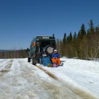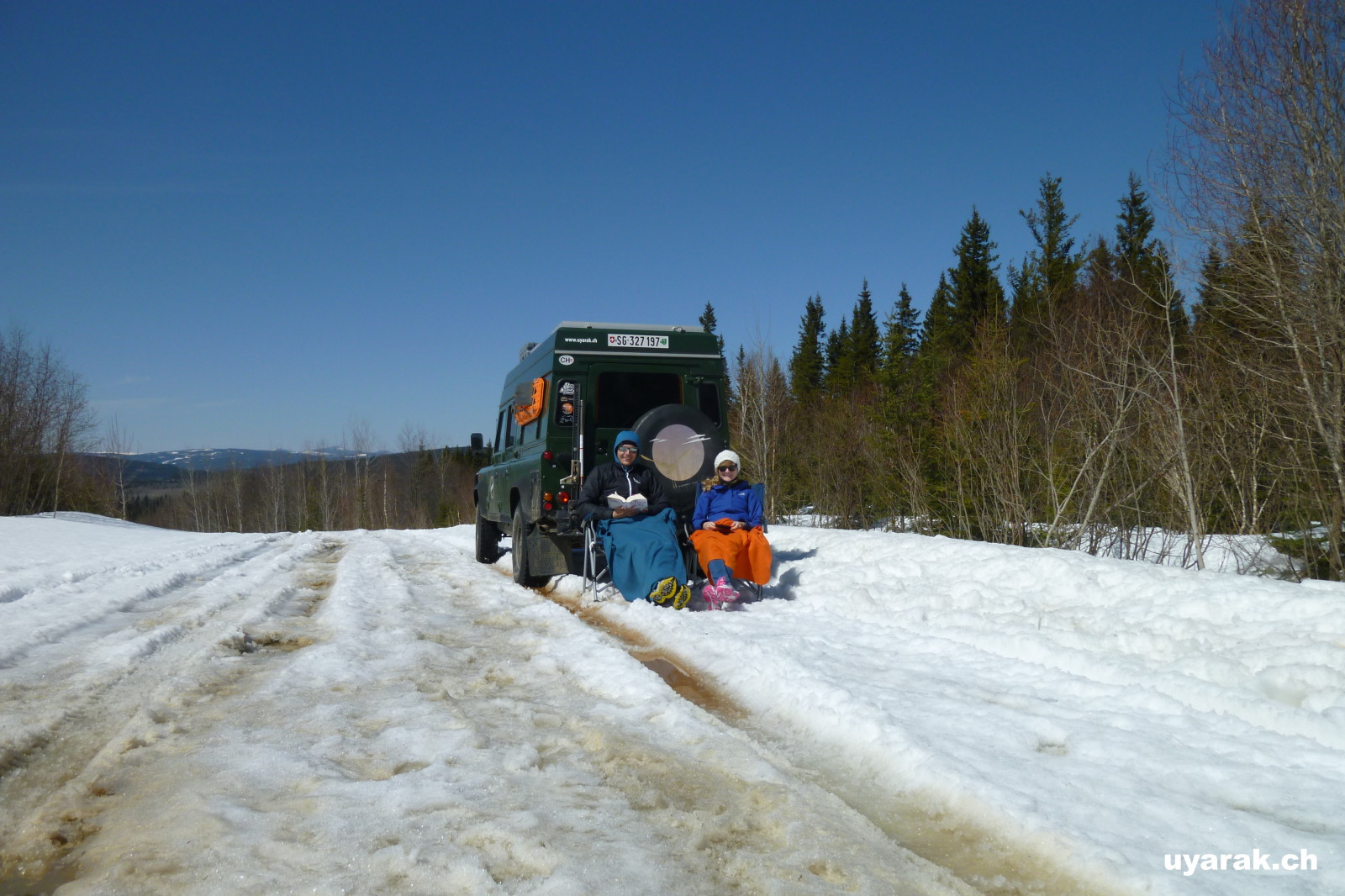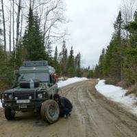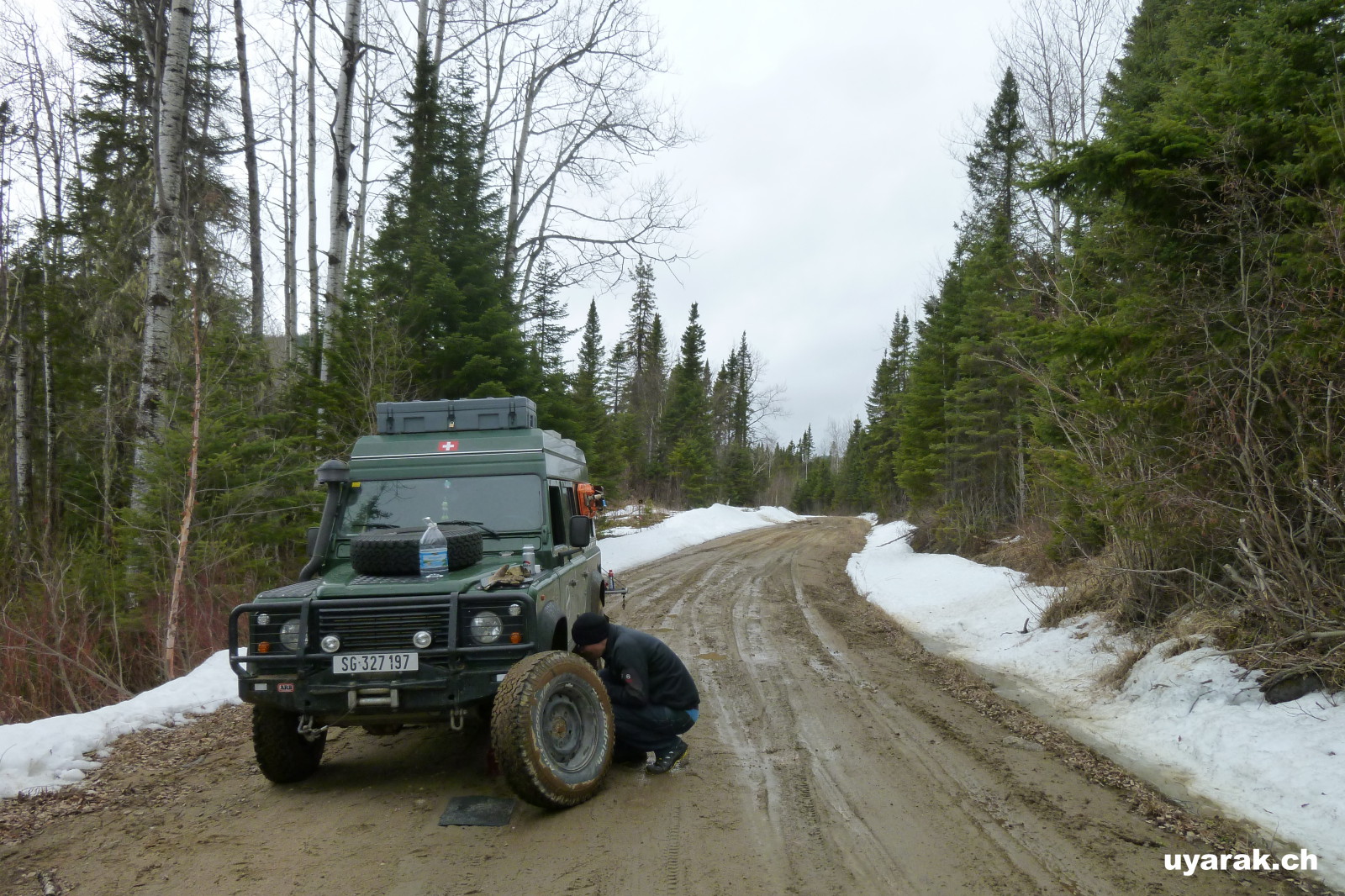 Auf dem Highway 381 fahren wir am Dienstag wieder zurück Richtung Süden. Fränzi entdeckt plötzlich eine schneefreie Schotterpiste, welche nach Osten zum Parc National des Hautes-Gorges-de-la-Rivière-Malbaie führt. Leider steht da aber auch ein Schild "Parc fermé". Wir entschliessen uns die Piste zu nutzen, um einen ruhigen Platz für die Nacht zu suchen. Wir folgen also dem schlammigen Weg ins Nirgendwo. Wählerisch wie wir sind, haben wir auch nach 8 km noch keinen "geeigneten" Platz gefunden. Etwas abgelenkt vom Suchen übersehe ich wie sumpfig die Wegstelle vor uns ist und schon steckt Uyarak bis zu den Achsen im Dreck. Mit Mühe und Not kommen wir gerade wieder so heraus ohne Schaufeln zu müssen. Schwein gehabt denke ich und fahre weiter, doch es quietscht fürchterlich und ich bleibe sofort wieder stehen. Fränzi steigt aus und lokalisiert die Quelle: linkes Vorderrad. Dem Ton nach klemmt irgendetwas in den Bremsen, für eine genauere Beurteilung muss das Rad weg. Zu allem Pech fängt es auch noch zu regnen an. Ich hebe Uyarak an der Vorderachse an und versuche dabei nicht allzu dreckig zu werden. Kaum ist das Rad weg, ist der Grund schnell gefunden, ein Stein klemmt zwischen der Bremsscheibe und dem dazugehörigen Schutzblech. Stein raus, alles abspühlen, Rad wieder dran und es kann weitergehen. Da wir für heute genug Abenteuer hatten, kehren wir um, suchen uns einen Übernachtungsplatz und kochen Abendessen.