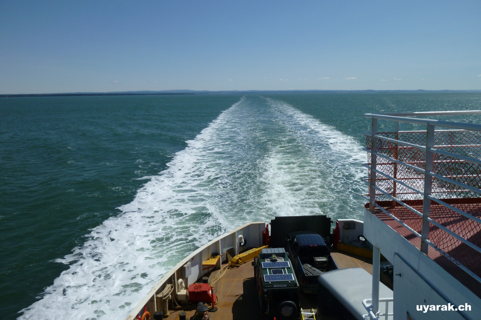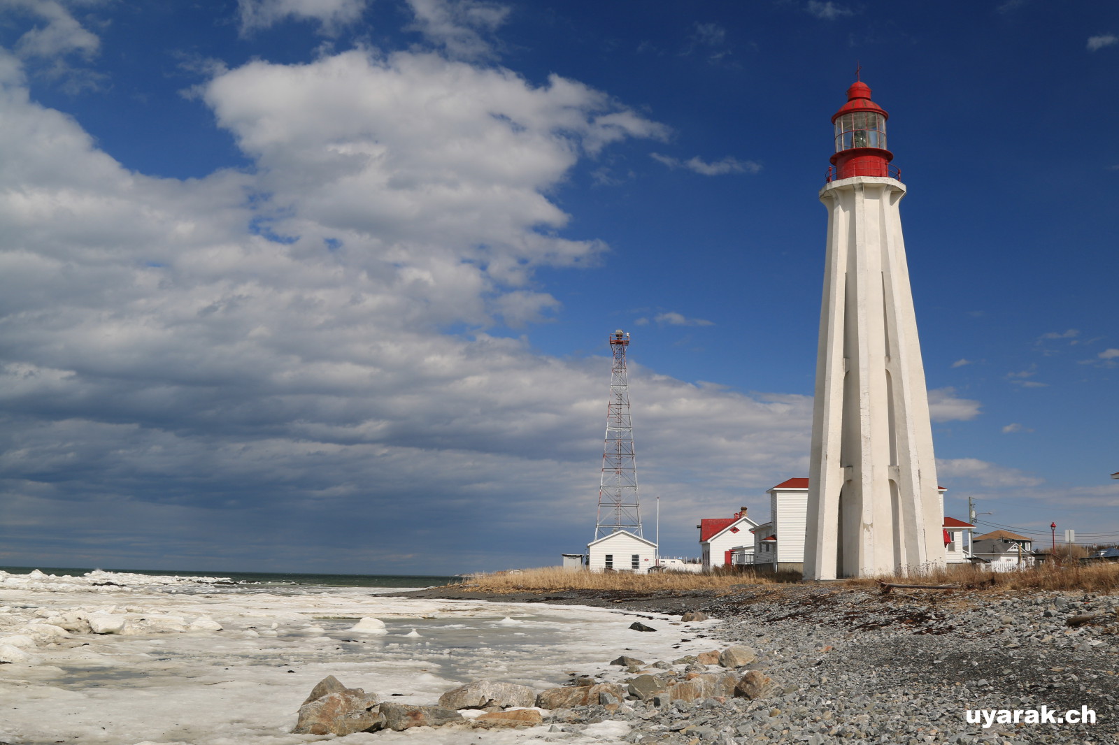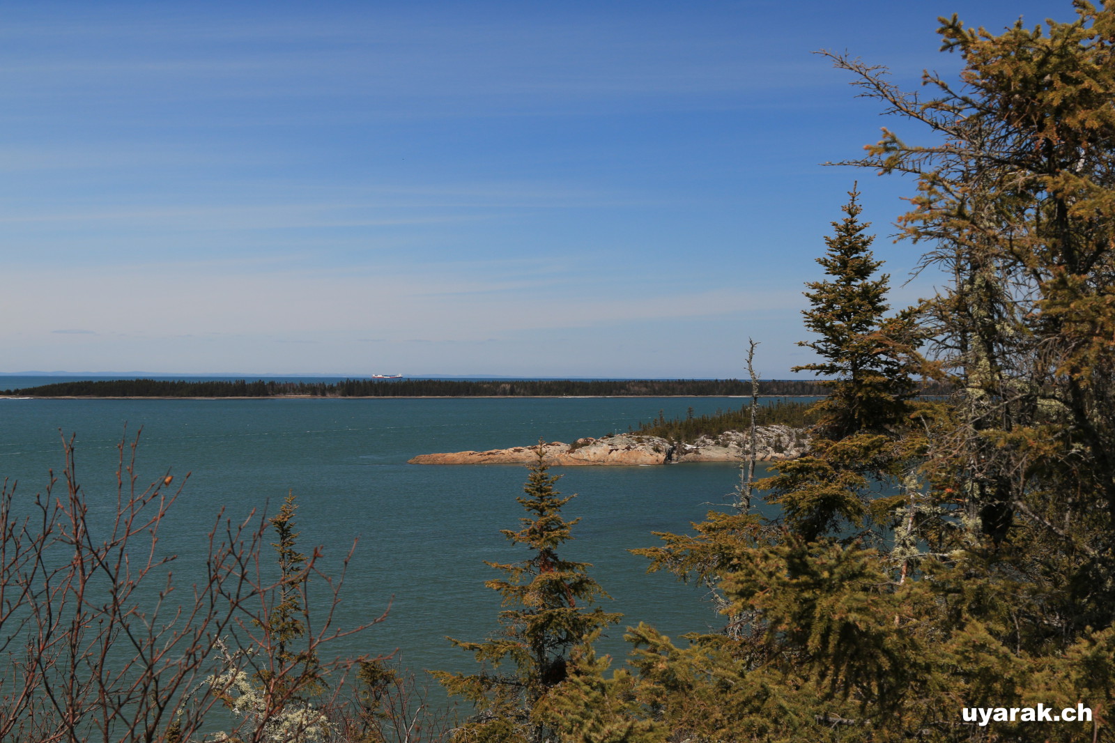 Unser Plan, den Sankt-Lorenz-Strom bei Matane mit der Fähre zu überqueren scheitert, da die Fähre nur ganz früh am Morgen fährt und es bereits Mittag ist bis wir da eintreffen. Kurzum entschliessen wir, noch etwas länger dem Südufer zu folgen und erst in Rimouski überzusetzen. Auf der Küstenstrasse herscht wenig Verkehr und wir können immer wieder stoppen und den herrlichen Blick über den Sankt-Lorenz-Strom geniessen. Da dieser hier aber gut 50 km breit ist, ist vom nördlichen Ufer nicht viel zu erkennen. Kurz vor Rimouski quartieren wir uns spontan in einem Motel ein. Für gerade einem 50 C$ bekommen wir ein ganzes Häuschen für uns allein. Etwas weniger Glück haben wir dann am Hafen. Damit wir am nächsten Morgen sicher nicht zu spät sind, wollen wir kurz die Abfahrtszeiten am Hafen kontrollieren. Auf der Abfahrtstafel steht aber gross "Hauteur du véhicule 2.14 m au maximum", Uyarak misst aber ohne Dachbox bereits 2.28 m. Ausserdem fährt diese Fähre erst ab dem 14. Mai. Tja Pech gehabt, aber es gibt ja noch eine Fähre in Trois-Pistoles. Wir geniessen den späteren Nachmittag bei einem Spaziergang dem Strand und beobachten einen Kitesurfer, welcher sich von den Eisschollen am Strand und der entsprechenden Wassertemperatur nicht abschrecken lässt. Bei Pointe-au-Père können wir noch ein altes U-Boot fotografieren bevor es zurück zum Motel geht.