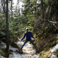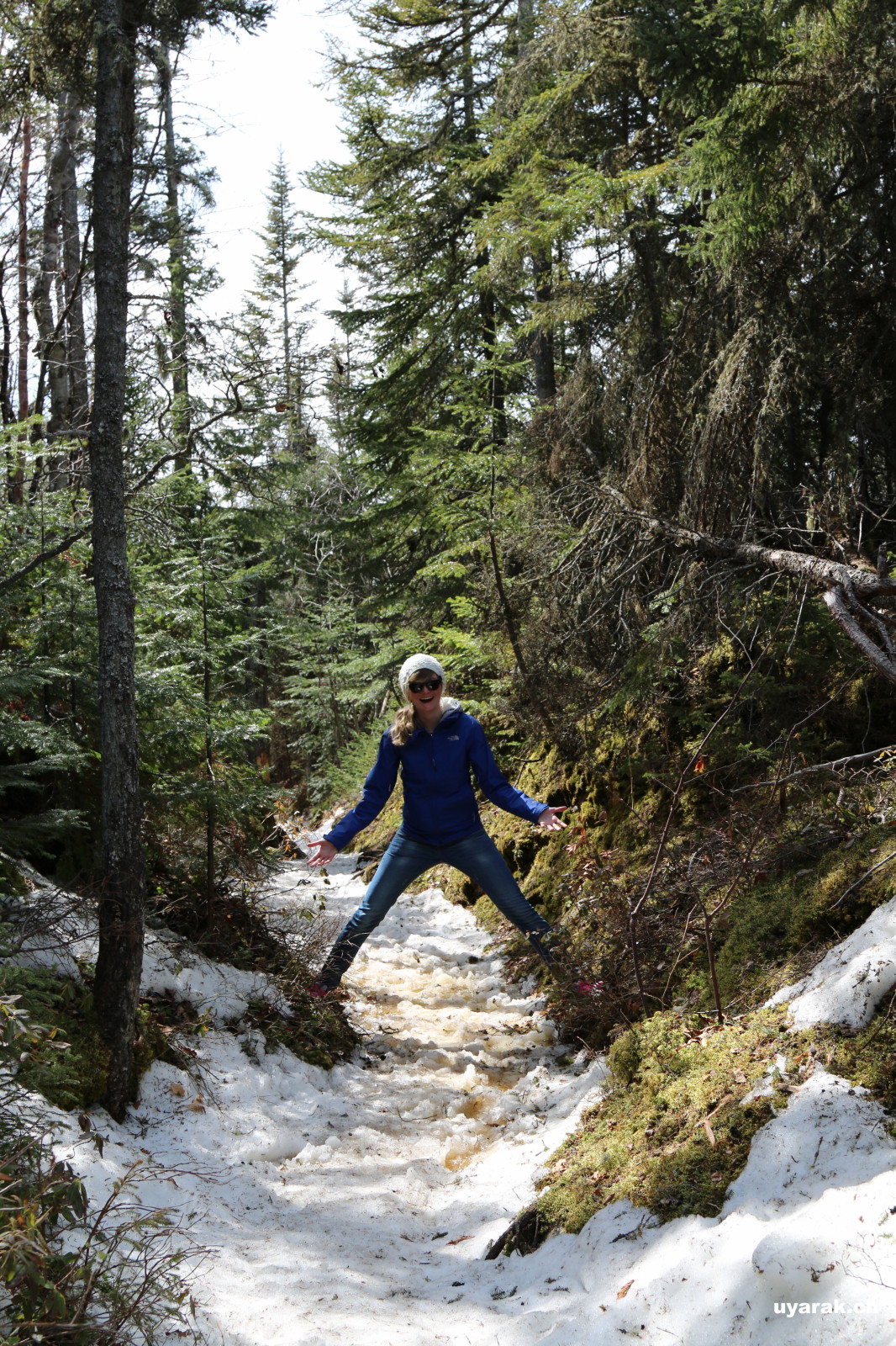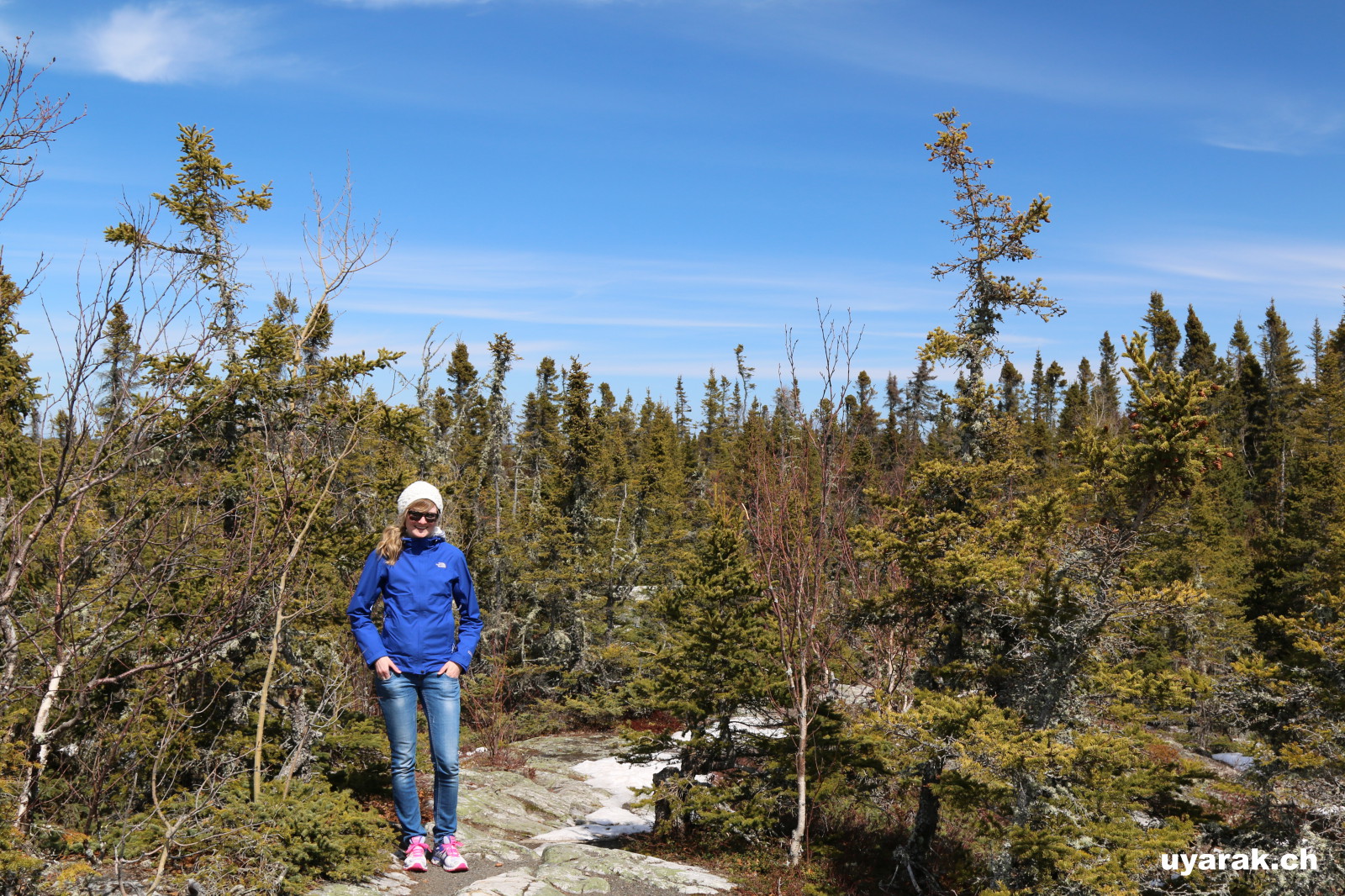 Der Besuch im Parc de la Gaspésie erinnert uns an den Kejimkujik National Park in Nova Scotia. Auch hier endet die Stasse nach wenigen Metern unter einer meterdicken Schneeschicht. Wir packen also unsere Schneeschuhe ein und folgen dem ausgeschilderten Rundweg. Da der Schnee am Vormittag noch fest gefroren ist, können die Schneeschuhe im Rucksack bleiben und wir kommen gut voran. Während Fränzi sich als Spurenleserin versucht, beginnt der Schnee allmählich aufzutauen. So kommt es, dass wir auf dem Rückweg hin und wieder bis zur Hüfte im Schnee stecken bleiben.