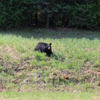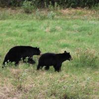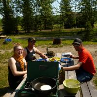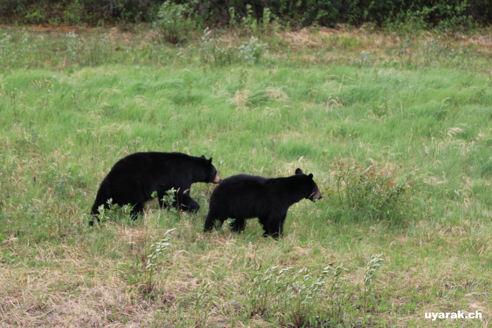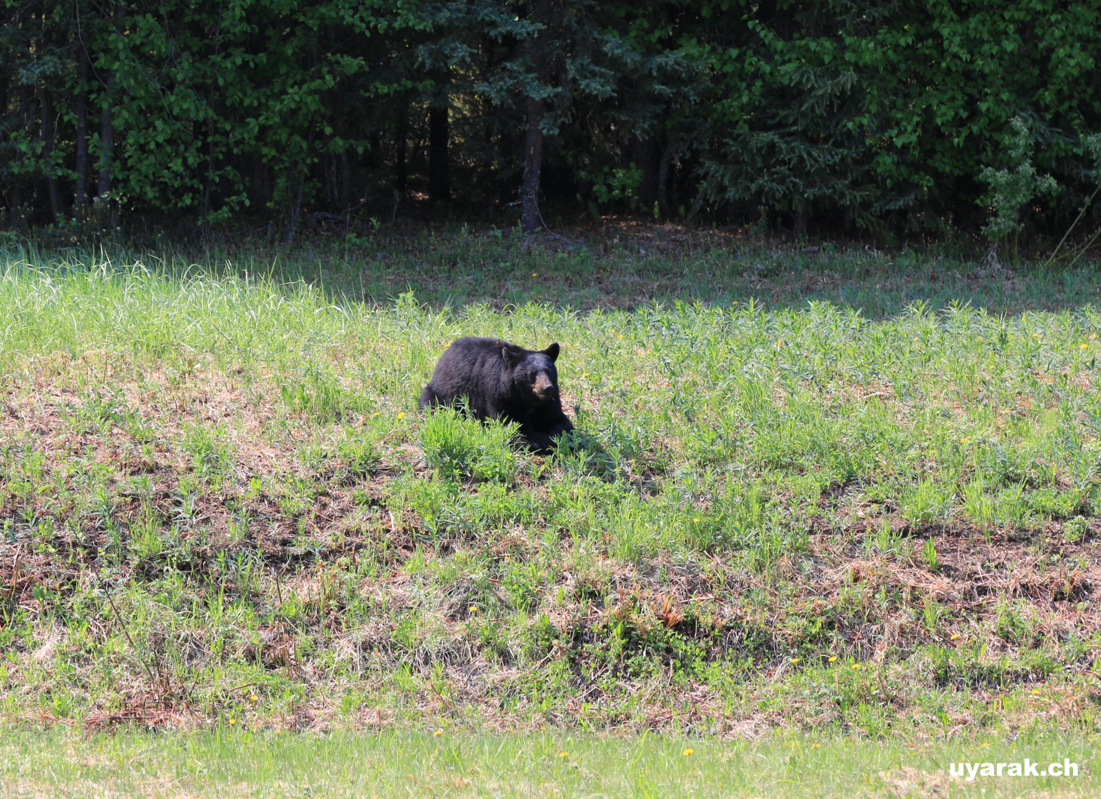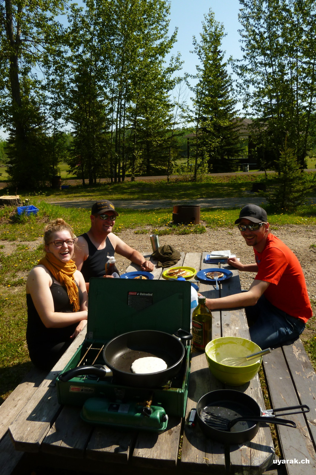 Dank Uyarak komme ich schnell mit unserem Nachbarn Chris ins Gespräch und er lädt uns ein, später doch auf ein Bier vorbeizukommen. Da uns sowohl das Bier als auch die Chips ausgegangen sind - Einkaufen war in Dawson Creek geplant - schleichen wir im Verlauf des Abends mit einer Flasche Whisky und Fränzis Riesentoblerone rüber zu den anderen. Zusammen mit Chris, seiner Freundin Lindsey und seinem Arbeitskollegen Eric sitzen wir gemütlich ums Lagerfeuer, plaudern und trinken Bier, Whisky und Summersby. Nur Lindsey muss verzichten, denn sie ist im 6. Monat schwanger. Insgesamt ein äusserst lustiger Abend, den wir sehr geniessen. Als wir uns dann gegen halb eins auf den Weg ins Bett machen wollen, weisst uns Lindsey darauf hin, dass es doch erst halb zwölf sei. Wir hatten wiedermal vergessen unsere Uhren umzustellen.