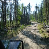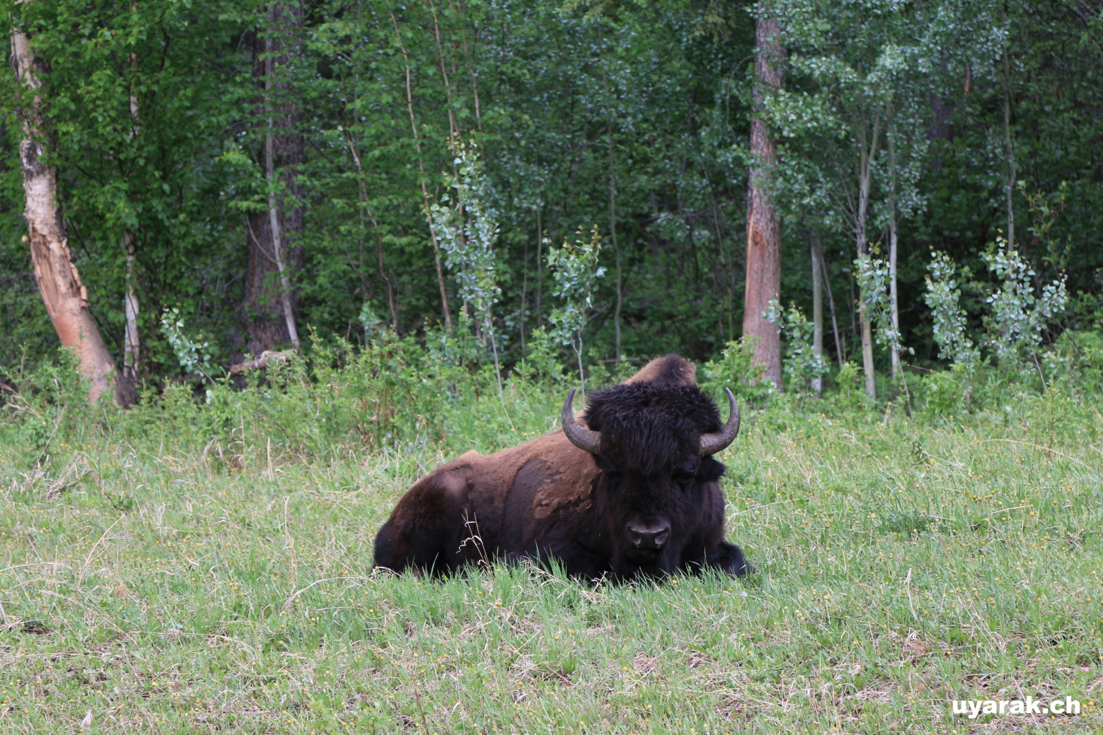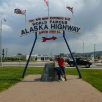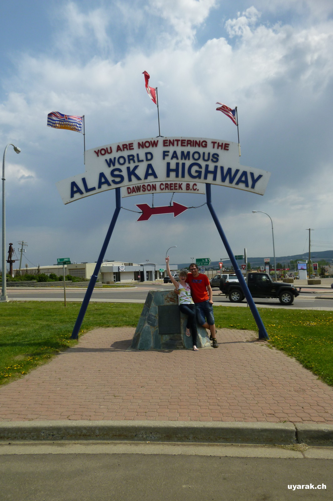 Nach einem ausgiebigen Frühstück verabschieden wir uns am Sonntagmorgen (25. Mai) und fahren nach Dawson Creek zum Milestone 0 des legendären Alaska Highways. Der 2288 km lange Highway wurde ab 1942 von den Amerikanern innert kürzester Zeit gebaut. Grund für den Bau war der Angriff der Japaner auf die Aleuten und die daraus folgende Erkenntnis der Amerikanischen Streitkräfte, dass Alaska ohne Strassenanbindung kaum zu verteidigen ist. Eine erste durchgängige Piste wurde nach nur 8 Monaten fertiggestellt. Dazu waren bis zu 11'000 Mann im Einsatz. Anschliessend wurde die noch sehr rudimentäre Piste zu einer ganzjährig befahrbaren Strasse ausgebaut. Die ursprünglich ausschliesslich für militärische Verwendung gebaute Strecke, ist seit 1948 für jeden befahrbar.