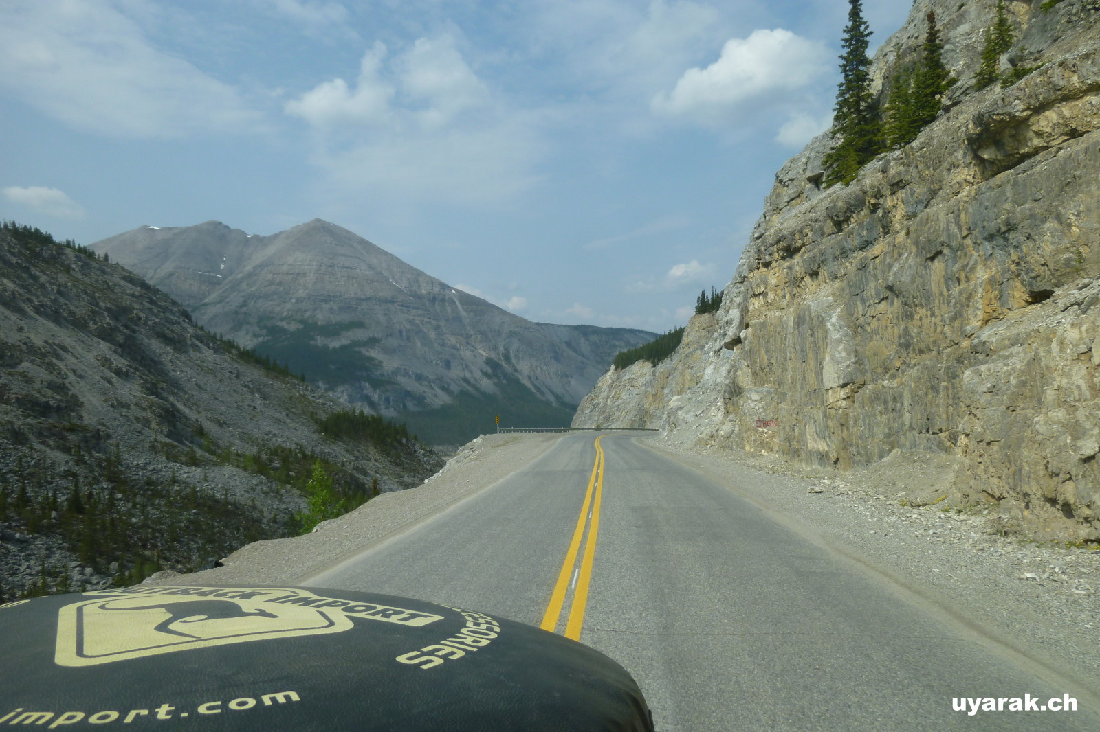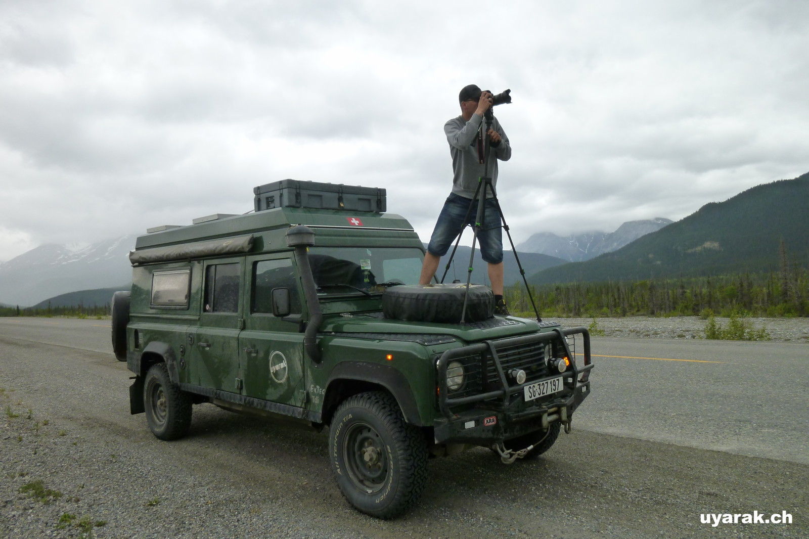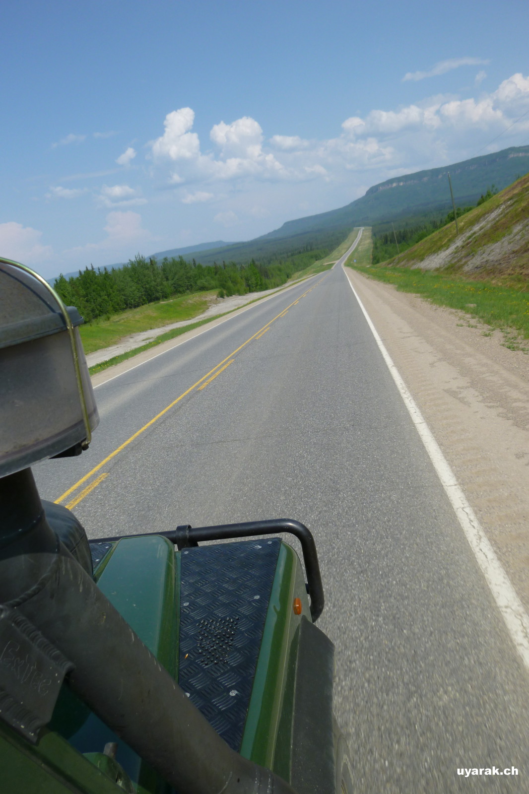 Vollgetankt und mit genügend Vorräten ausgestattet fahren wir auf der geschichtsträchtigen Strasse los Richtung Yukon. Der erste Teil der Stecke verläuft wenig spektakulär durch kleine Siedlungen, vorbei an Farmen und alten Ölpumpen. Nach Fort St. John wird der Verkehr weniger und die Strasse führt gemütlich über kleinere Hügel und durch riesige Wälder. Richtig spektakulär wird es dann nach Fort Nelson, hier geht es auf die kanadischen Rocky Mountains zu. Die Strasse folgt kleinen Tälern, führt über Pässe und an hohen Bergen und tiefblauen Seen vorbei. Das Wetter spielt mit und wir können die atemberaubende Aussicht so richtig geniessen.