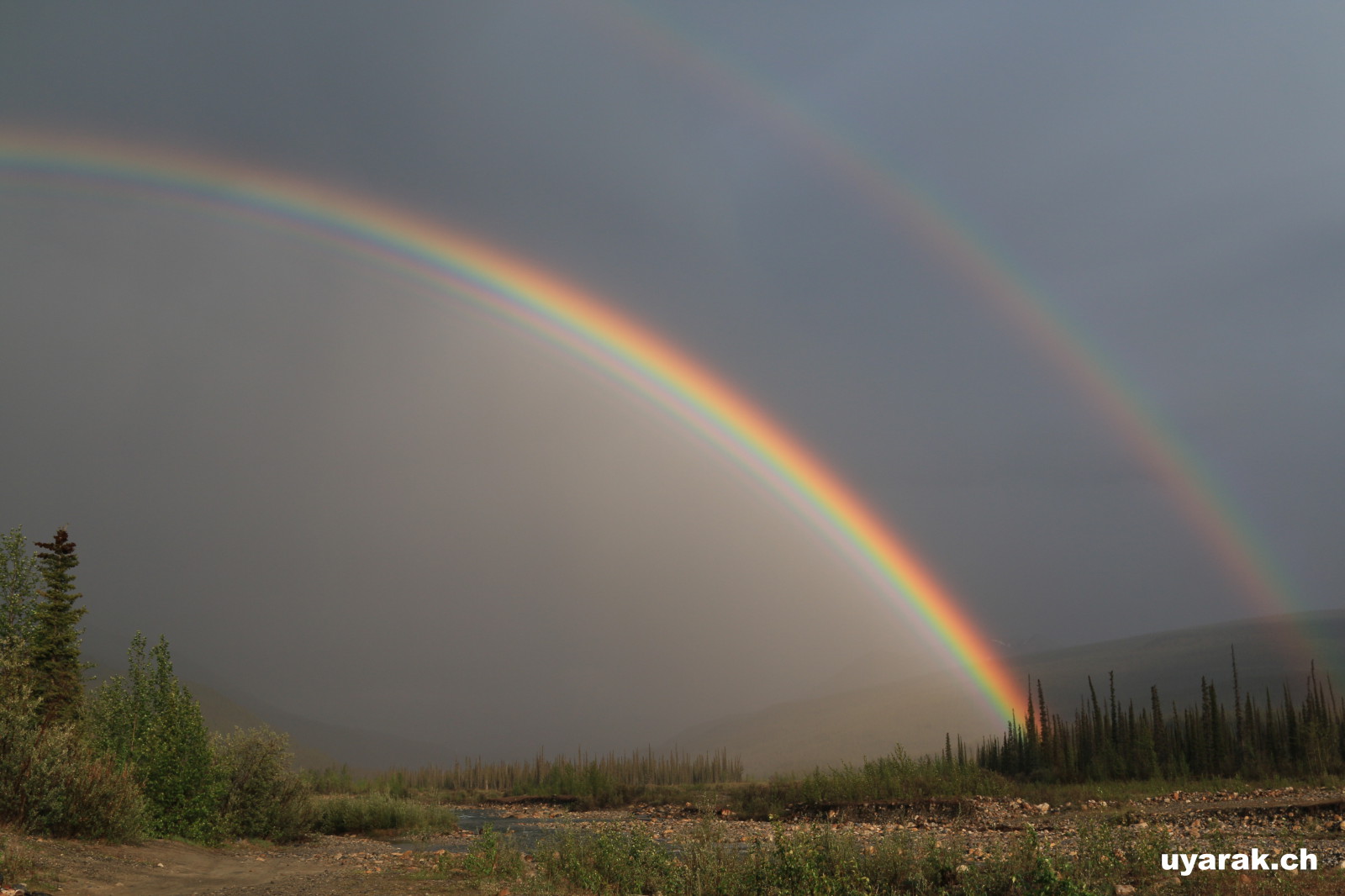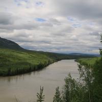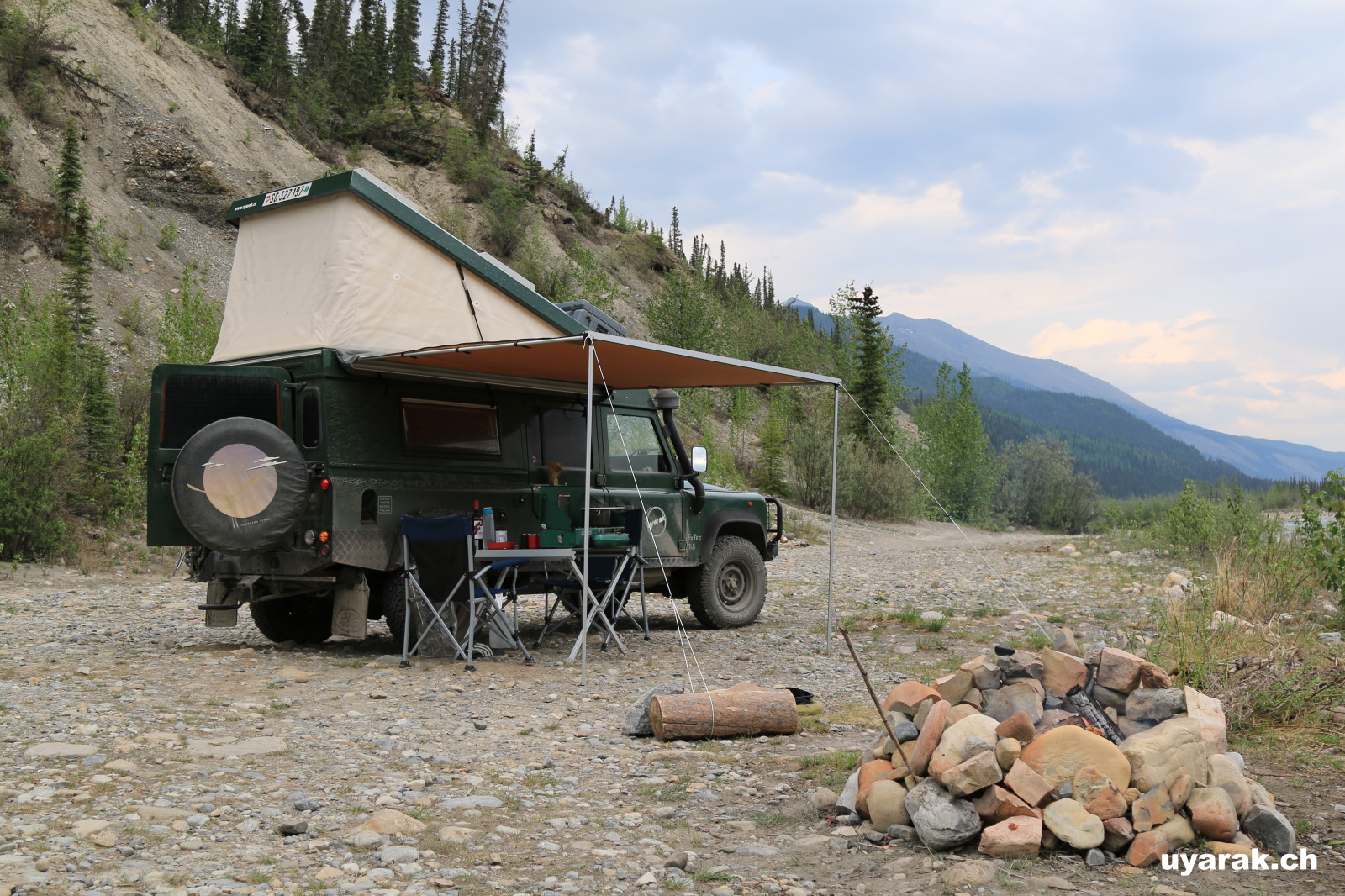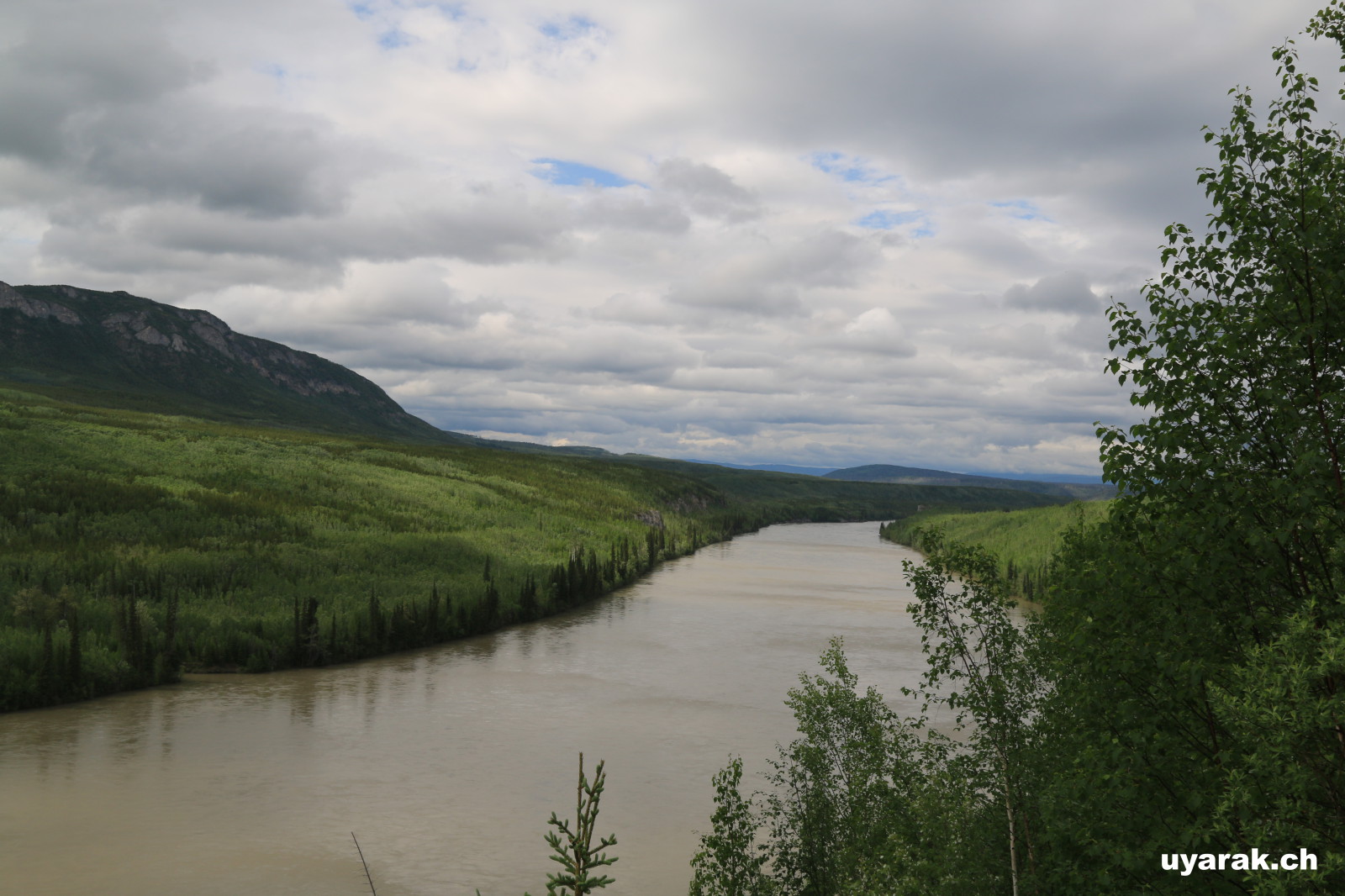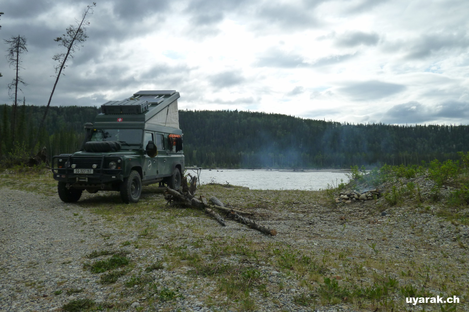 Wenige Kilometer vor der Grenze zum Yukon Territory überquert der Highway den Hyland River. Direkt nach der Brücke führt ein schmaler Kiesweg am Fluss entlang von der Strasse weg. Ein möglicher Übernachtungsplatz? Neugierig folgen wir dem Weg durch den Wald. Ein paar umgefallene Bäume, kleine Überschwemmungen, steinige und sumpfige Stellen machen die Fahrt interessant. Nach etwa 3.5 km kommen wir an eine grosse Flussschleife und richten uns für die Nacht ein. Bei stürmischem Wetter und gerade mal 12 Grad ist uns nicht nach Lesen am Lagerfeuer und so gibt es einen gemütlichen Film-Abend.