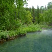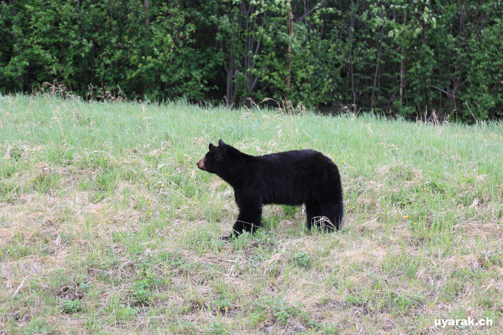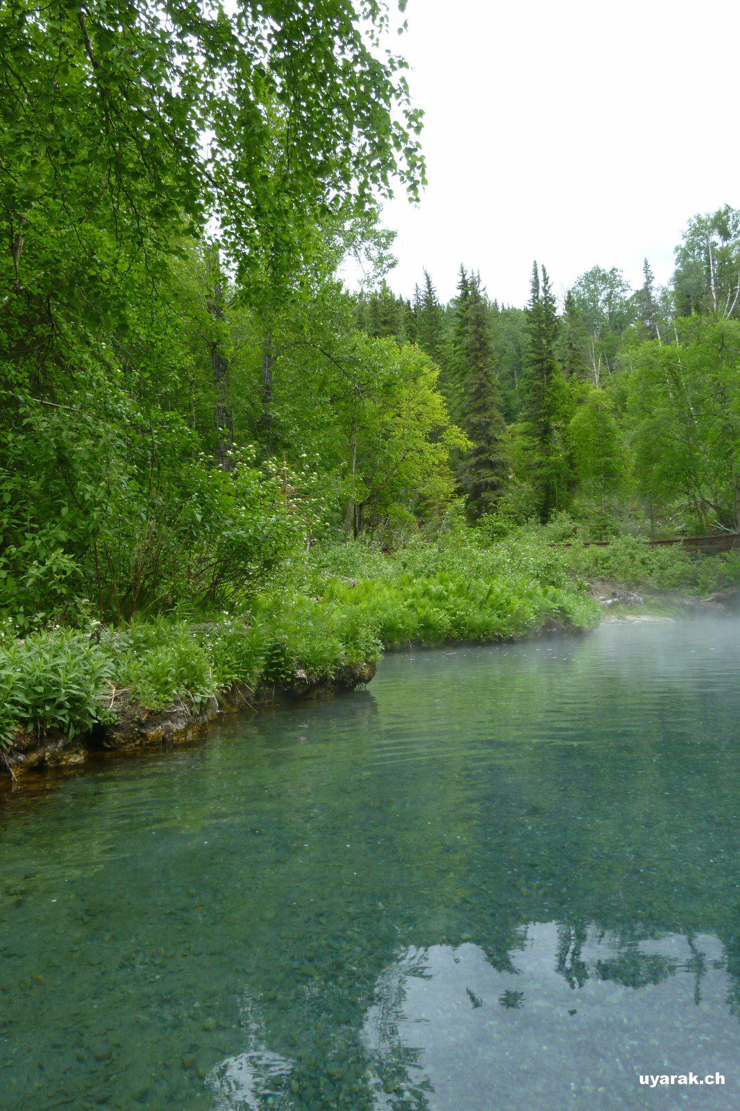Der nächste Tag begrüsst uns regnerisch und kalt, stört uns aber nicht wirklich denn heute geht es zu den heissen Quellen bei Liard River. Fränzi packt bereits nach dem Frühstück einen Rucksack mit den Badesachen und fragt mich was ich denn anziehen wolle. Ups. Als wir gepackt haben hatte ich entschlossen meine alte Badehose zu entsorgen und mir dann in Kanada eine neue zu kaufen. Was ich bisher natürlich noch nicht geschafft habe... Egal, muss halt eine andere Hose herhalten. Gegen Mittag erreichen wir dann den Liard River Hot Springs Provincial Park und geniessen ein Bad im Naturpool. Je nach Entfernung zur Quelle liegt die Wassertemperatur zwischen 35 und 52 Grad Celsius. Nach zwei Stunden sind wir gar und fahren weiter Richtung Norden.