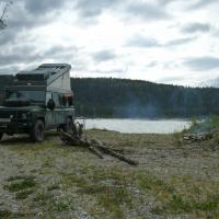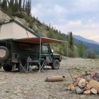 Am frühen Nachmittag unseres zweiten Tages auf dem Alaska Highway durchqueren wir den Stone Mountain Provincial Park der uns mit seiner kargen, felsigen Landschaft sehr gut gefällt. Wir suchen uns daher bereits sehr früh ein schönes Plätzchen zum Übernachten. Ein schmaler Kiesweg führt uns etwa einen halben Kilometer weg vom Highway und nachdem wir einen abgerutschten Hang überquert haben stehen wir direkt am Mc Donald Creek. Der Weg führt durch den Fluss hindurch und verschwindet auf der anderen Seite im Gebüsch. Wir überlegen uns, ob wir durchfahren oder hier bleiben sollen. Zu Fuss wate ich durch das eiskalte Wasser und sehe mir das gegenüberliegende Ufer an. Die Wassertiefe ist mit 50 cm kein Problem, die Ausfahrt aus dem Flussbett ist jedoch sehr steil und erfordert einiges an Bodenfreiheit. Wir entschliessen uns kein Risiko einzugehen und richten uns auf dieser Seite des Flusses gemütlich ein. Hubdach auf, Sonnenstore raus, Tisch und Stühle aufstellen, Feuerstelle einrichten, Feuerholz suchen, Feuer machen und dann gemütlich ein Buch lesen - schon ist der Nachmittag um. Zwischendurch gibt es noch eine lustige Tanzeinlage von Fränzi, denn ein 3 cm grosser Käfer hat sich in ihren Pullover verirrt.
