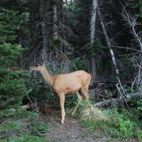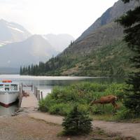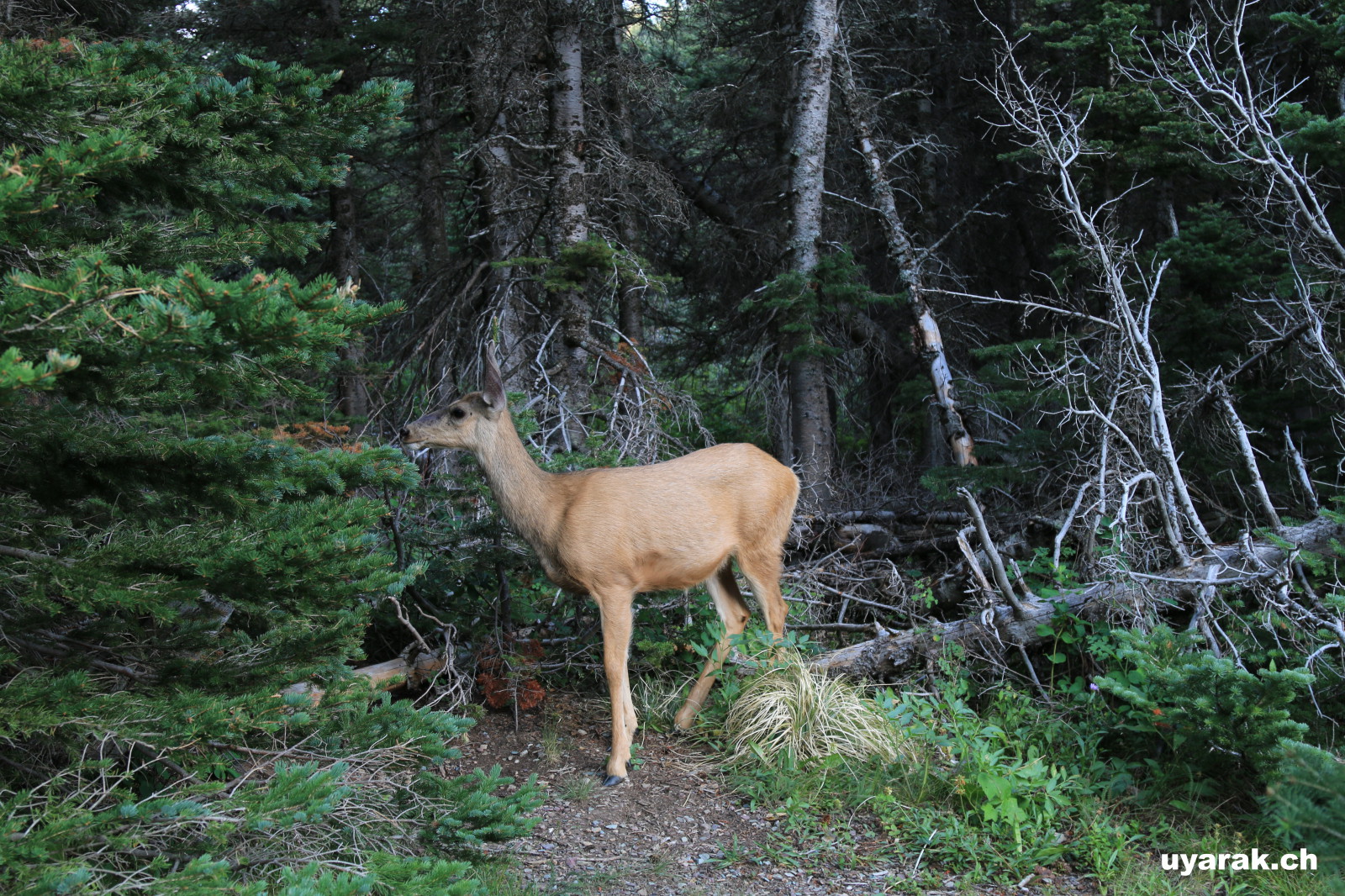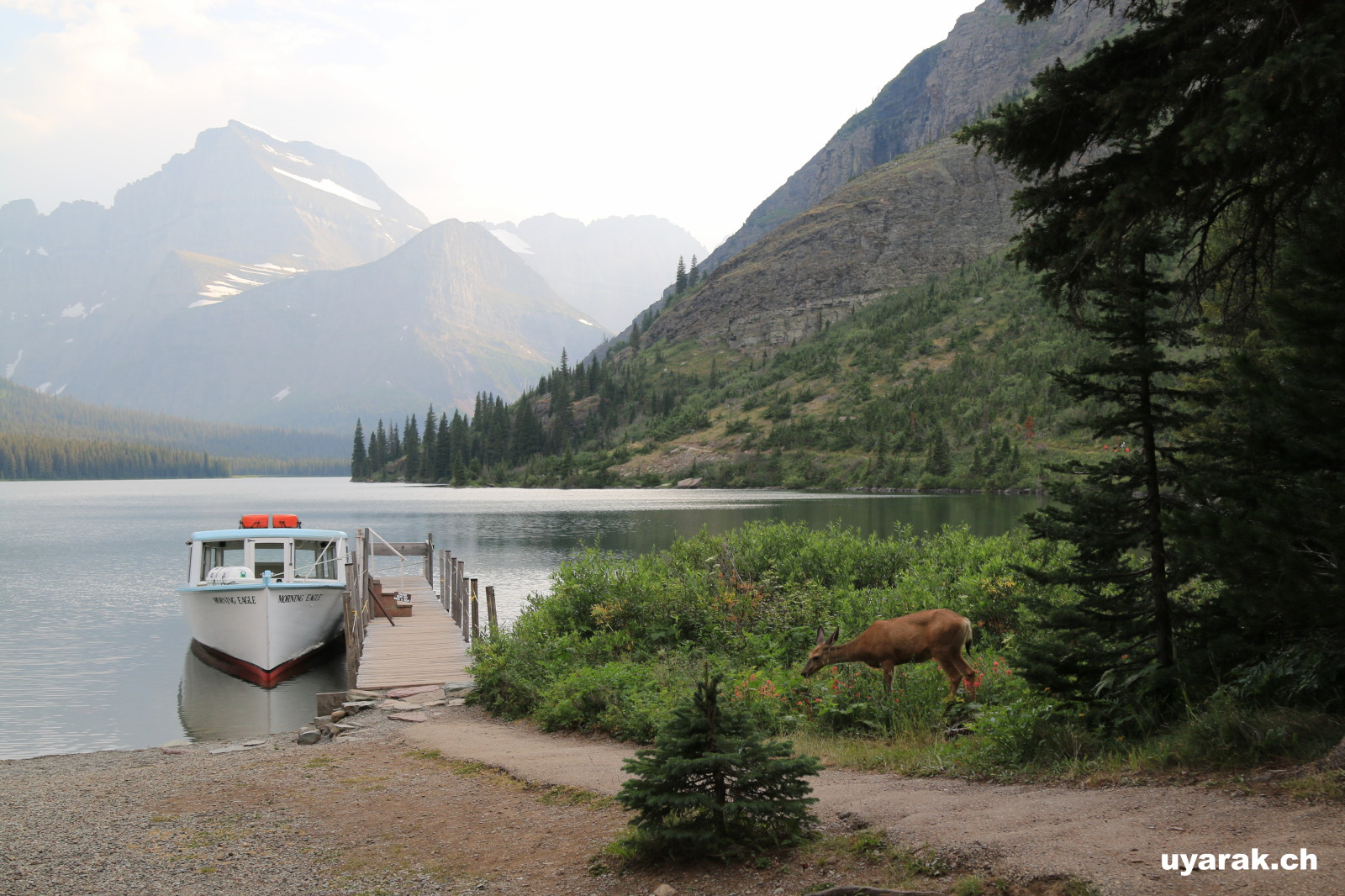 Bei Many Glacier kaufen wir uns gleich den Discovery Pass welcher uns erlaubt ein Jahr lang alle Nationalparks der USA zu besuchen. Obwohl es bereits später Nachmittag ist, entschliessen wir uns noch eine kleine Wanderung zu machen und so spazieren wir gemütlich zum Lake Josephine hoch. Mit meinem neuen Feldstecher halte ich Ausschau nach Wildtieren - mit wenig Erfolg. Einzig einen jungen Hirsch entdecken wir. Da er aber nicht mal 5 m von uns weg ist, packen wir das Fernglas wieder ein.