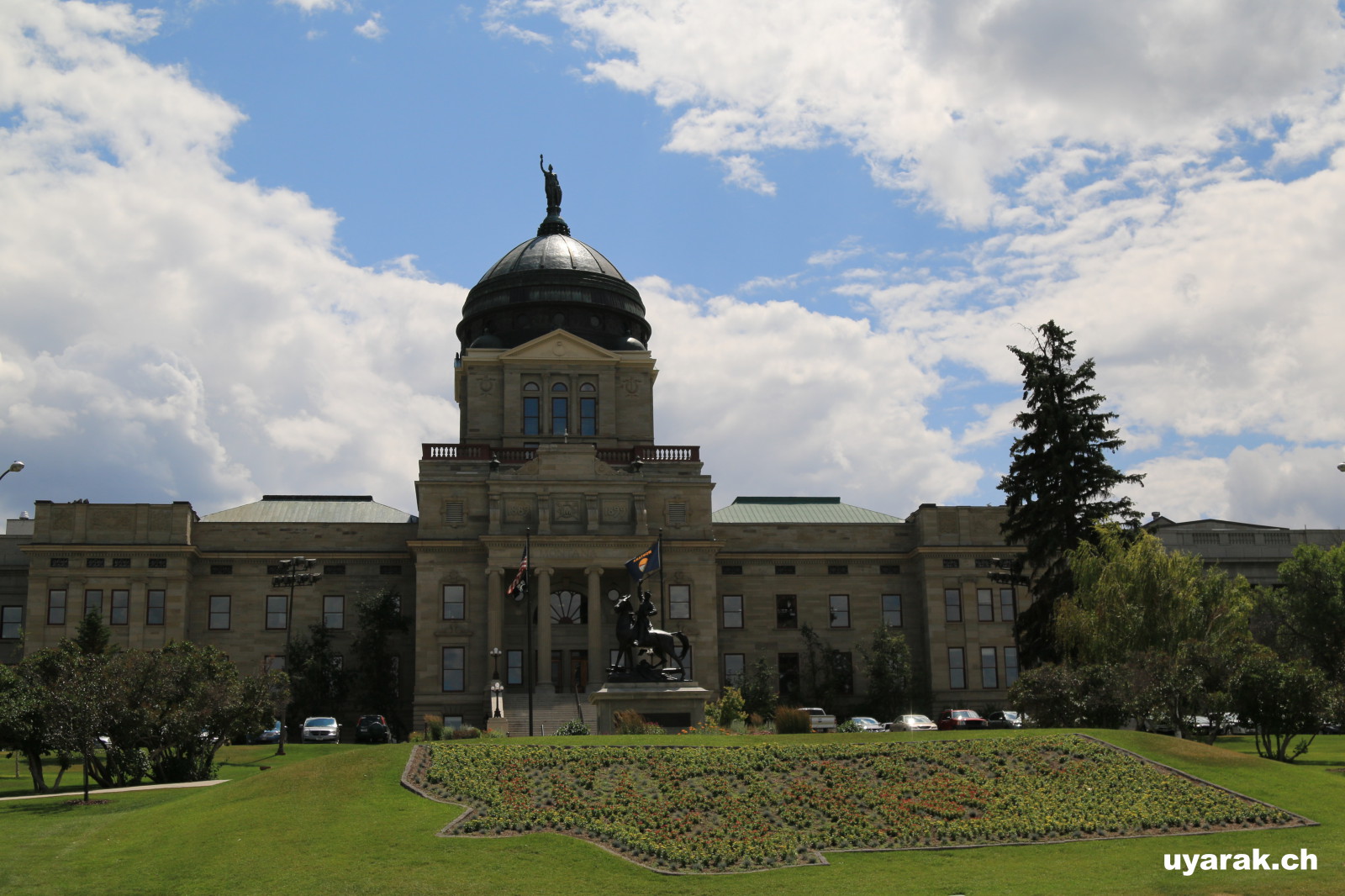 Durch den Flathead National Forest fahren wir nach Helena (Hauptstadt von Montana). Trotz 28'000 Einwohnern ein relativ verschlafenes Nest. Wir machen es uns auf einem Campingplatz gut 4 Meilen nördlich vom Stadtzentrum gemütlich und wollen einen Tag in der Stadt verbringen. Die Öffentlichen Verkehrsmittel in Helena beschränken sich auf eine einzige Buslinie - ein Rundkurs durch die Stadt. Wenigstens ist eine Fahrt mit 87 Cent sehr günstig. Doch als wir nach gut 2.5 Meilen Fussmarsch an der nördlichsten Haltestelle - bei einem grossen Einkaufszentrum stehen - fährt kein Bus. Genauer gesagt finden wir nicht mal eine Haltestelle. Wir geben es nach einer Weile auf und legen auch noch den Rest des Weges zu Fuss zurück.
