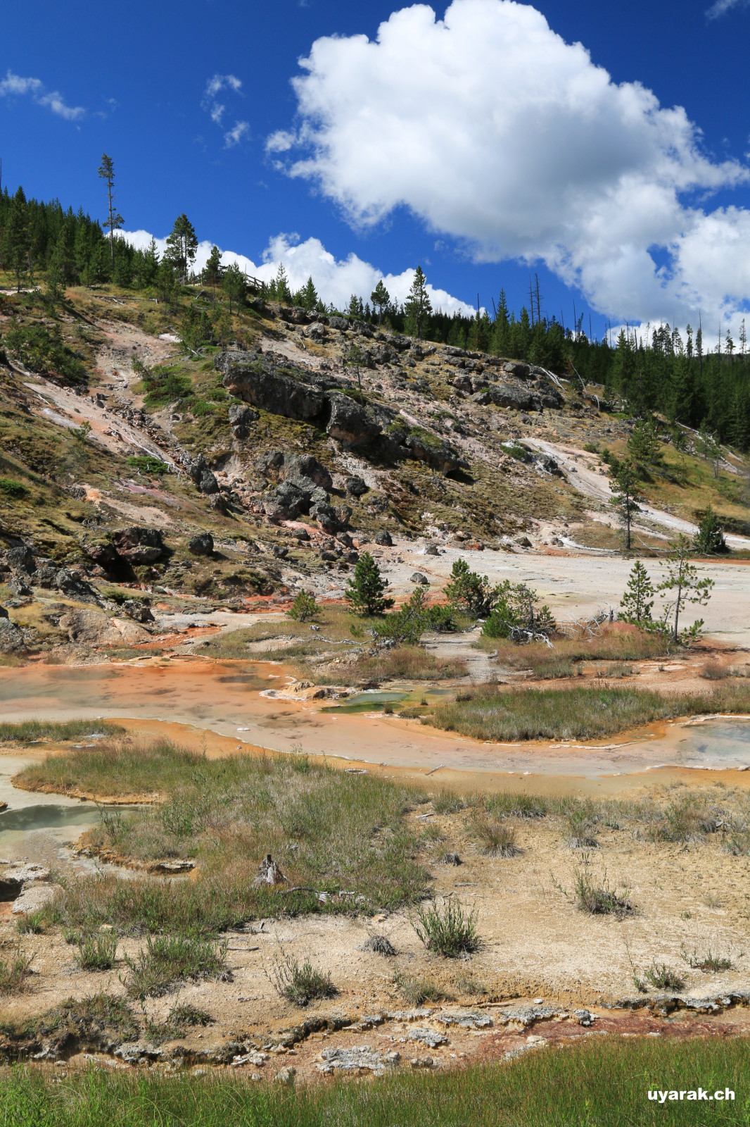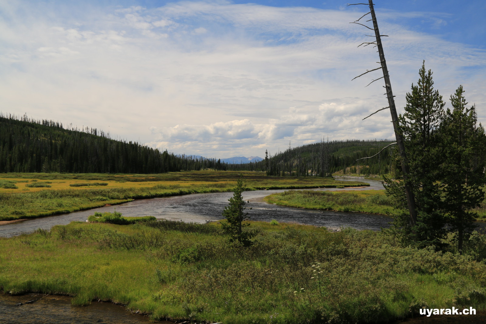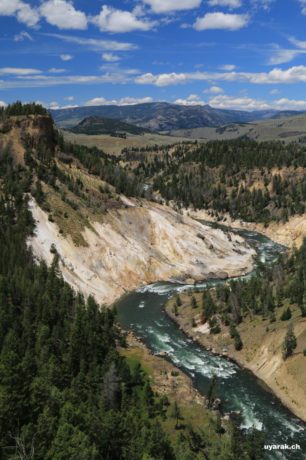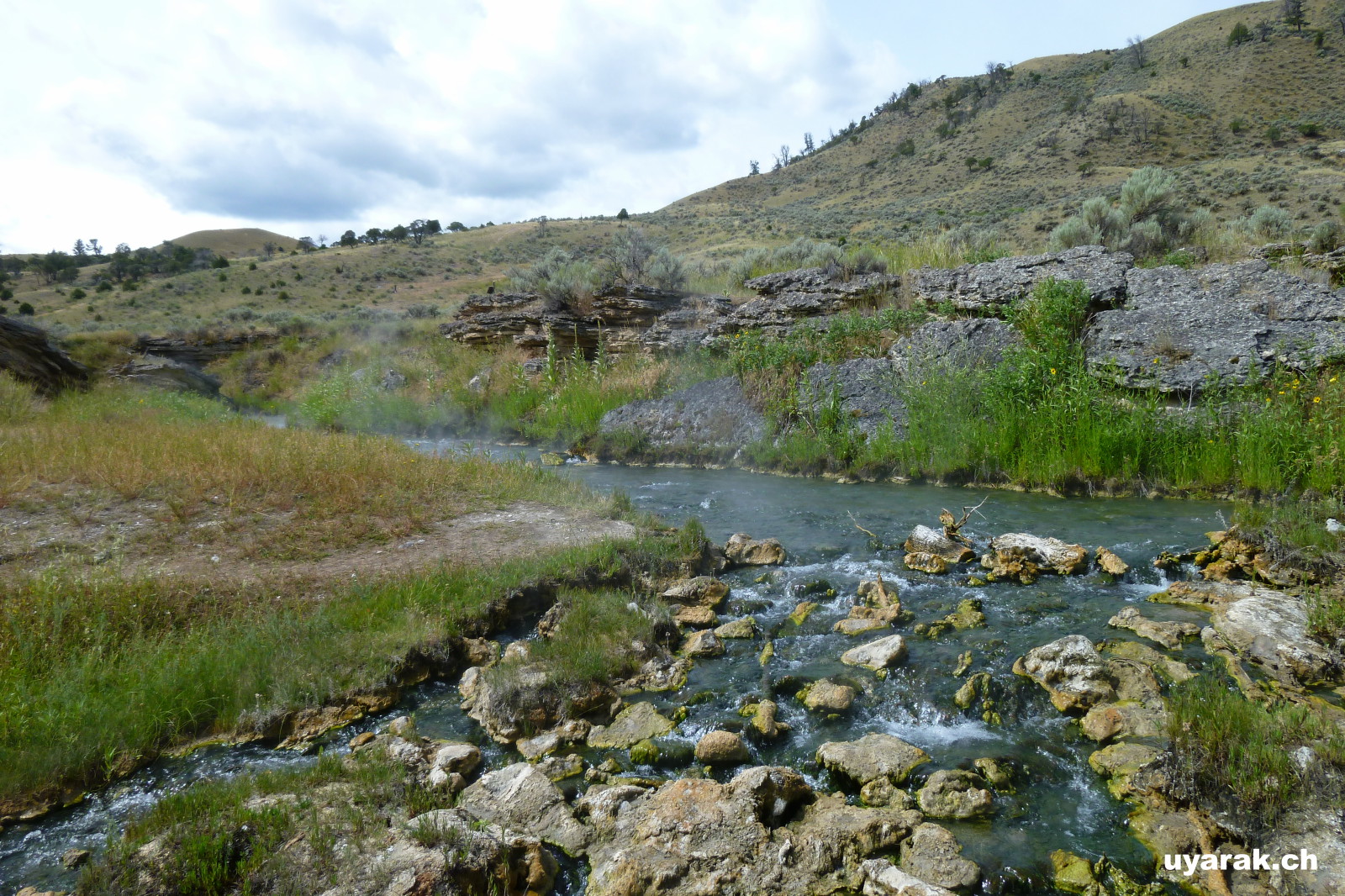 Der Yellowstone Nationalpark ist der älteste Nationalpark der Welt (gegründet 1872) und bekannt für seine Geysire und geothermalen Quellen. Mit 8987 km2 ist er ausserdem einer der grössten in den USA und es gibt einiges zu sehen. Fränzis Tageshighlight ist das Baden im Boiling River. Wie der Name erahnen lässt, ist es nicht ratsam sich direkt in diesen Bach zu setzen, aber an der Stelle wo er in den Gardner River fliesst ergibt sich eine angenehme Wassertemperatur. Wir sitzen für eine Stunde im Flussbett und rutschen immer wieder etwas hin und her um die beste Mischung zwischen eiskaltem und kochend heissem Wasser zu finden.