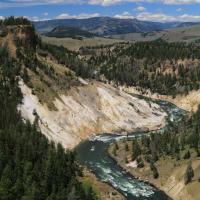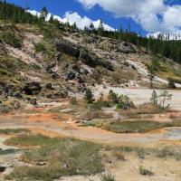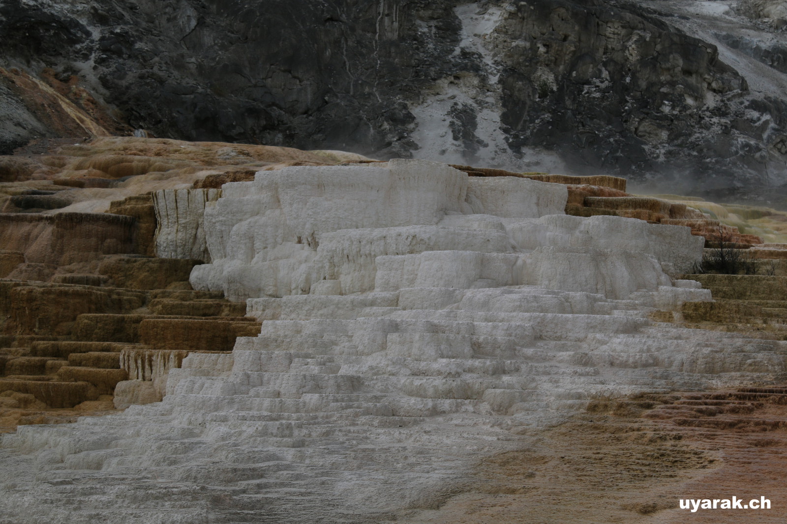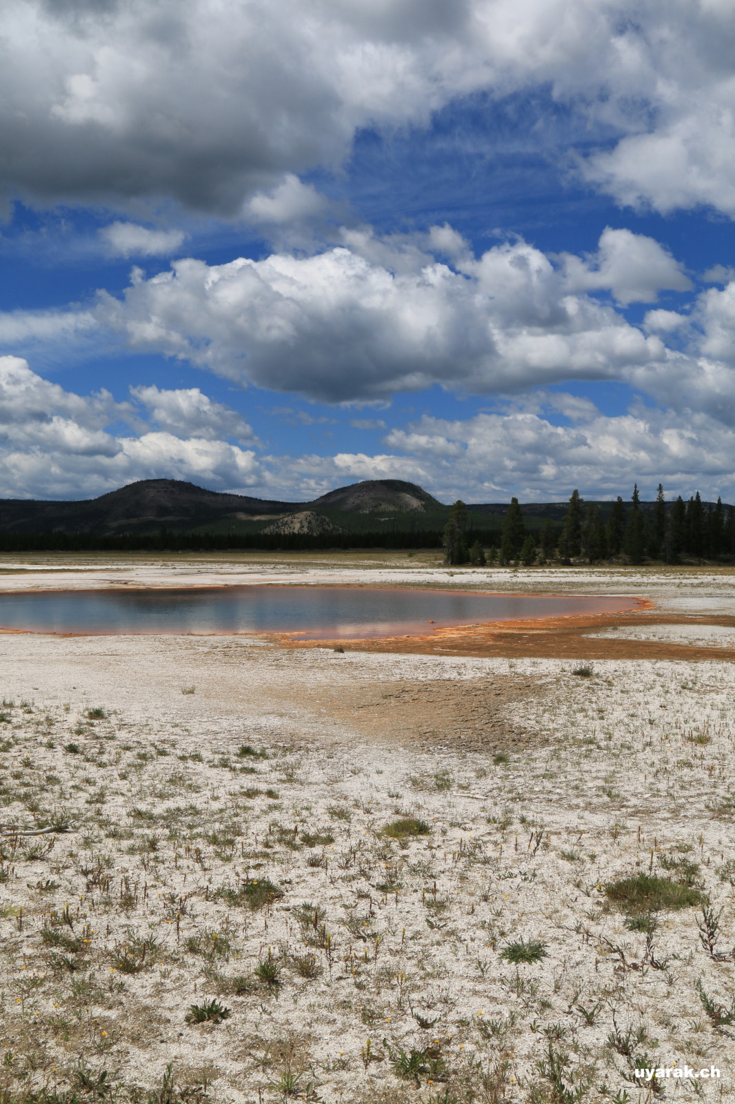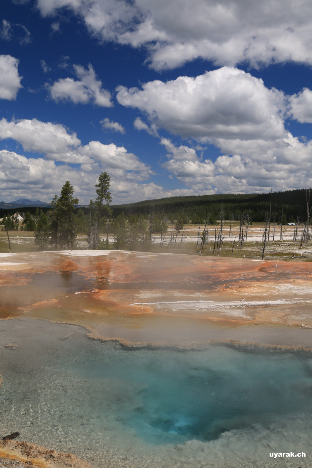 Der Yellowstone Nationalpark ist der älteste Nationalpark der Welt (gegründet 1872) und bekannt für seine Geysire und geothermalen Quellen. Mit 8987 km2 ist er ausserdem einer der grössten in den USA und es gibt einiges zu sehen. Fränzis Tageshighlight ist das Baden im Boiling River. Wie der Name erahnen lässt, ist es nicht ratsam sich direkt in diesen Bach zu setzen, aber an der Stelle wo er in den Gardner River fliesst ergibt sich eine angenehme Wassertemperatur. Wir sitzen für eine Stunde im Flussbett und rutschen immer wieder etwas hin und her um die beste Mischung zwischen eiskaltem und kochend heissem Wasser zu finden.