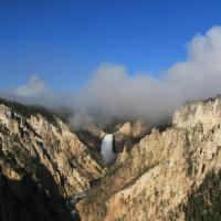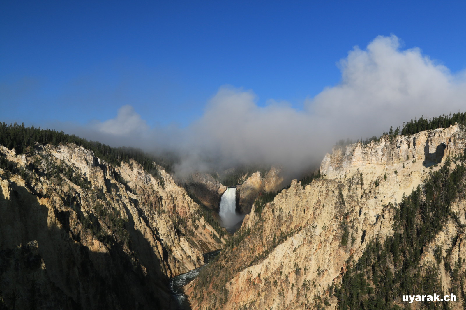 Den Grand Canyon of the Yellowstone, ein zwischen 250 m und 400 m tiefer Canyon durch welchen der Yellowstone River fliesst, wollen wir unbedingt ganz früh am Morgen sehen. Die Morgensonne lässt die Felswände gelb erstrahlen und vor allem hat es dann noch keine Touristen. Noch etwas verschlafen verlassen wir am Sonntagmorgen um 6 Uhr den Zeltplatz und tuckerln hintereinander Richtung Süden. Keine 45 min. später fahren wir bereits über die Brücke zur South Rim, stehen dann aber plötzlich vor einer Absperrung: "Road closed". Die Strasse zum Artist Point ist gesperrt. Da man von diesem Aussichtspunkt die beste Sicht auf die 94 m hohen Lower Falls hat, beschliessen wir den Rest des Weges zu laufen - ist auch nur eine Meile. Hinten angekommen brauchen wir noch etwas Geduld, bis sich der Nebel im Canyon endlich auflöst und wir den Wasserfall vollständig sehen können. Kurze Zeit später wird die Zufahrt geöffnet und zwei Reisecars laden haufenweise mit Selfie-Sticks ausgerüstete Koreaner aus - Zeit für uns den Rückzug anzutreten.