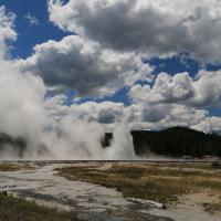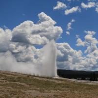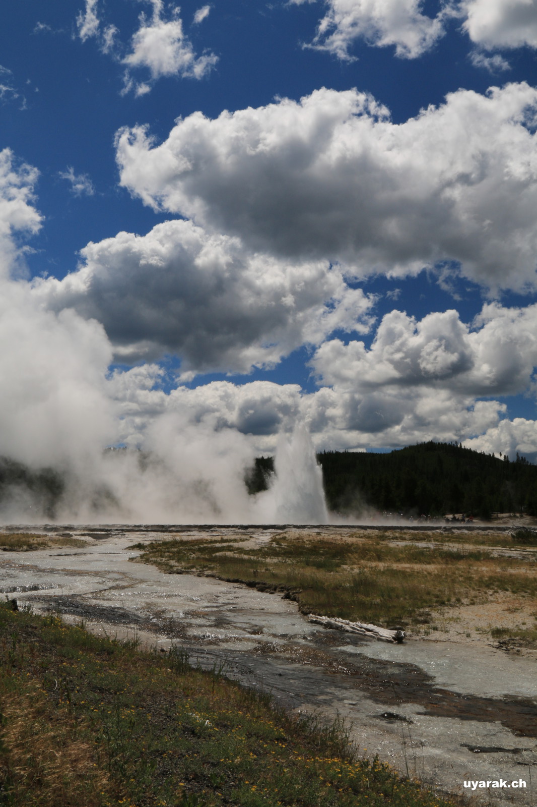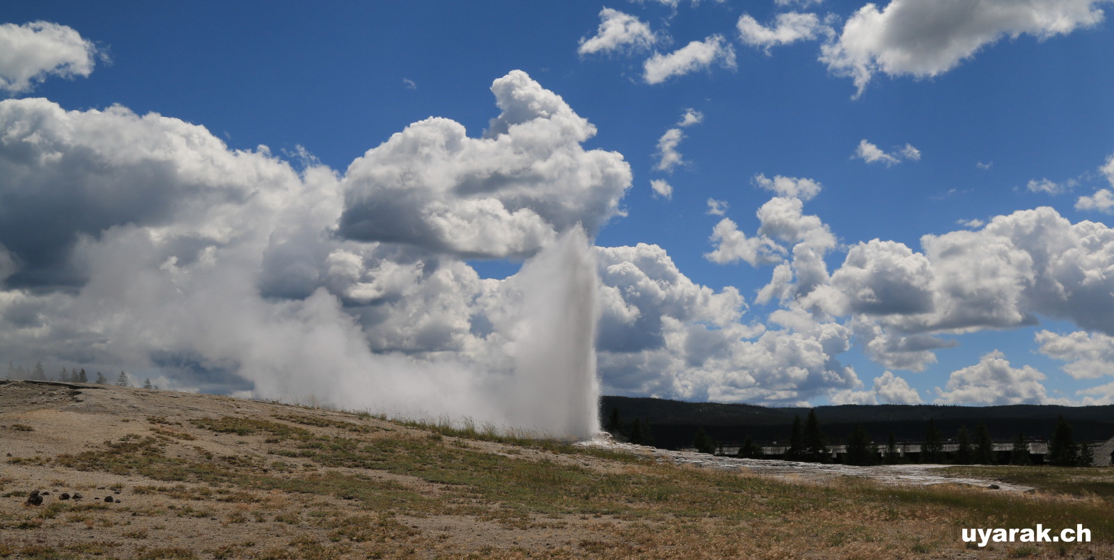Der bekannteste Geysir im Park ist der Old Faithful. Da er durchschnittlich alle 91 min. ausbricht und dabei zwischen 14'000 und 32'000 Liter Wasser bis zu 55 m in die Höhe schleudert ist er natürlich entsprechend gut besucht. Als wir ankommen, ist vom Geysir vor lauter Menschen nichts mehr zu sehen. Wir finden dann aber doch noch ein Plätzchen mit Blick auf das Spektakel.