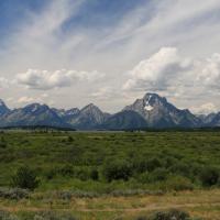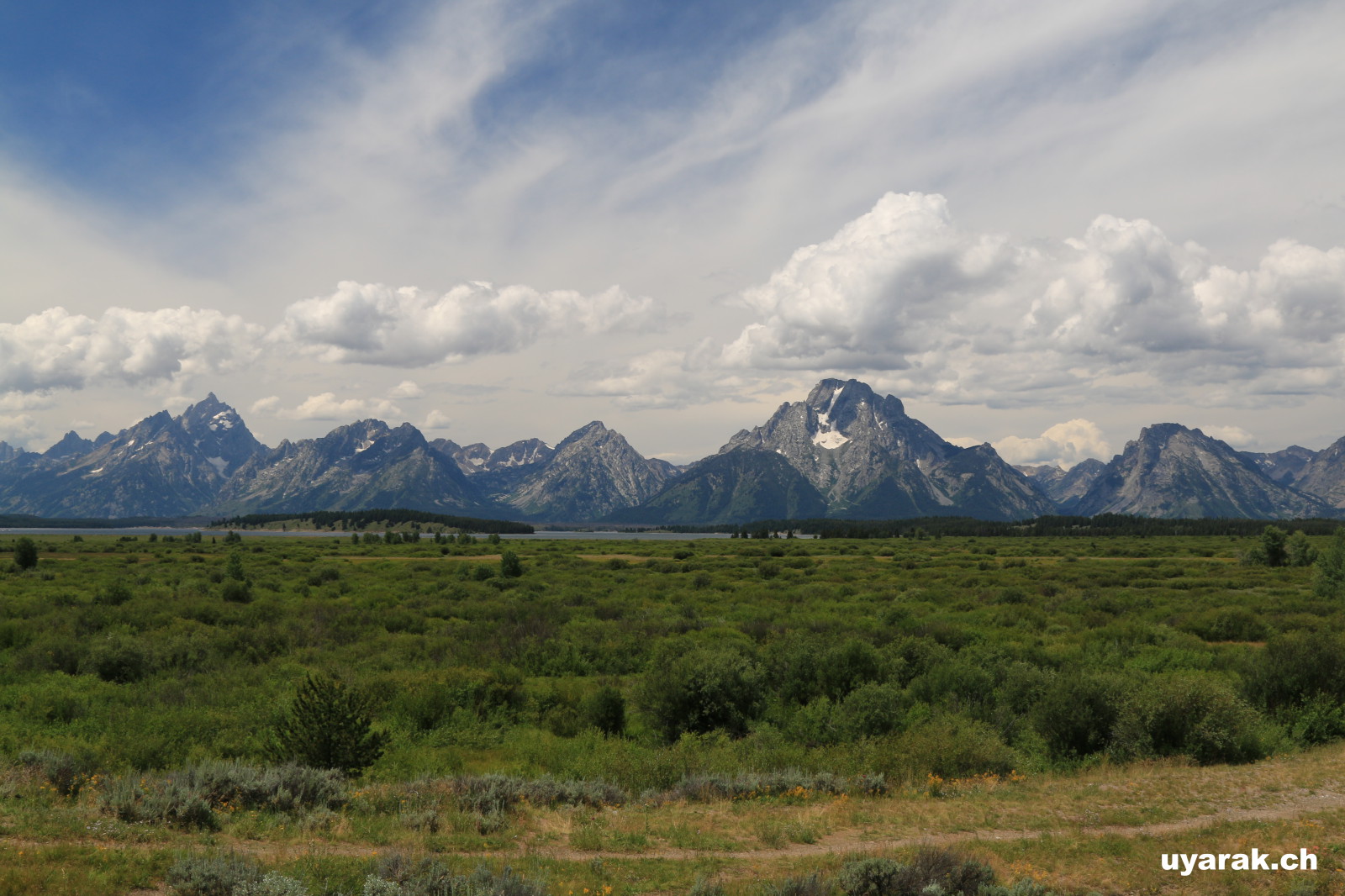 Ebenfalls im Nordwesten von Wyoming liegt der Grand Teton National Park. Nur wenige Kilometer vom Yellowstone entfernt, aber mit einer komplett anderen Landschaft. Wir fahren über einer Hochebene auf rund 2000 Meter über Meer als plötzlich im Westen die Teton-Bergkette auftaucht. Imposant ragt sie ohne Vorgebirge weitere 2000 Meter in die Höhe. Der Grand Teton ist mit 4199 m der höchste Berg der Kette. Die schneebedeckten Berge erinnern uns stark an die Alpen.