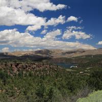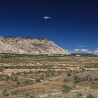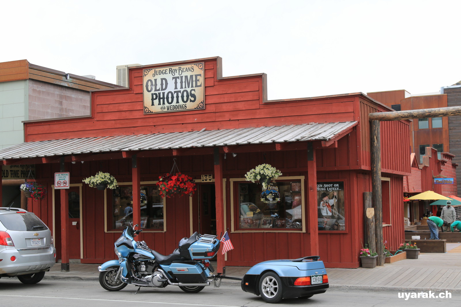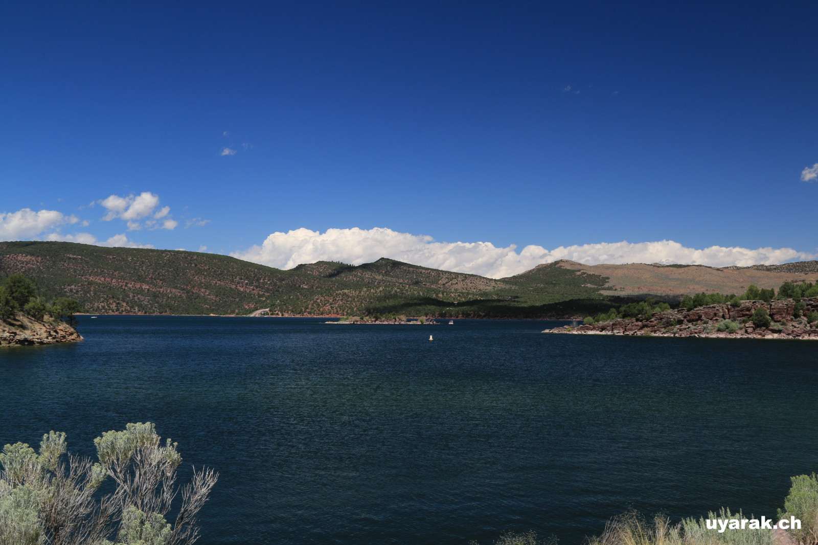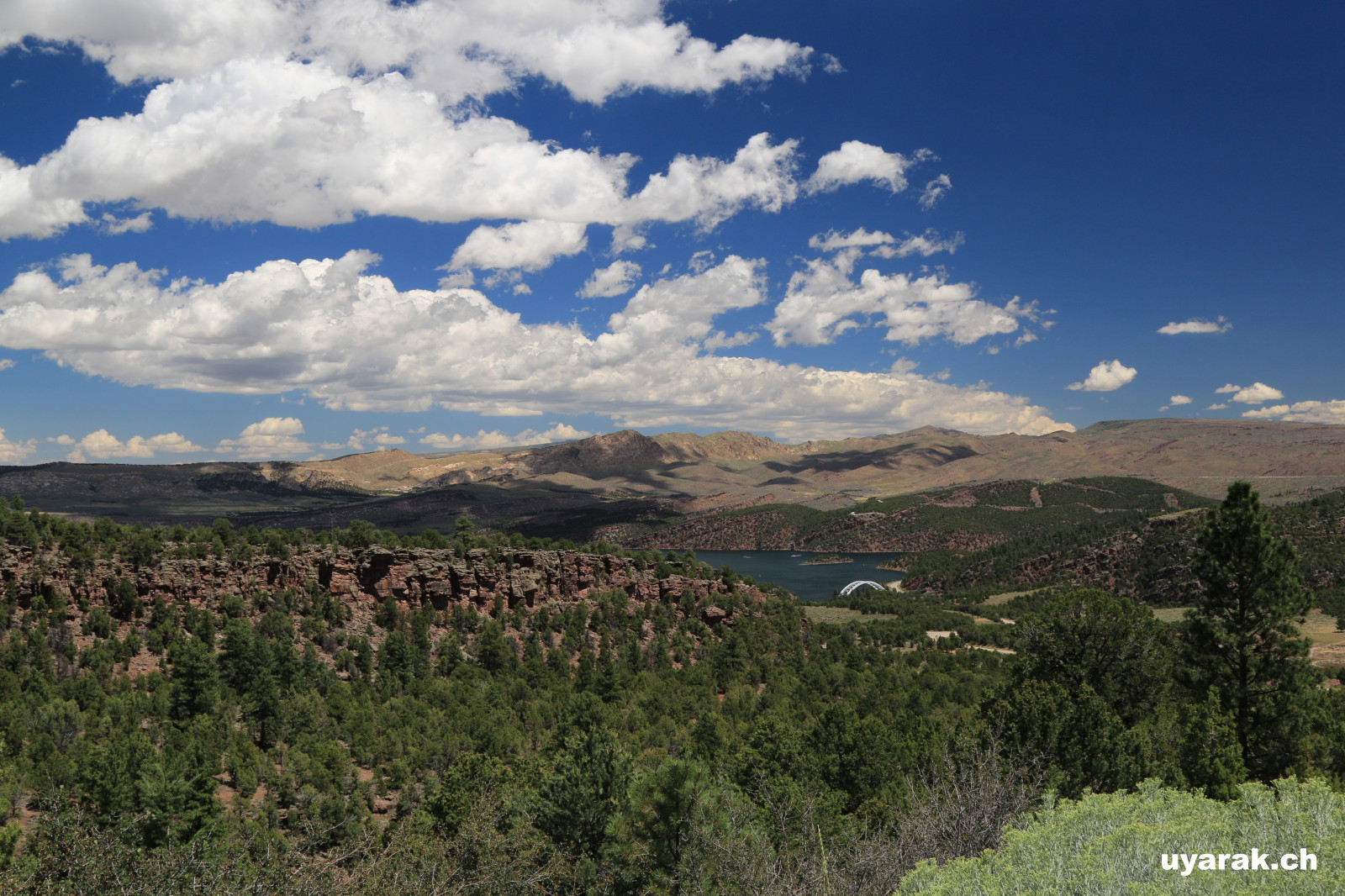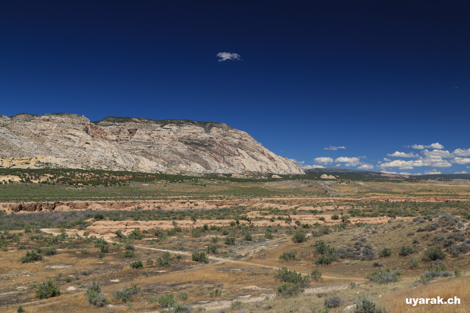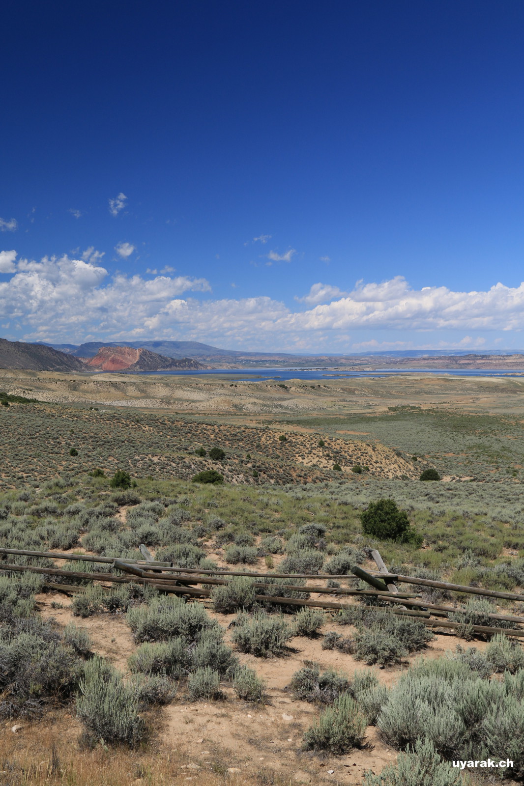 Kurz vor Jackson verlassen wir den Nationalpark wieder und fahren weiter nach Süden durch den Cowboy State. Obwohl die Berge am Horizont verschwunden sind und die Landschaft topfeben ist, zeigt der Höhenmesser weiterhin noch über 2000 m an. Das ändert sich auch nicht mehr bis wir den Bundesstaat verlassen und nach einem kurzen Abstecher über Utah nach Colorado kommen. Über steile, bis zu 2700 m hohe Pässe kämpft sich Uyarak langsam Richtung Süden vor. Immer mehr kommen wir uns vor wie in einem alten Western. Die karge Landschaft ist durchzogen von kleinen und grösseren Canyons, die Sonne brennt erbarmungslos auf uns herab und trotz der Höhe bleibt das Thermometer hartnäckig über 30°C. Hin und wieder passieren wir einzelne Farmen und durchfahren kleine Dörfer ansonsten sind da nur Büsche, Sand und rote Felsen.