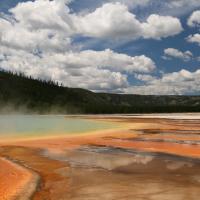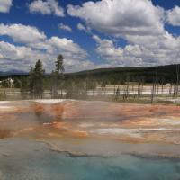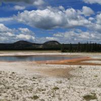 Beim Midway Geyser Basin ist mit der Grand Prismatic Spring die grösste heisse Quelle der USA zu finden. Das etwa 80 m im Durchmeter messende Becken schimmert in allen Farben von rot über orange, gelb, grün bis blau. Vom Holzsteg aus bestaunen wir die Farben und beobachten wie die Quelle über 2000 Liter heisses Wasser pro Minute ausstösst.