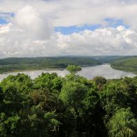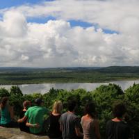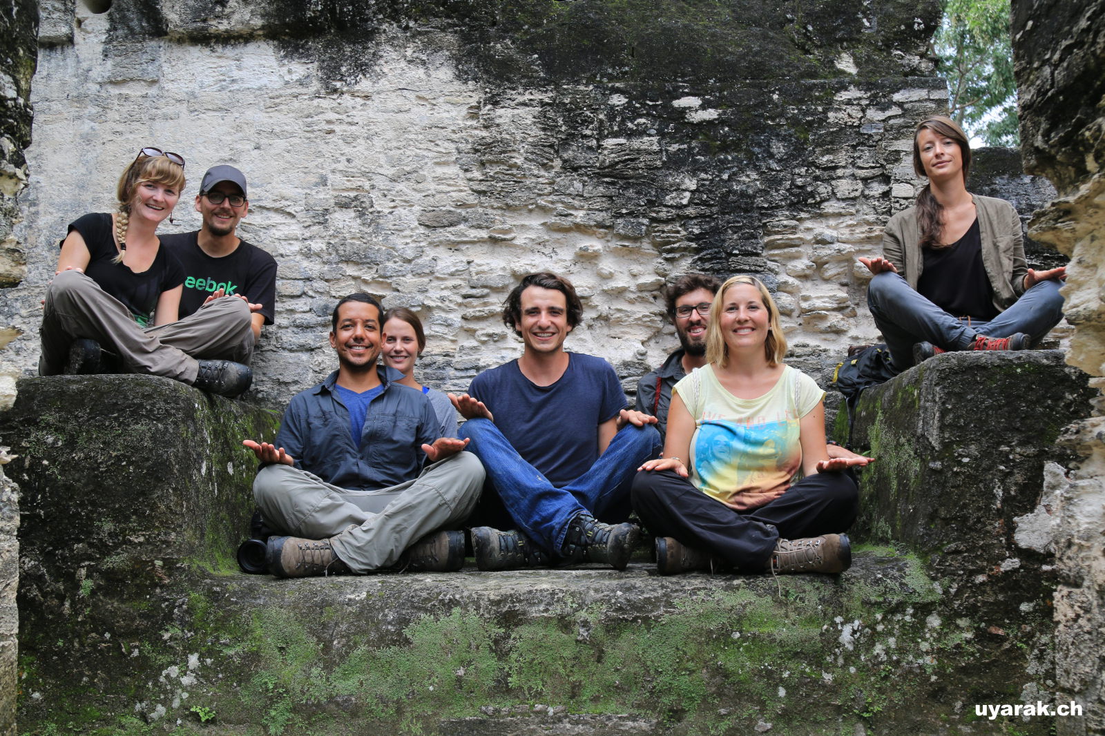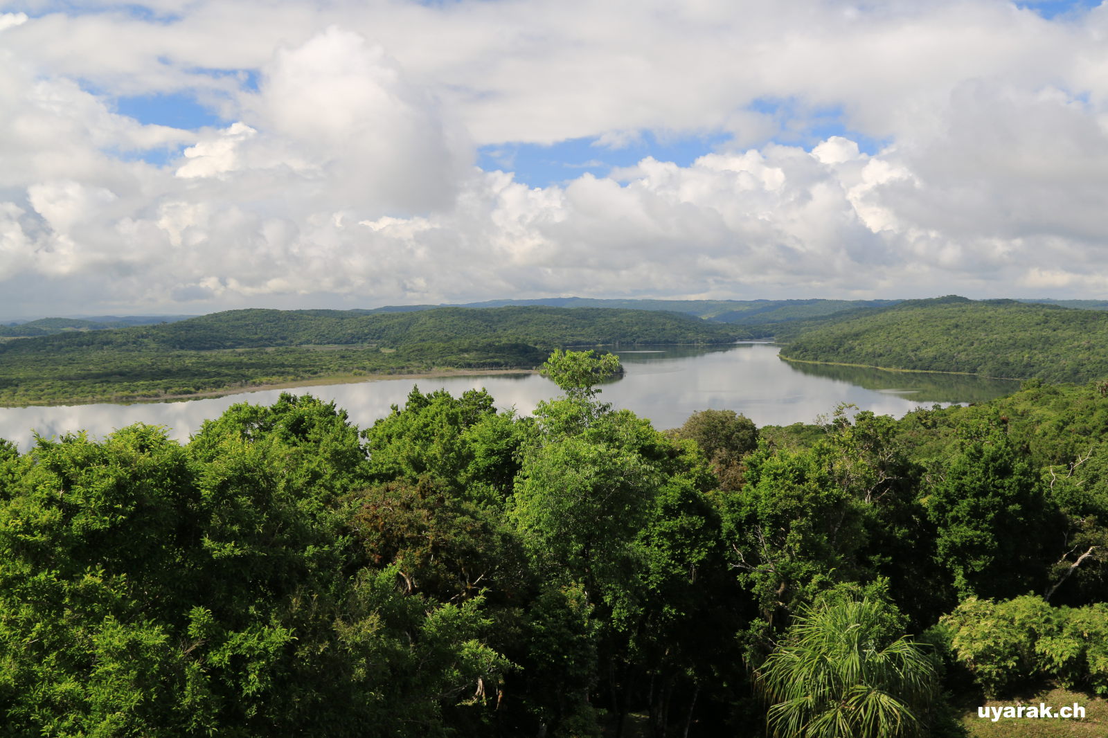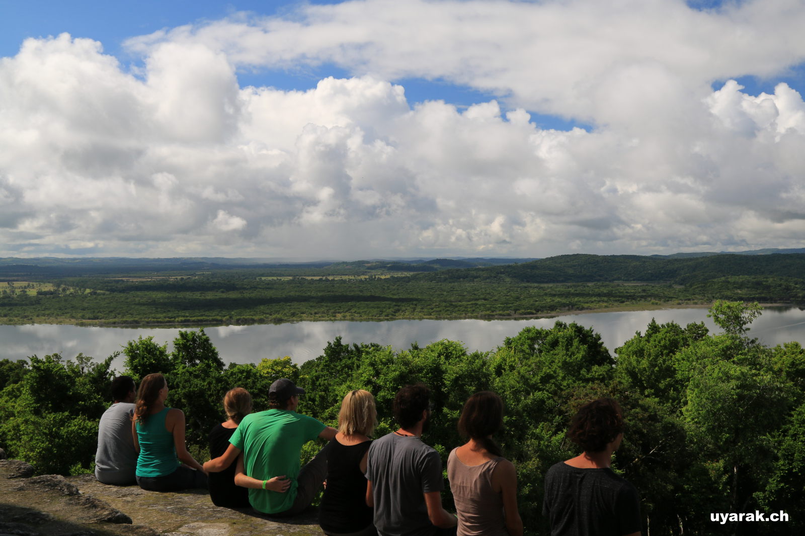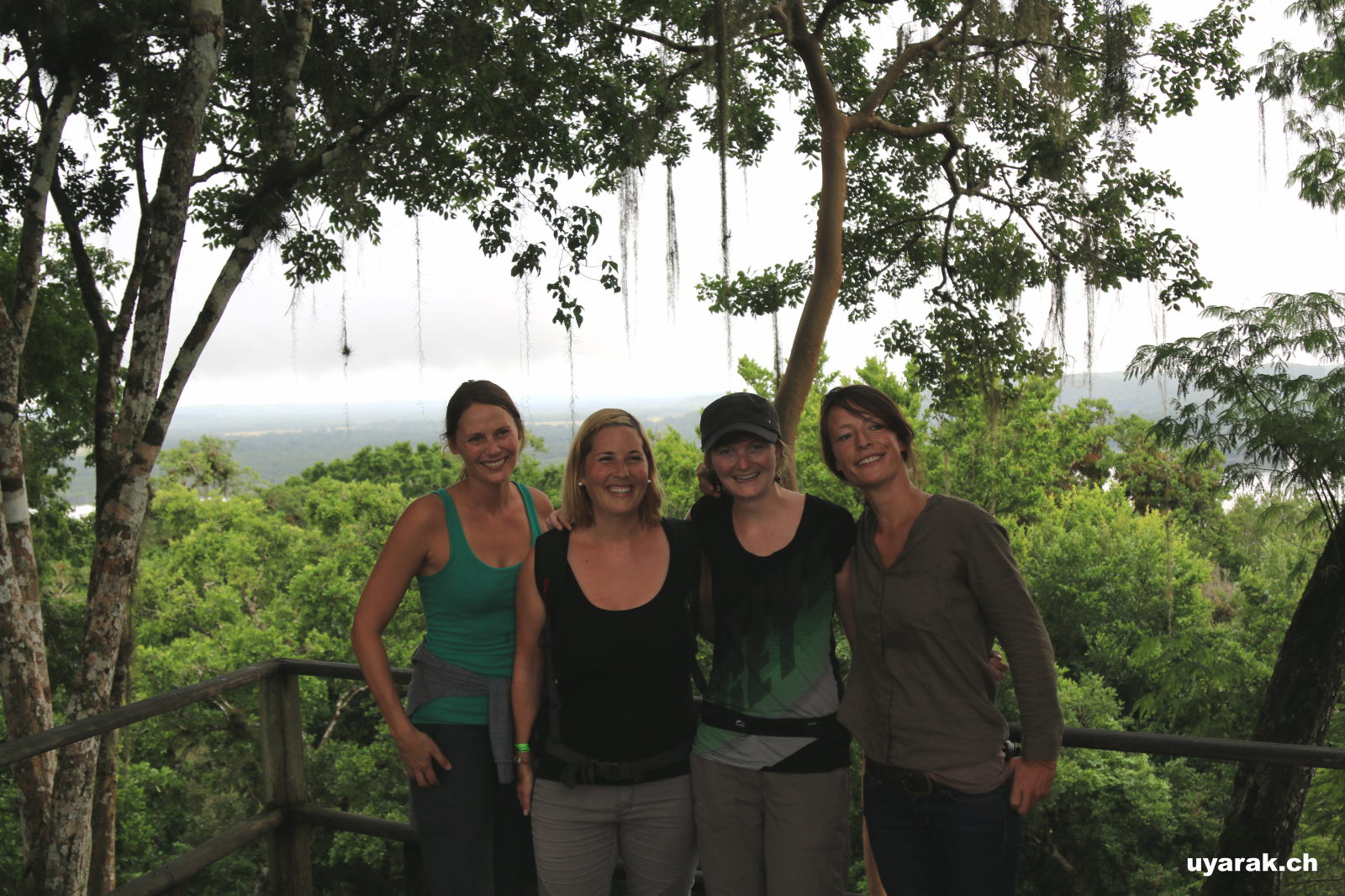Die Grenzformalitäten sind schnell erledigt und so fahren wir gemütlich zu unserem ersten Ziel im 5. Land unserer Reise. Die Ruinenstadt Yaxhá ist wenig bekannt und über eine 10 Kilometer lange Schotterpiste zu erreichen. Nach dem Mittagessen in einem kleinen Restaurant mitten im Dschungel fahren wir noch den letzten Kilometer bis in den Park. Hier dürfen wir gratis übernachten und so fahren wir direkt auf die kleine Wiese am Seeufer. Die Freude währt nicht lange, denn die frisch gemähte Wiese ist vom vielen Regen komplett aufgeweicht und so stecken gleich drei von vier Fahrzeugen im Schlamm. Während Fabienne und Christian ihren mit Mud-Terrain Reifen bestückten Nissan Patrol relativ problemlos wieder befreien können, brauchen wir ein paar schiebende Hände. Alle Sperren nützen nichts, wenn sich das Reifenprofil einfach mit Schlamm füllt. Richtig tief versenkt haben Taisa und Ernesto ihren vier Tonnen schweren Toyota 4Runner. Mit Hilfe der Seilwinde bekommen wir aber auch den wieder frei und suchen uns einen etwas trockeneren Platz zum Parken. Kaum sind wir auf dem Weg zu den Ruinen, setzt der alltägliche Regen ein. In der Hoffnung, dass es bald wieder aufhört gehen wir noch etwas weiter, werden aber enttäuscht.