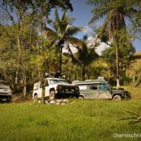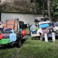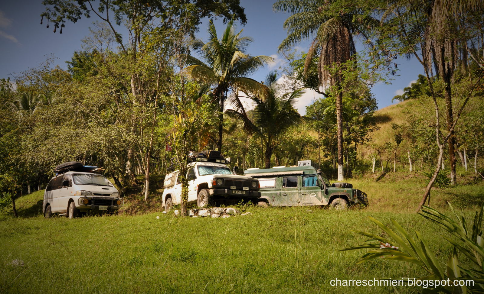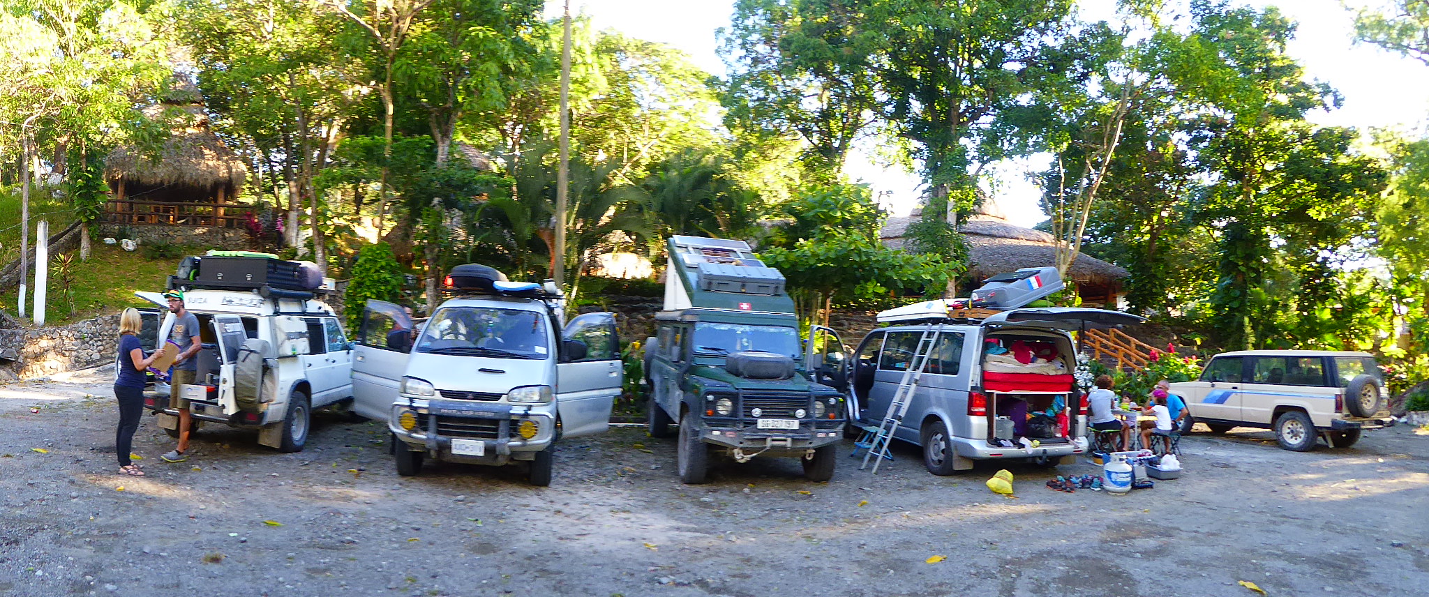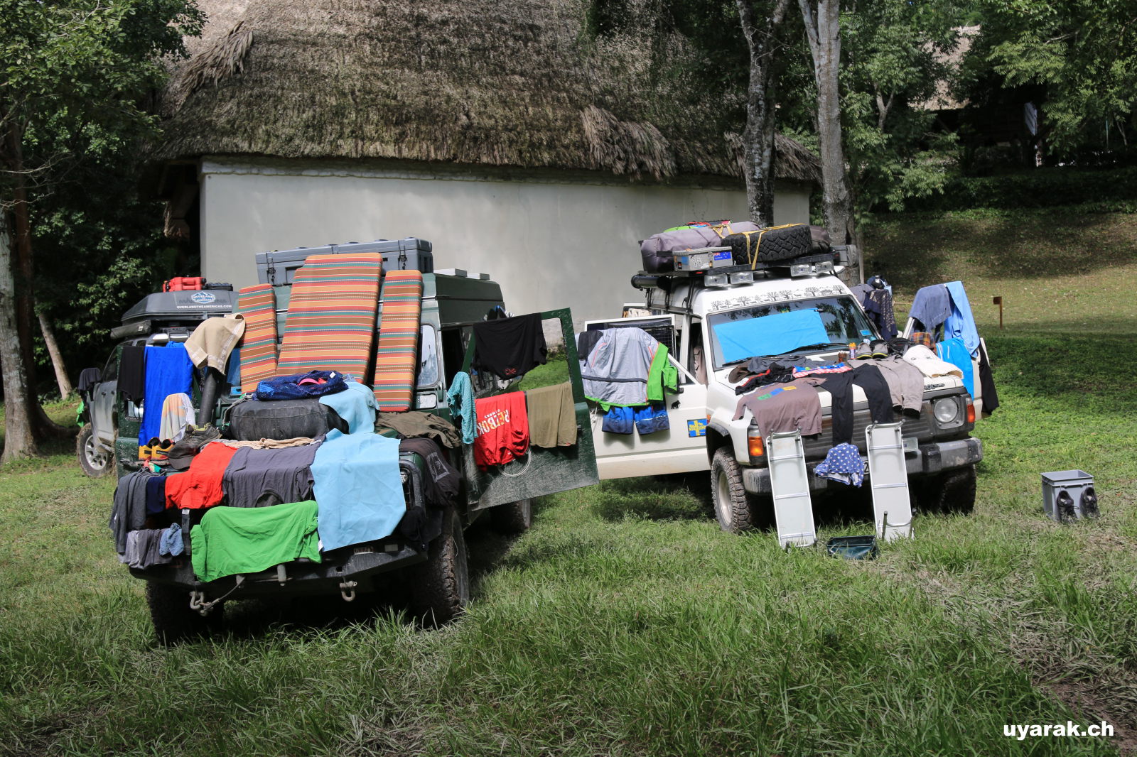 Während wir im Trockenen unter einer Palapa sitzen, backen wir Brot auf dem Feuer und grillen Fleisch und Gemüse fürs Nachtessen. Ein lustiger Abend nimmt seinen Lauf und wir vergessen das nasse Wetter schnell wieder. Am nächsten Morgen unternehmen wir einen zweiten Anlauf und wandern für ein paar Stunden durch die Ruinen. Auf dem Rückweg schaut dann sogar die Sonne hinter den Wolken hervor und wir wittern eine Chance. Aufgrund der extrem hohen Luftfeuchtigkeit bekommen wir seit Tagen nichts mehr trocken und so breiten wir schnell die ganzen feuchten Kleider, Polster und Badetücher auf den Fahrzeugen aus und lassen das Zeug von den warmen Sonnenstrahlen trocknen.