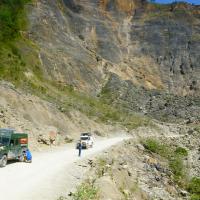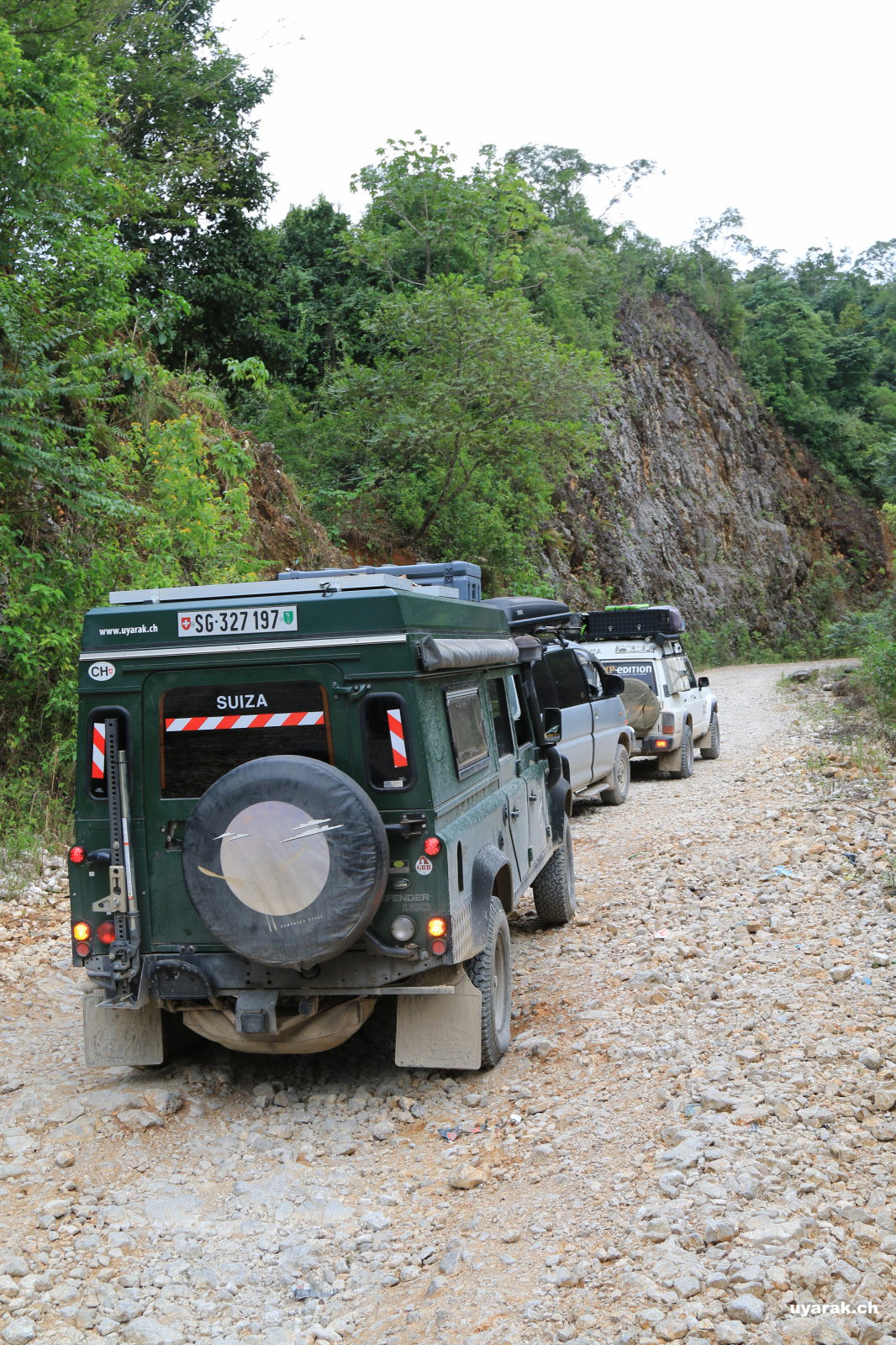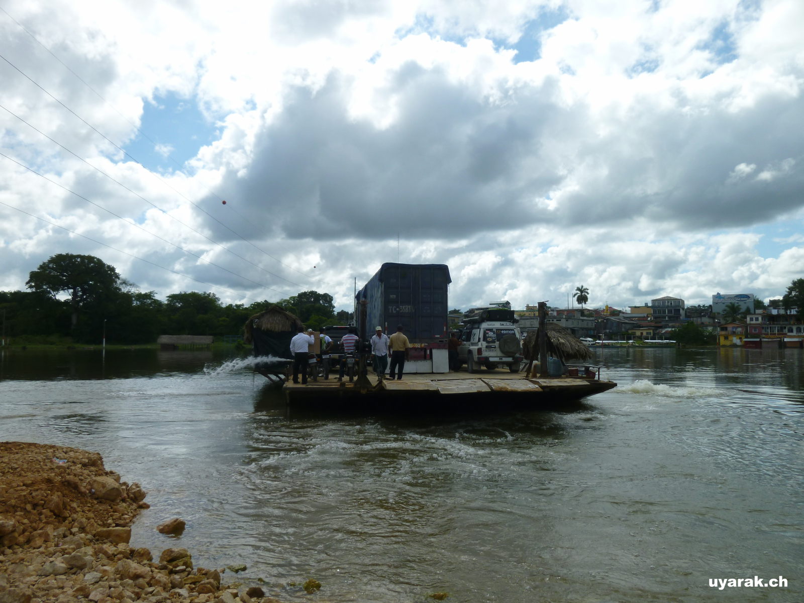 Da Google Maps uns für die nächste Etappe auf einer nicht existierenden Strasse quer durch den Dschungel leiten will, vertrauen wir auf die Papierkarten von Reise-Know-How und folgen der Ruta 5. Bei Sayaxché bringt uns eine klapprige Fähre mit zwei Aussenbordmotoren über den Río La Pasión. Auf der Karte ist die Strecke als Hauptstrasse gekennzeichnet und so sind wir leicht überrascht, als kurz nach der Abzweigung der Ruta 9 beim Aufstieg in die Berge die Teerstrasse endet. Plötzlich sind wir auf einer sehr groben Schotterpiste unterwegs und sind froh, dass Uyarak genügend Bodenfreiheit hat. Langsam klettern wir den Berg hoch und stellen nach ein paar Kilometern ernüchternd fest: "Die Strasse wird wohl nicht so schnell wieder besser". Während sich die Sonne immer mehr dem Horizont nähert, folgen wir dem Weg im Schritttempo und erkunden uns immer wieder bei Einheimischen nach dem weiteren Strassenzustand. Die Hoffnung auf eine bessere Piste stirbt erst, als wir Stunden später im Dunkeln in Lanquín ankommen. Nach 9 Stunden Fahrt für gerade mal 250 km fallen wir todmüde ins Bett.