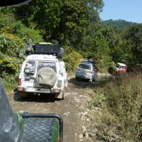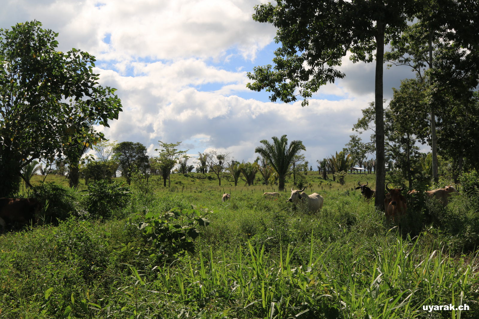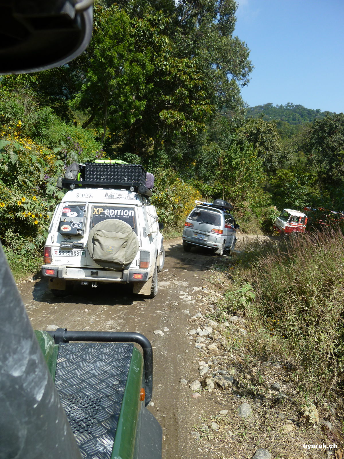 Da der Patrol von Fabienne und Christian seit ein paar Tagen komisch weiss qualmt, rät uns Pierre nicht die steile Strasse zu nehmen, sondern um den See und den einen Vulkan herumzufahren. Wir folgen seinem Rat und fahren durch die kleinen Dörfer am Seeufer. Einige Kilometer nach dem letzten Dorf ist dann fertig mit der Teerstrasse und es folgt ein relativ schlechter Weg durch den Dschungel. Zu unserer Überraschung steht da ein Polizeiauto und die Polizisten bieten uns Geleitschutz an. Anscheinend ist die Gegend hier nicht so sicher und so folgt uns der Pickup durch den Wald. Kaum sind wir um den Vulkan herum und zurück in der Zivilisation, verabschieden sich die Polizisten und sind so schnell weg wie sie aufgetaucht sind.
