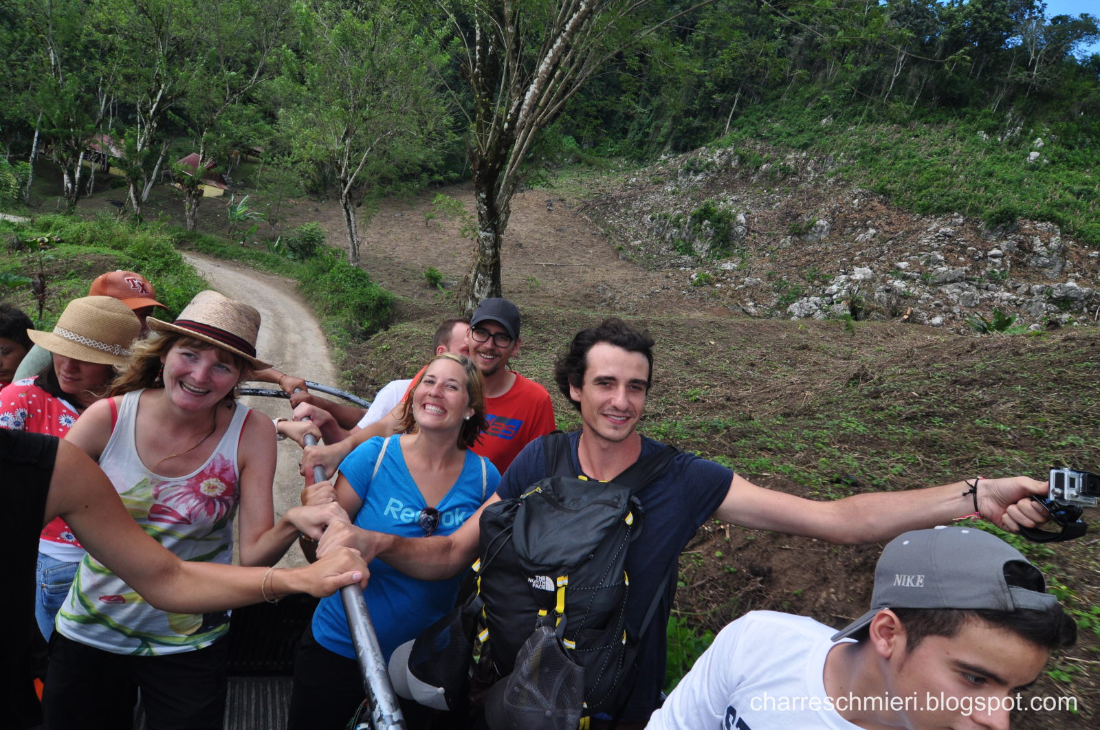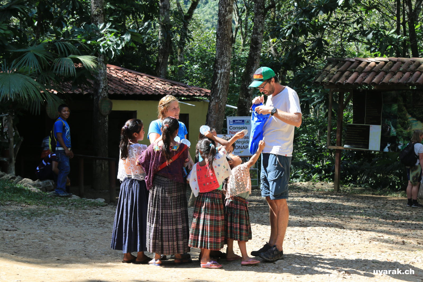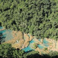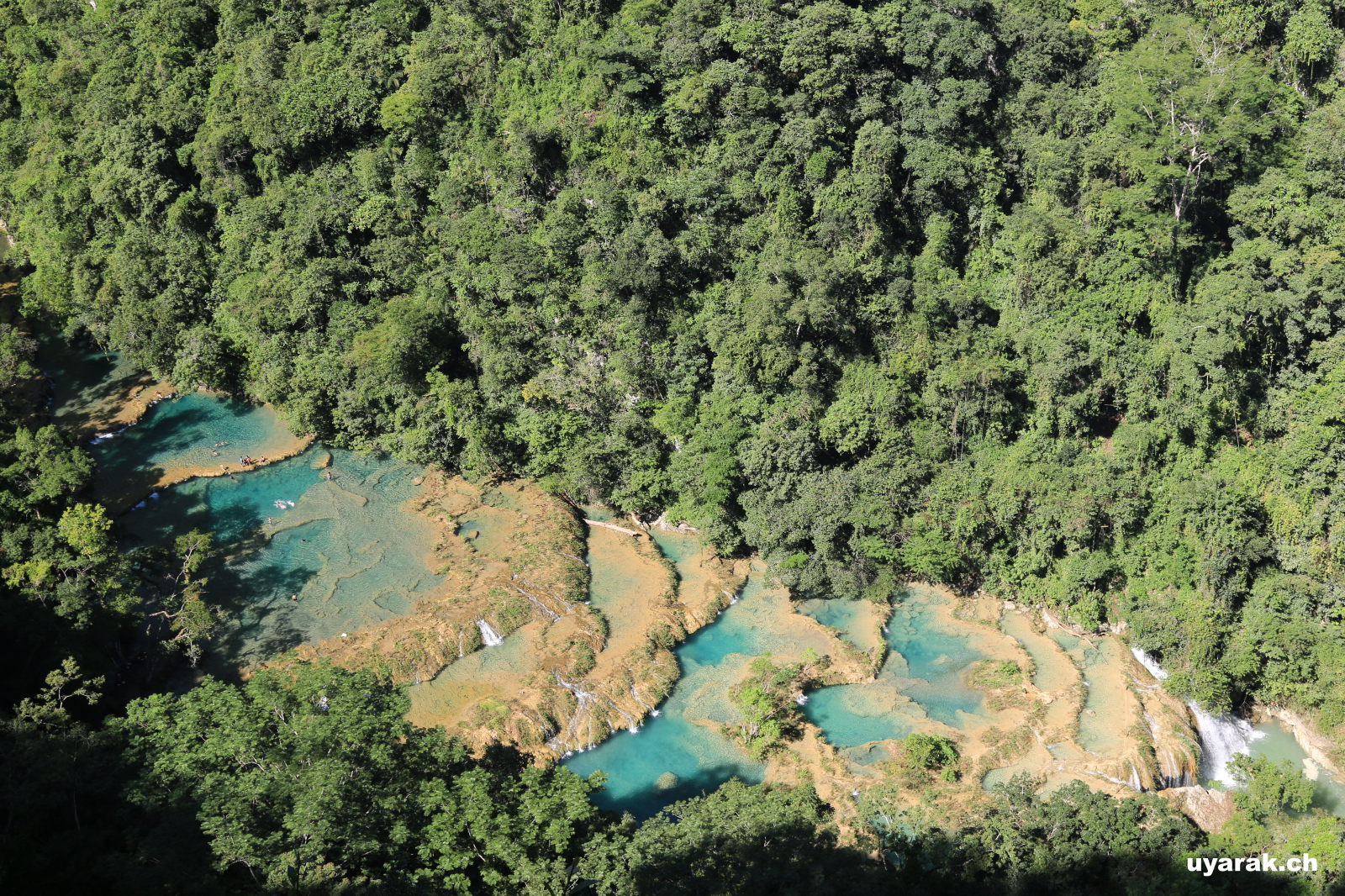 Wir bestellen uns ein Colectivo welches uns von Lanquín nach Semuc Champey bringt. Auf der Ladebrücke des Pickups holpern wir während 45 Minuten über die schmale und zum Teil steile Piste bis zum Parkeingang. Von hier aus laufen wir nach "dort wo das Wasser verschwindet", wie Semuc Champey übersetzt heisst. Die tiefblauen Becken laden zum Baden ein, doch wir steigen erst zum Aussichtspunkt - El Mirador - hoch, von wo aus man das ganze Tal überblicken kann. Der Río Cahabón fliesst unter den Becken hindurch und speist diese, bevor er weiter unten wieder aus dem Felsen hervortritt. Zurück im Tal gönnen auch wir uns ein erfrischendes Bad und springen von einem Becken ins andere.