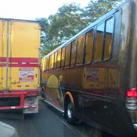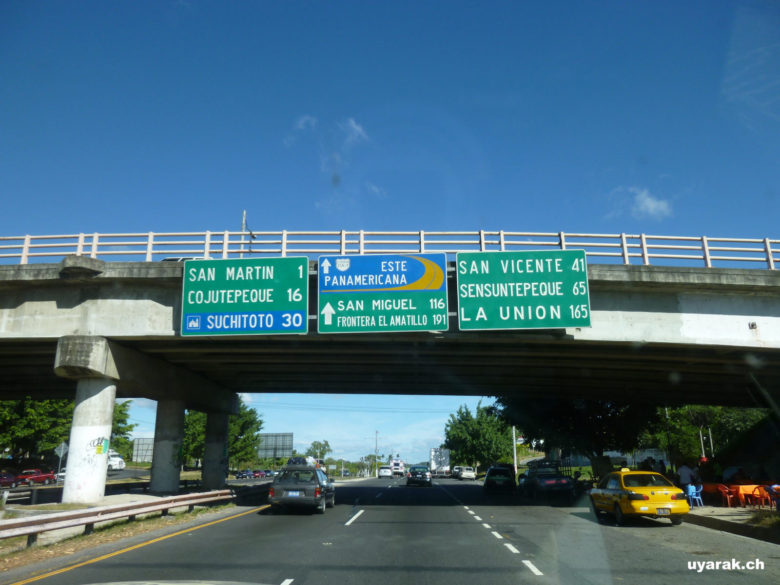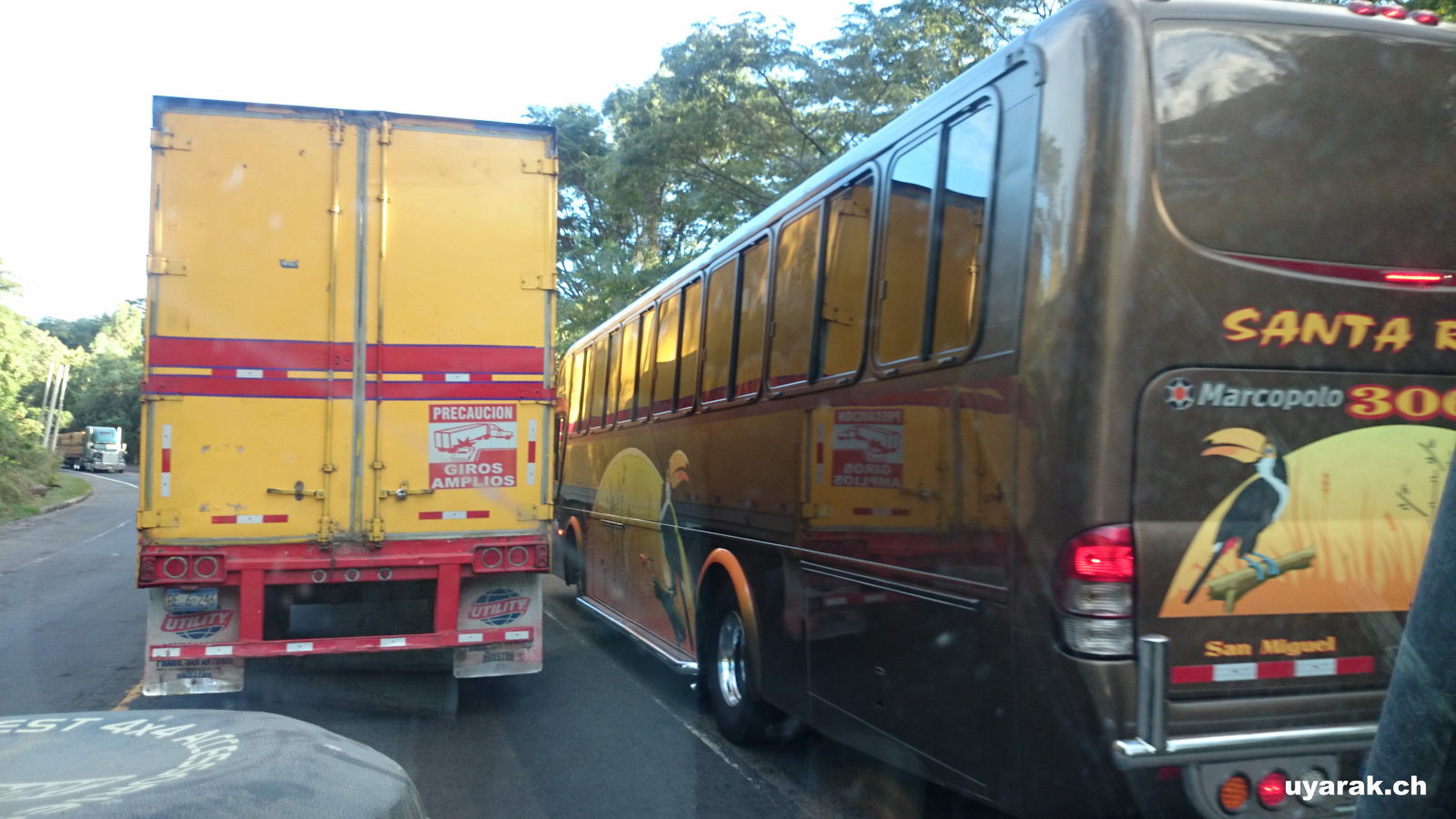 Es vergeht noch eine weitere Stunde bis wir endlich alle Papiere haben und unsere Fahrt fortsetzten können. Die Landschaft ist wunderschön und alles ist unglaublich grün. Auch die Strasse lässt keine Wünsche offen, der Zustand ist ausgezeichnet und wir kommen zügig voran. Erst im Osten des Landes wo der Panamerican Highway nur noch zweispurig ist, geht es etwas langsamer voran. Als wir mal für etwas länger hinter einem langsamen Lastwagen festhängen, überlege ich mir kurz ob ich wohl auf dem Pannenstreifen überholen könnte, verwerfe den Gedanken aber schnell wieder. Zwei Minuten später pirscht sich jedoch ein Pickup auf dem Pannenstreifen an und überholt den Lastwagen rechts. Doch keine so schlechte Idee? Fränzi interveniert aber und meint es sei zu schmal für uns. Bevor ich widersprechen kann donnert ein Reisecar rechts an uns vorbei und versucht auch am Lastwagen vorbeizukommen. Doch der Lastwagenfahrer hat das Spiel durchschaut und lässt den Car nicht vorbei. Obwohl wir lautstark mit der Hupe versuchen unsere Poleposition hinter dem Lastwagen zu verteidigen, drückt sich der Busfahrer zwischen uns rein und beginnt sogleich wieder links zu überholen - ob was entgegen kommt kann er freilich nicht sehen, aber dafür hat man ja eine Hupe.