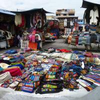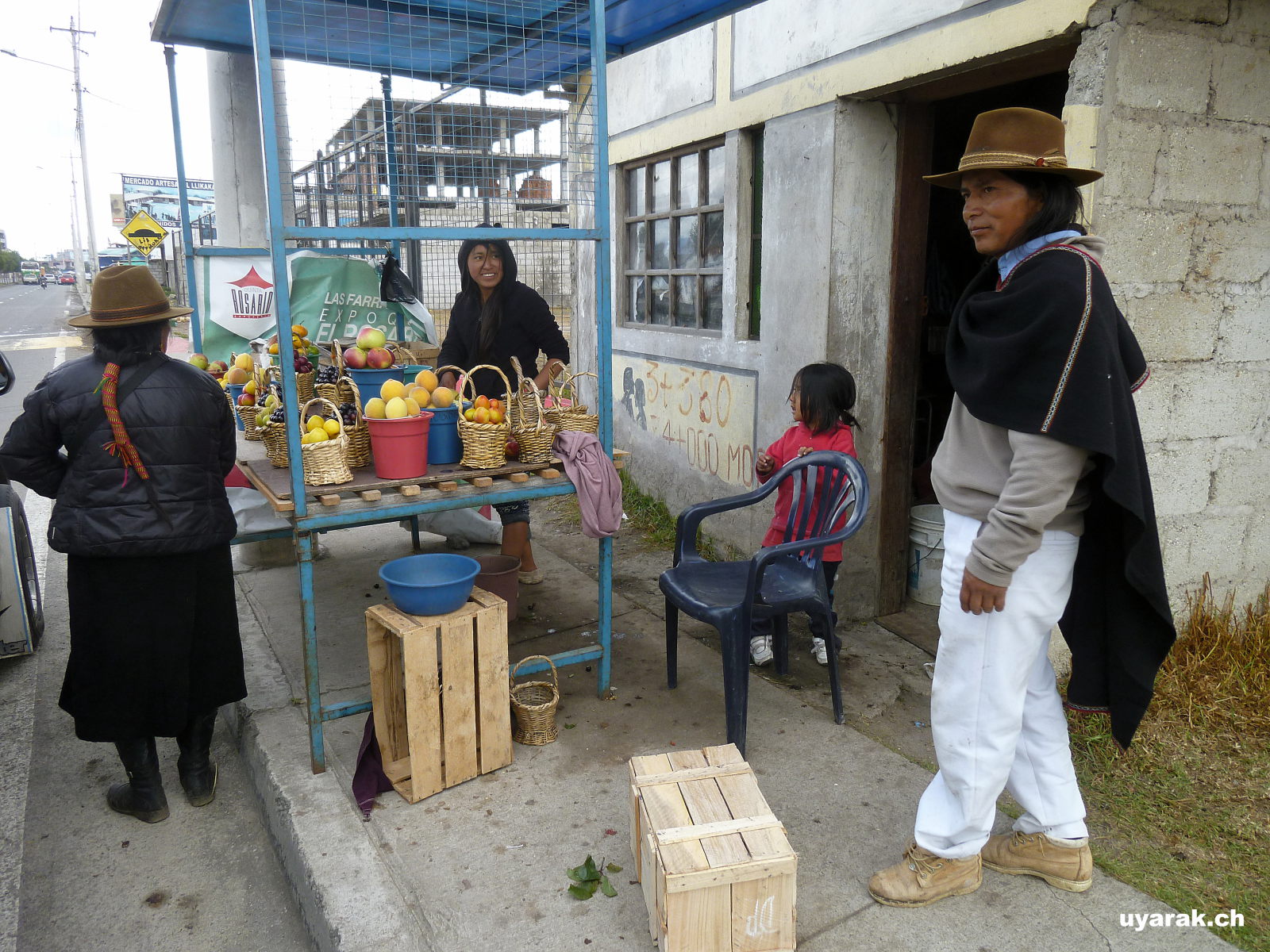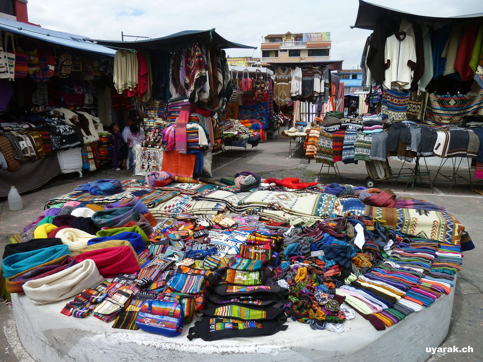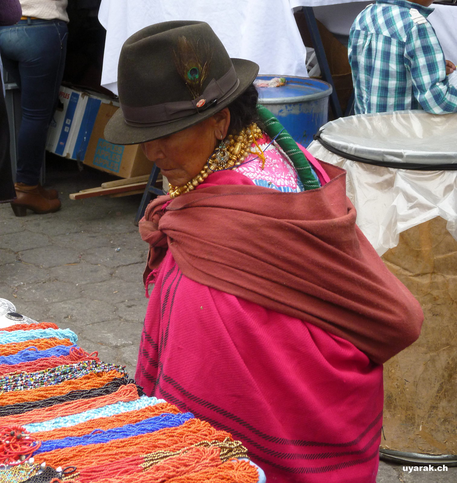 Wenige Kilometer nach Ibarra wird die Landschaft grüner. Landwirtschaft soweit das Auge reicht. Während unsere Blicke über die schöne Laguna Cuicocha schweift, gönnen wir uns ein leckeres Sandwich mit selber gebackenem Brot. Verweilen können wir nicht lange, denn wir wollen noch genügend Zeit haben in Otavalo durch den Markt zu schlendern. Dieser entpuppt sich als ein richtiges Kulturerlebnis. Bunt wie ein Blumenstrauss mit all den schönen farbigen Tüchern, Ponchos, Hüten und Ketten welche von indigenen Frauen angepriesen werden. Das Ambiente ist einmalig, denn alle Señoras sind traditionell gekleidet.
