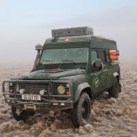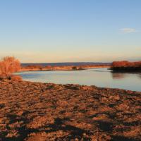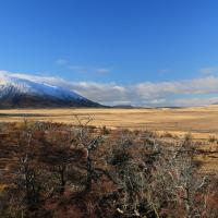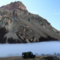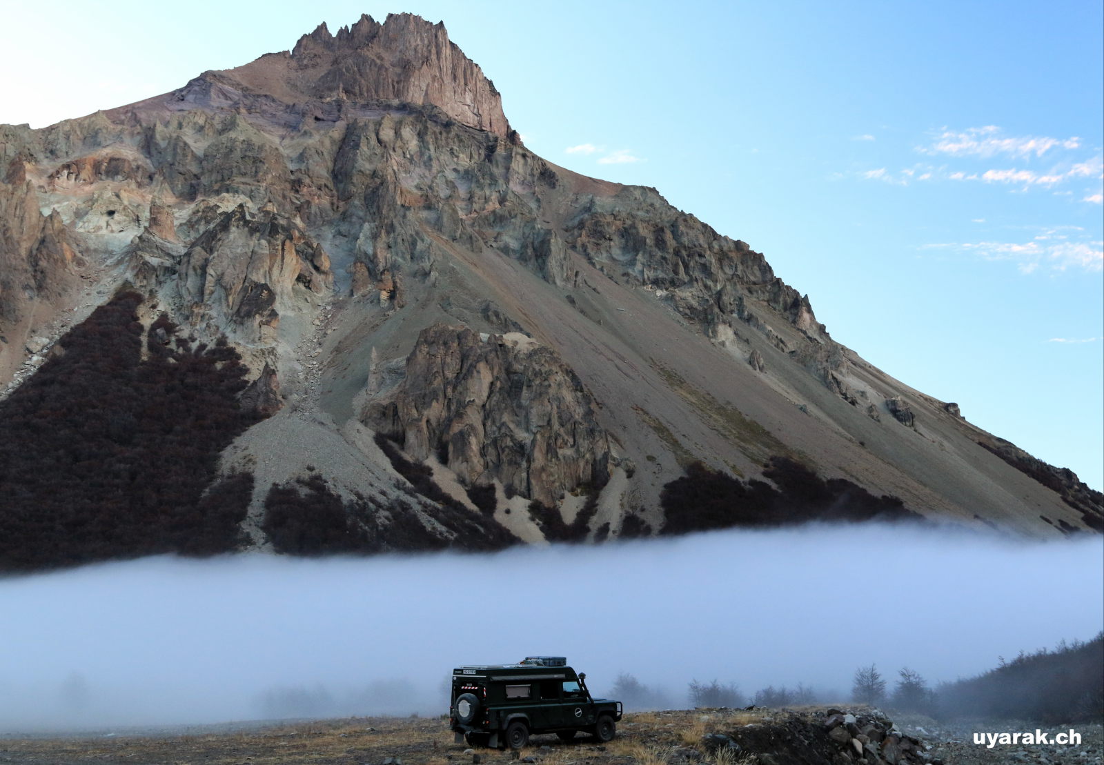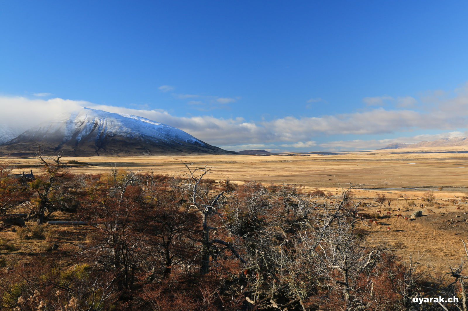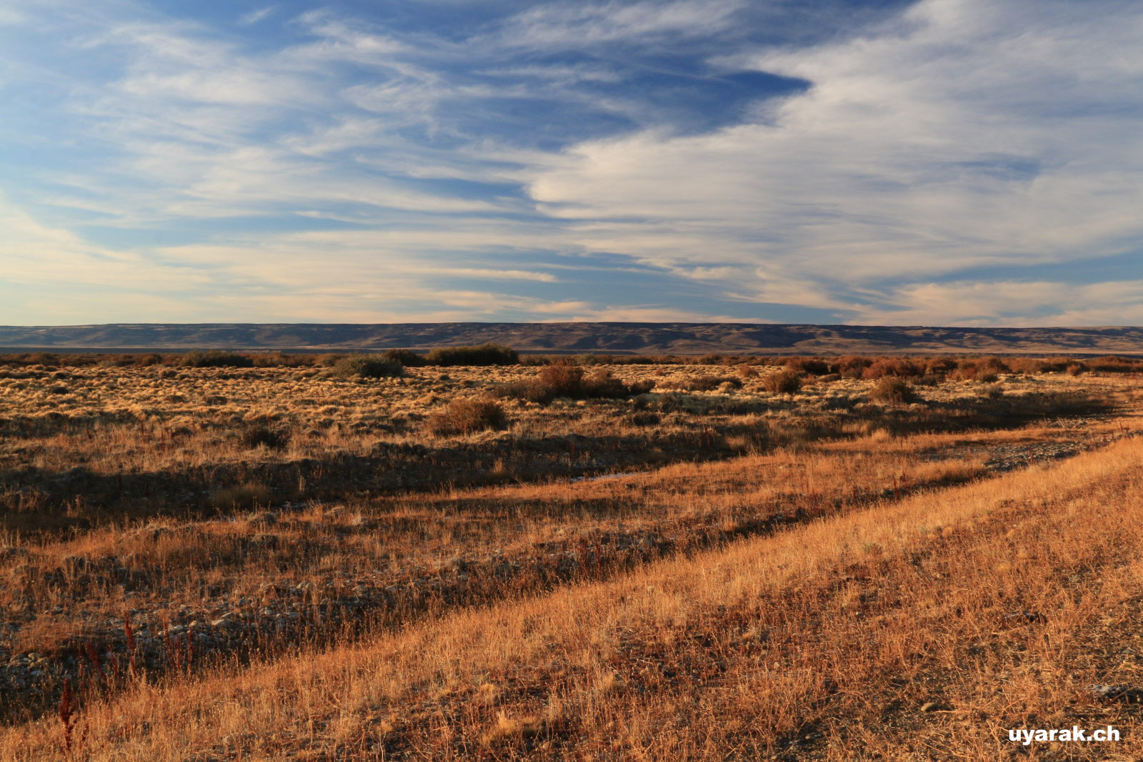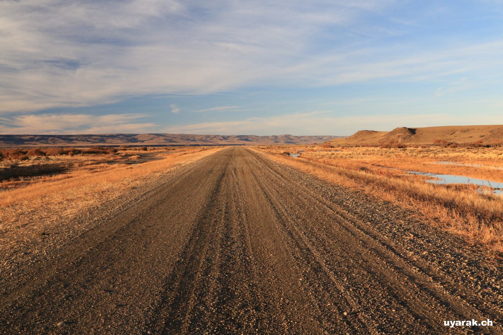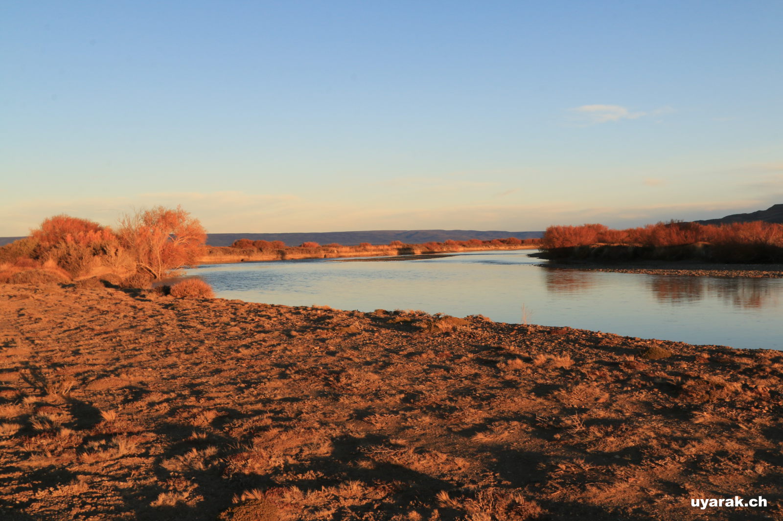 Für uns geht es nun etliche hundert Kilometer durch die Pampa. Wir fahren den ganzen Tag und sehen kaum ein anderes Fahrzeug. Trockene Graslandschaft und seichte Hügel ziehen am Fenster vorbei, Guanakos stehen unbeeindruckt am Strassenrand und Nandus flüchten, aufgeschreckt vom plötzlichen Motorenlärm. Kurz vor Gobernador Gregores, am Río Chico just da wo der Asphalt endet geht die Sonne unter und wir Stellen uns für die Nacht ans Flussufer. Goldgelb leuchtet die Steppe als wir am nächsten morgen wieder aufbrechen. Nach knapp 100 km wird aus der guten Schotterstrasse dann plötzlich eine rutschige Schlammpiste. Innert Minuten ist Uyarak nicht mehr grün und wir schliddern von einer Fahrspur in die nächste während der Dreck bis übers Dach fliegt. Ab Tres Lagos - ein paar Häuser mitten im Nirgendwo - ist die Strasse dann wieder geteert und wir kommen entsprechend zügig voran.