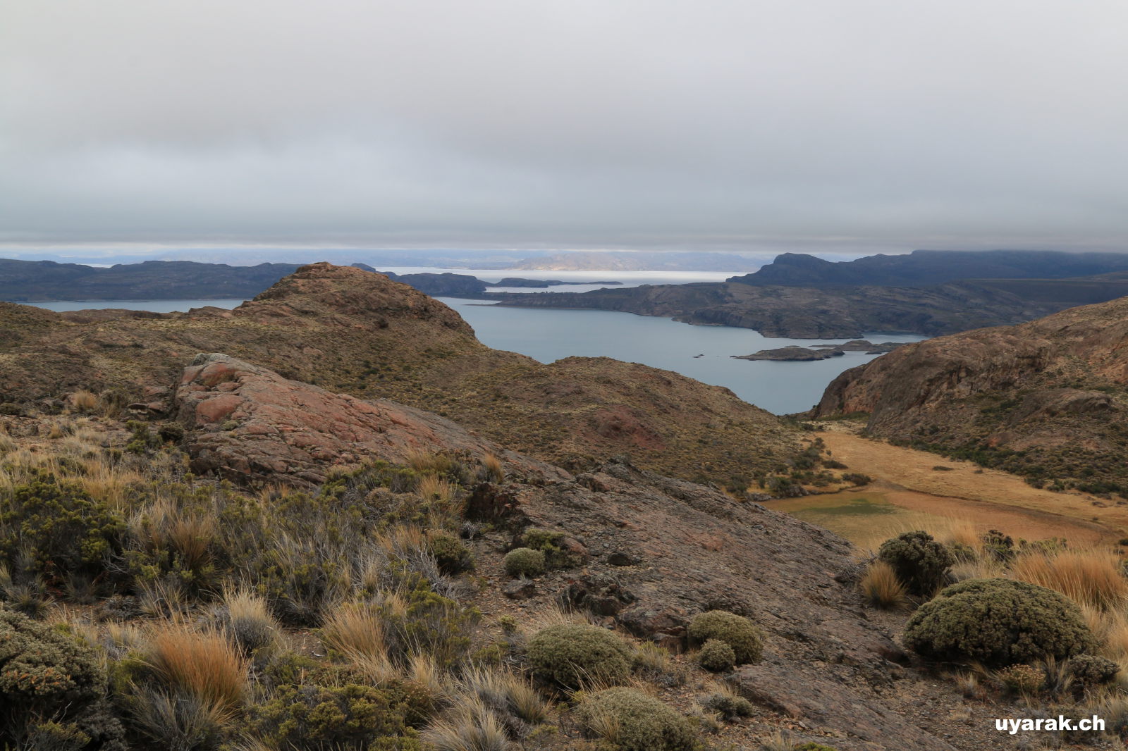 Auf dem Papier sind wir bereits aus Chile ausgereist, als wir das kleine Dorf verlassen und dem Feldweg gegen Osten folgen. Die Landschaft ist wunderschön und wir haben einen ausgezeichneten Blick über den See. Irgendwann zeigt unser GPS dann an, dass wir nun in Argentinien sind. Der Weg geht langsam bergab und nach ein paar Kurven steht doch tatsächlich mitten im Juhee ein Grenzposten. Der Beamte freut sich über etwas Abwechslung und macht sich gleich an unsere Papiere. Keine 10 Minuten später sind wir bereits wieder unterwegs und holpern über die nun viel breitere aber dafür auch viel schlechtere Schotterpiste Richtung Perito Moreno.