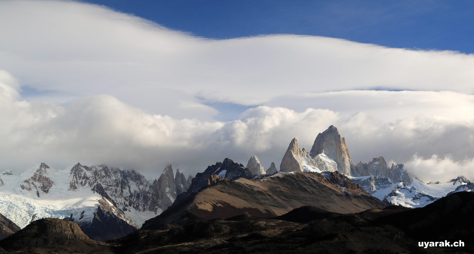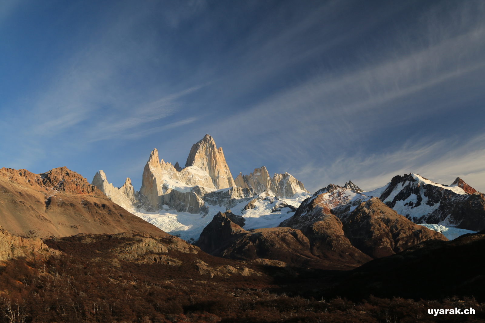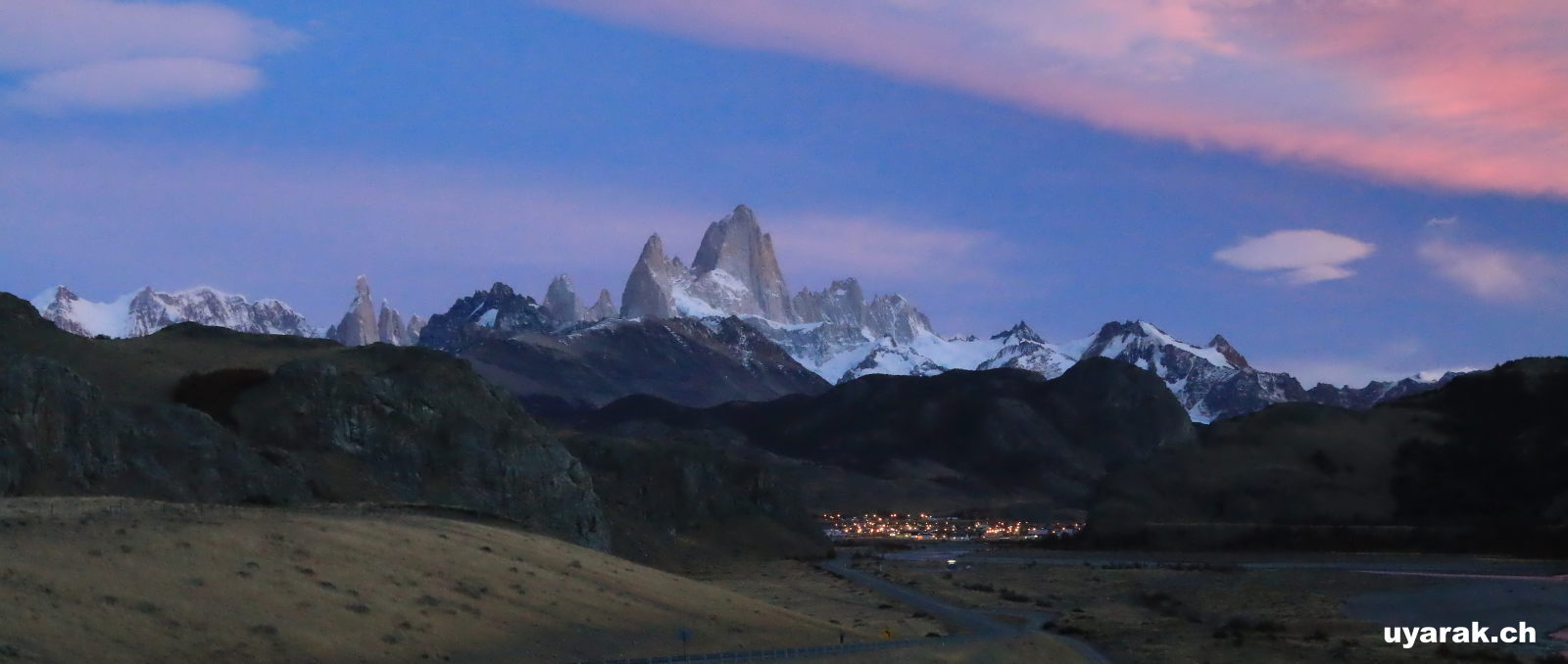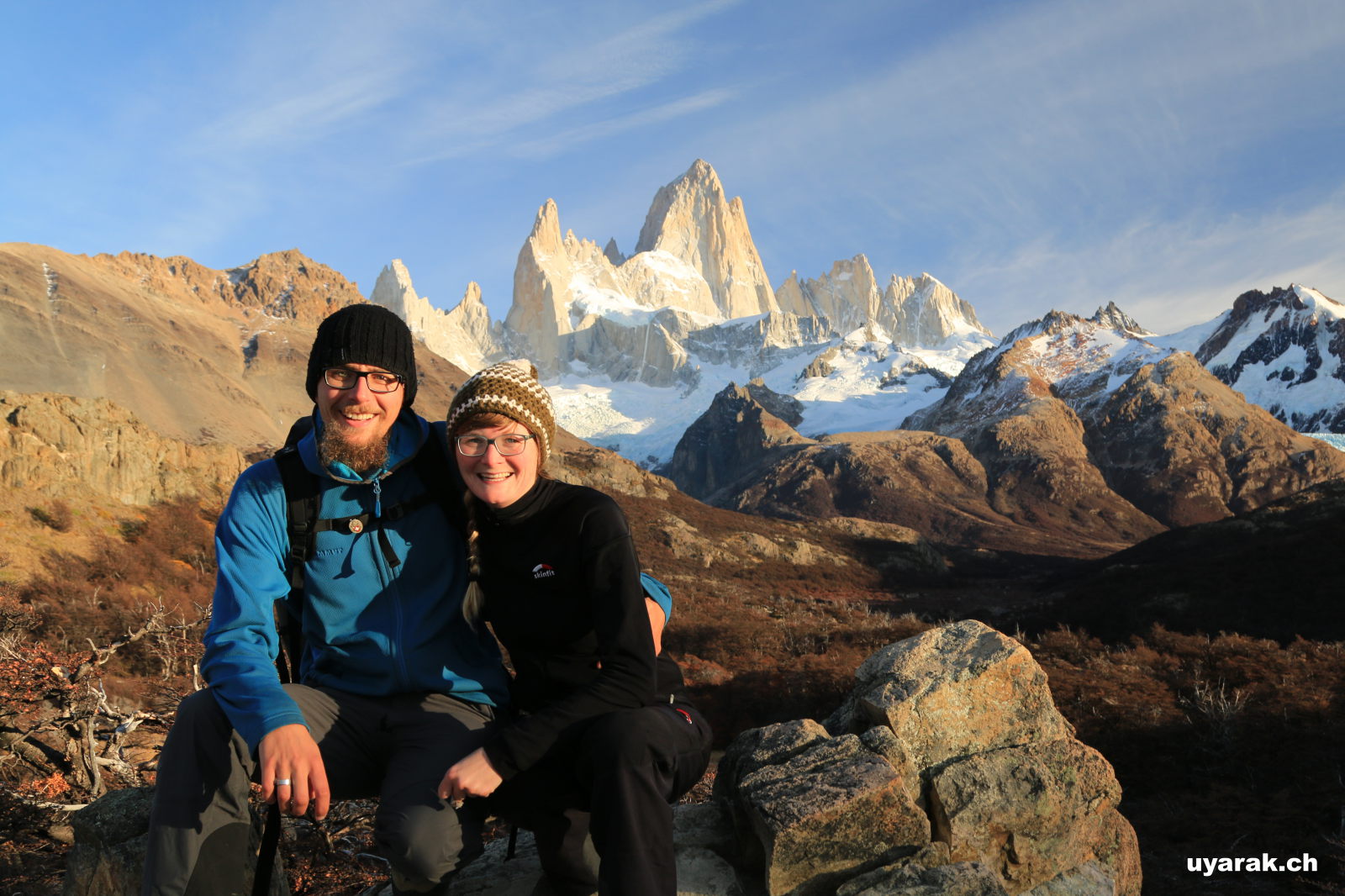 Wir erhaschen gerade noch einen kurzen Blick auf den wohl bekanntesten Berg Südamerikas bevor die Sonne untergeht und der Cerro Fitz Roy somit in der Dunkelheit verschwindet. Obwohl gerade einmal 3406 Meter hoch, gilt der nach Robert FitzRoy (Kapitän des Forschungsschiffes HMS Beagle) benannte Berg als äusserst schwer zu besteigen und wurde auch erst 1952 zum ersten Mal bezwungen.