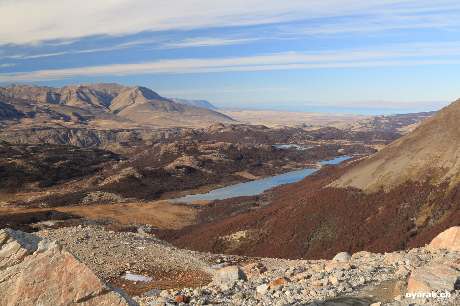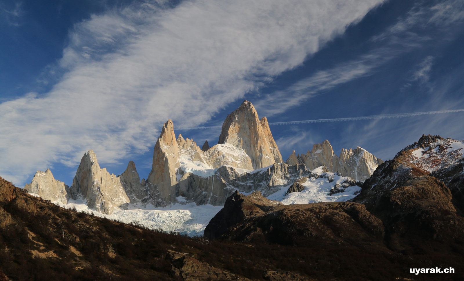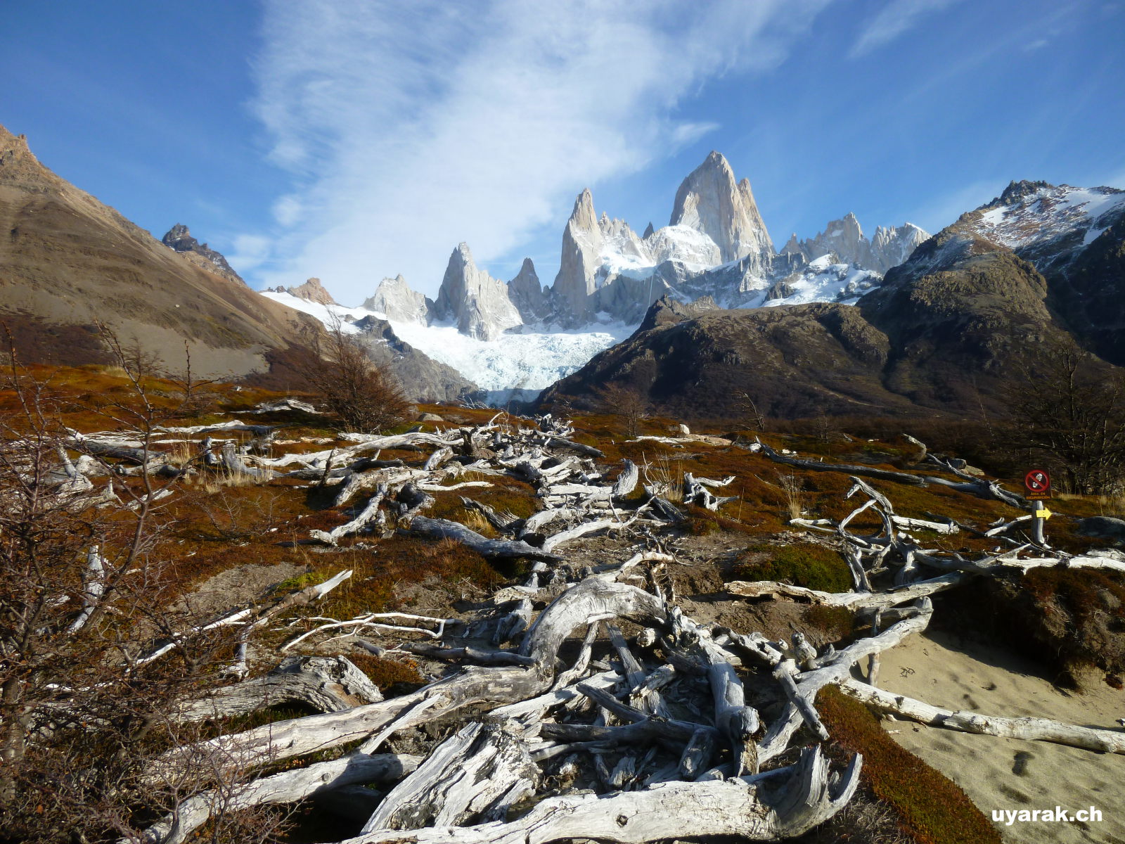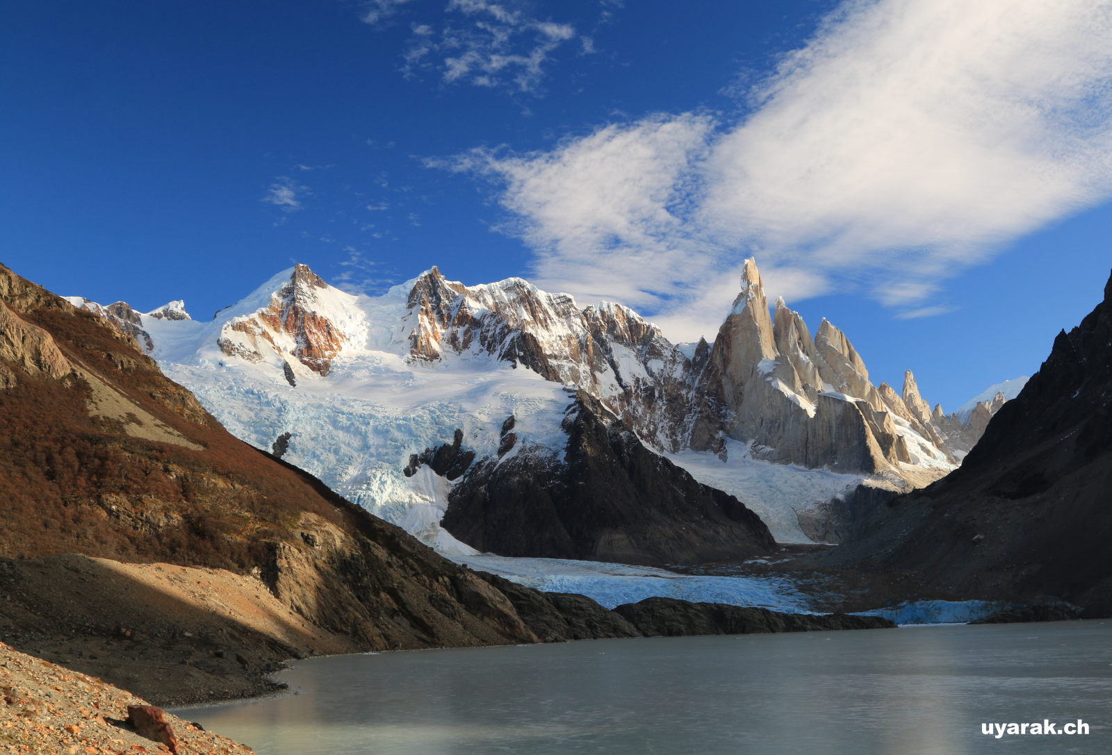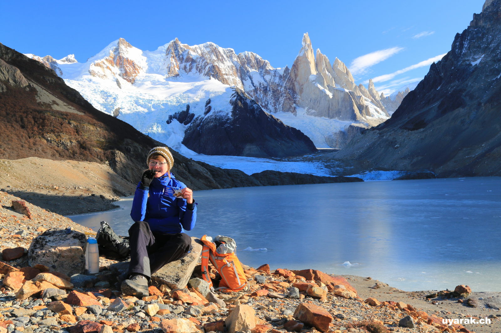 Nach einem Ruhetag brechen wir zu einer weiteren Wanderung auf, denn neben dem Cerro Fitz Roy steht noch ein weiterer, vor allem unter Kletterern sehr bekannter Berg: der Cerro Torre. Gemütlich geht der Weg durch Steppenvegetation und folgt immer dem Río Fitz Roy, wenn auch in gebührlichem Abstand. Durch einen losen Südbuchenwald kommen wir zum Mirrador Cerro Torre. Während das weite Tal des Río Fitz Roy noch im Schatten liegt, leuchten die Felswände des Torre bereits in der Morgensonne. Auch wir setzten uns dankend an die Sonne während ich die zugefrorene Trinkflasche mit dem Messer aufhacke.