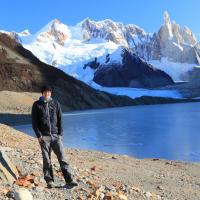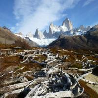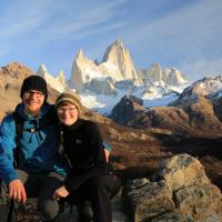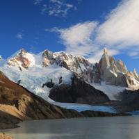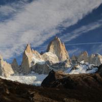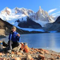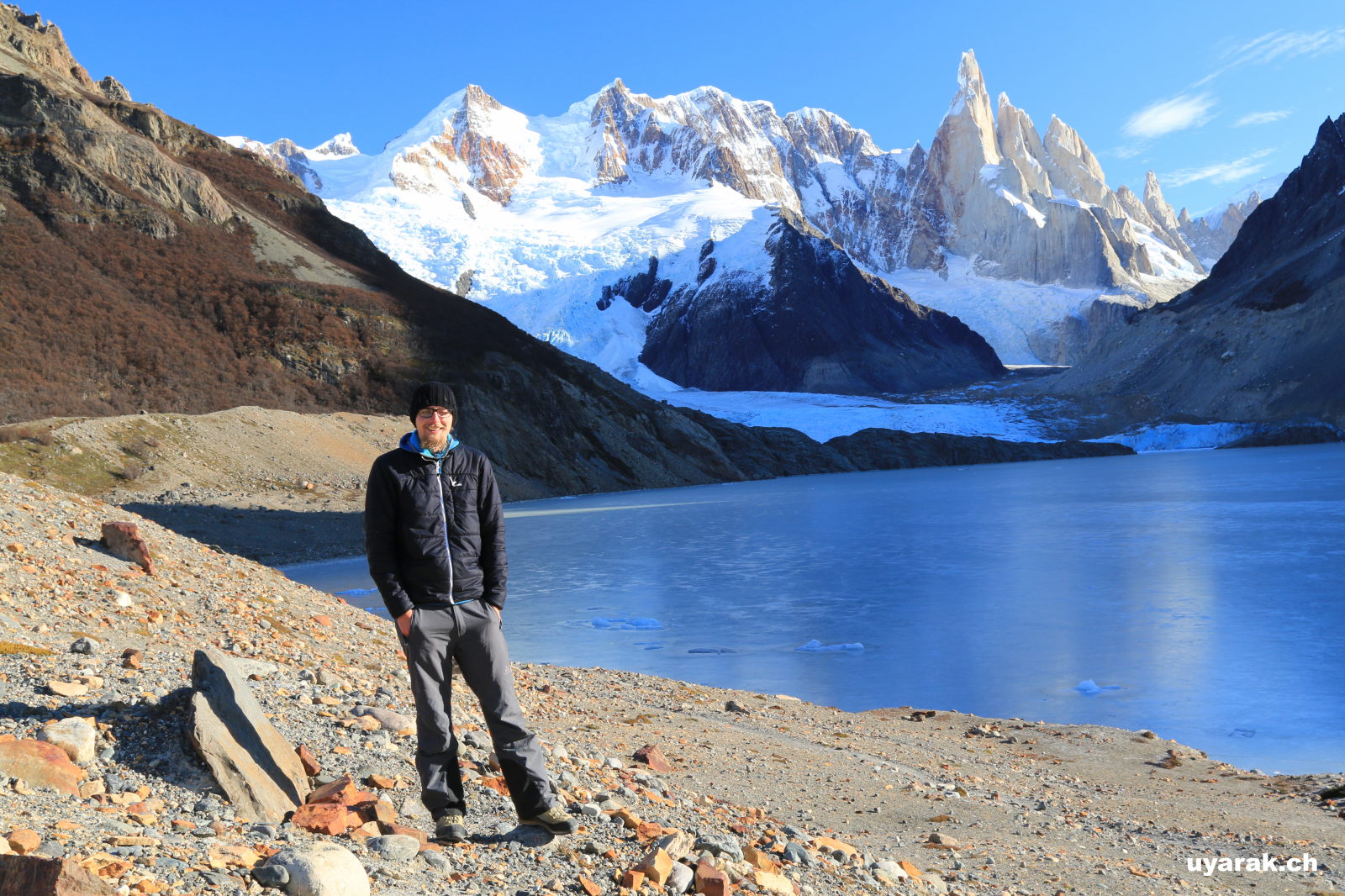 Von der Laguna de Los Tres aus soll man den besten Blick haben auf den Cerro Fitz Roy, hat uns der nette Herr im Besucherzentrum erklärt. 10 km und 800 Höhenmeter trennen uns vom Bergsee, als wir am nächsten Morgen kurz nach Sonnenaufgang (also so gegen neun Uhr) aufstehen und unsere Sachen packen. Es ist klirrend kalt und so braucht es seine Zeit bis auch der letzte Zeh in den Bergschuhen endlich aufgetaut ist. Beim Mirrador Fitz Roy haben wir nach 90 Minuten zum ersten Mal einen freien Blick auf den Berg und sind begeistert. Leicht abwärts geht es nun zum Campamento Poincenot wo wir den Río Blanco überqueren und uns dann an die noch fehlenden 400 Höhenmeter machen. Im Zick-Zack geht es steil bergauf bis wir plötzlich oben stehen. Hoch über dem zugefrorenen Bergsee thront majestätisch die Ostflanke vom Cerro Fitz Roy - ein unglaublicher Anblick. Den eisigen Temperaturen zum Trotz essen wir gemütlich unser Brot mit feinem Salami und Käse, nur die halb gefrorene Tomate schmeckt nicht so richtig. Zurück beim Parkplatz gönnen wir uns ein Glas Wein und geniessen noch die letzten Sonnenstrahlen bevor die eisige Kälte mit der Dunkelheit zurück kommt.