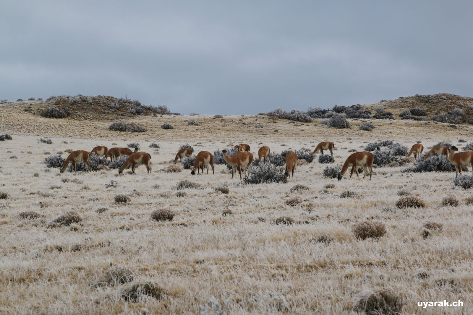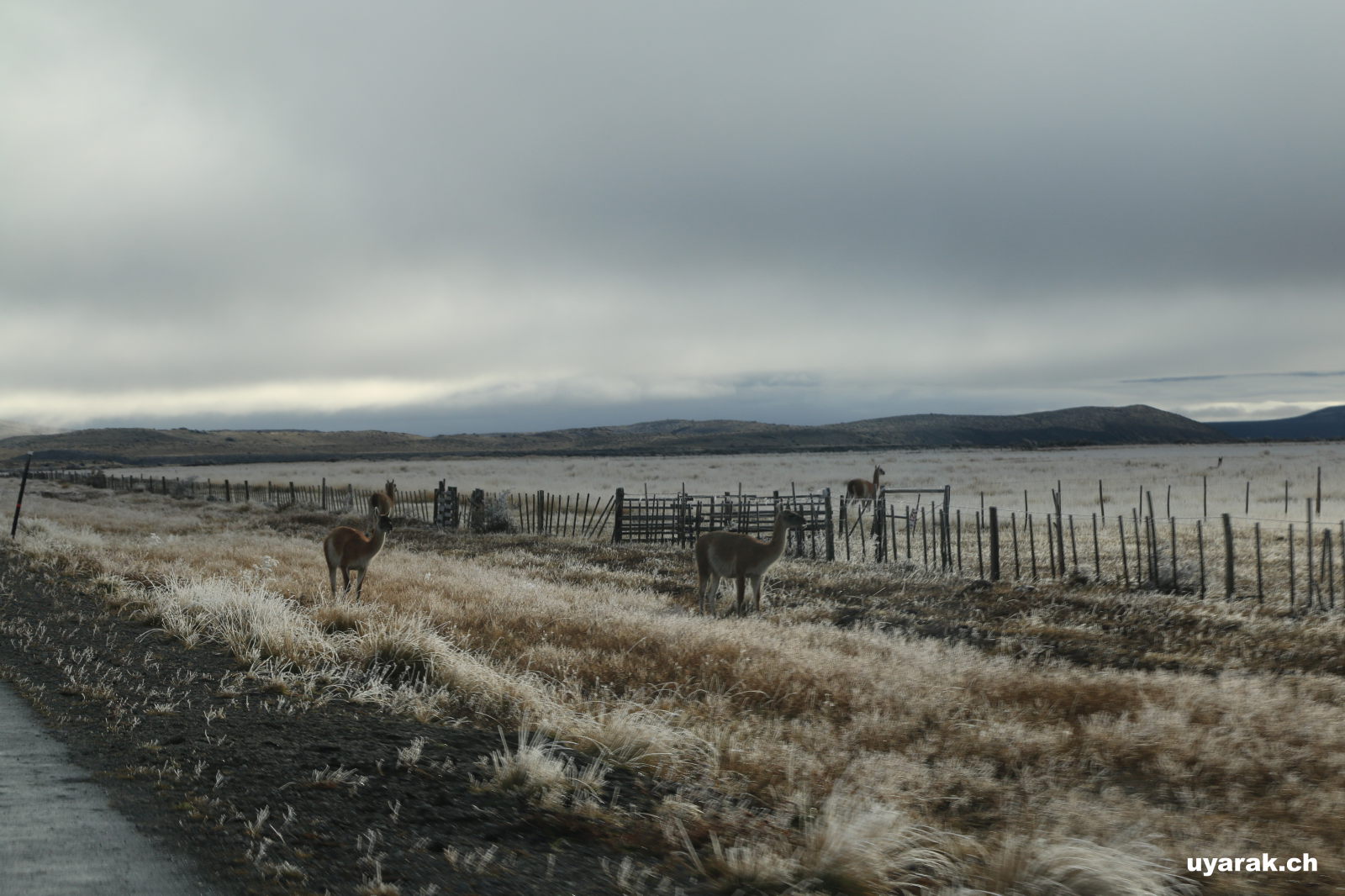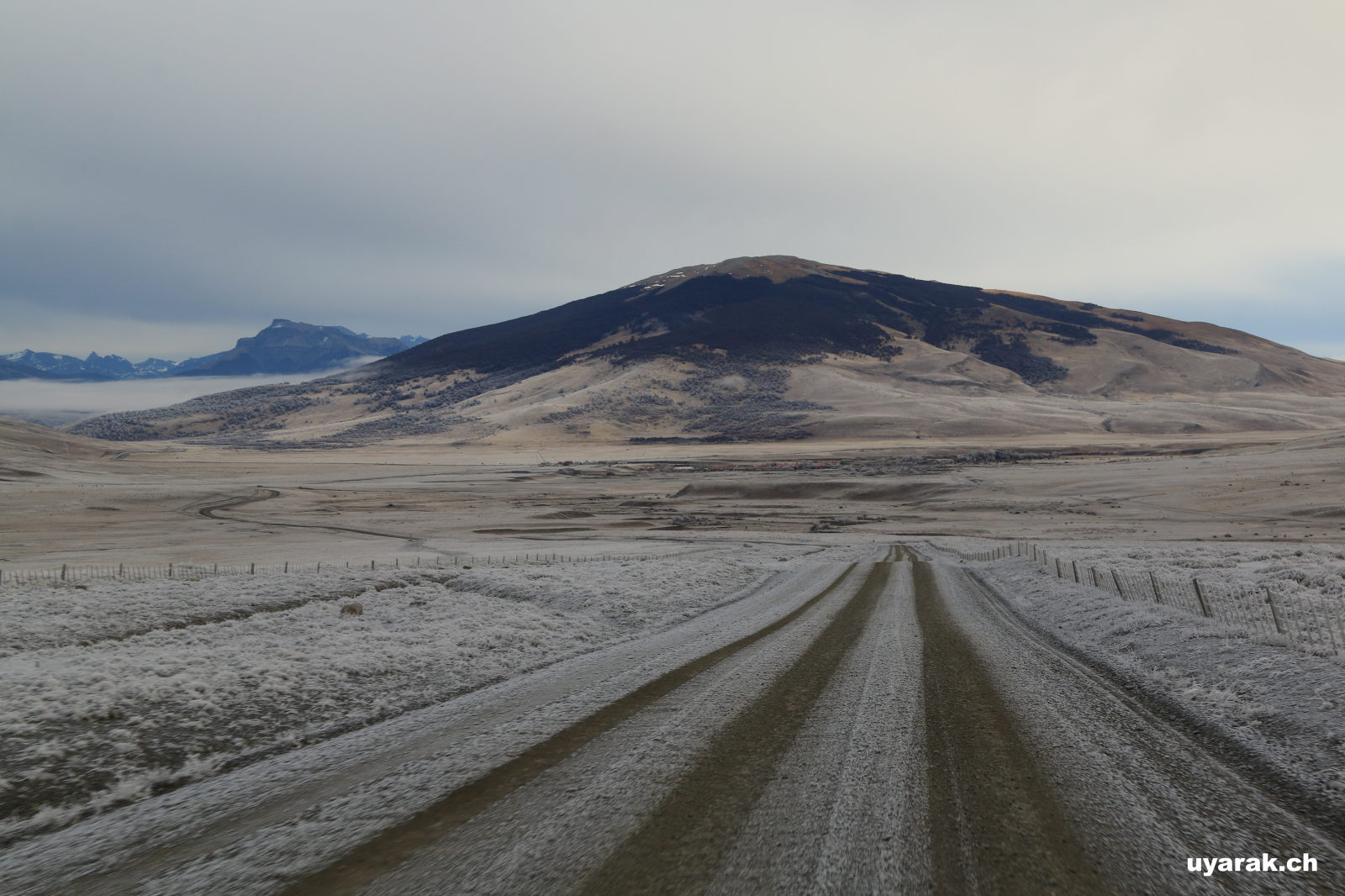 Bei der kleinen Ortschaft Tapi Aike (OK, eigentlich ist es nur ein Polizeiposten, eine Tankstelle und zwei Häuser) verbringen wir unsere vorläufig letzte Nacht in Argentinien und die bisher kälteste. Am Morgen sind die Zahnbürsten steinhart gefroren und trotz Motorstandheizung braucht es nach dem Losfahren eine ganze Weile bis wir keine weisse Wolke mit unverbranntem Diesel mehr hinter uns herziehen.