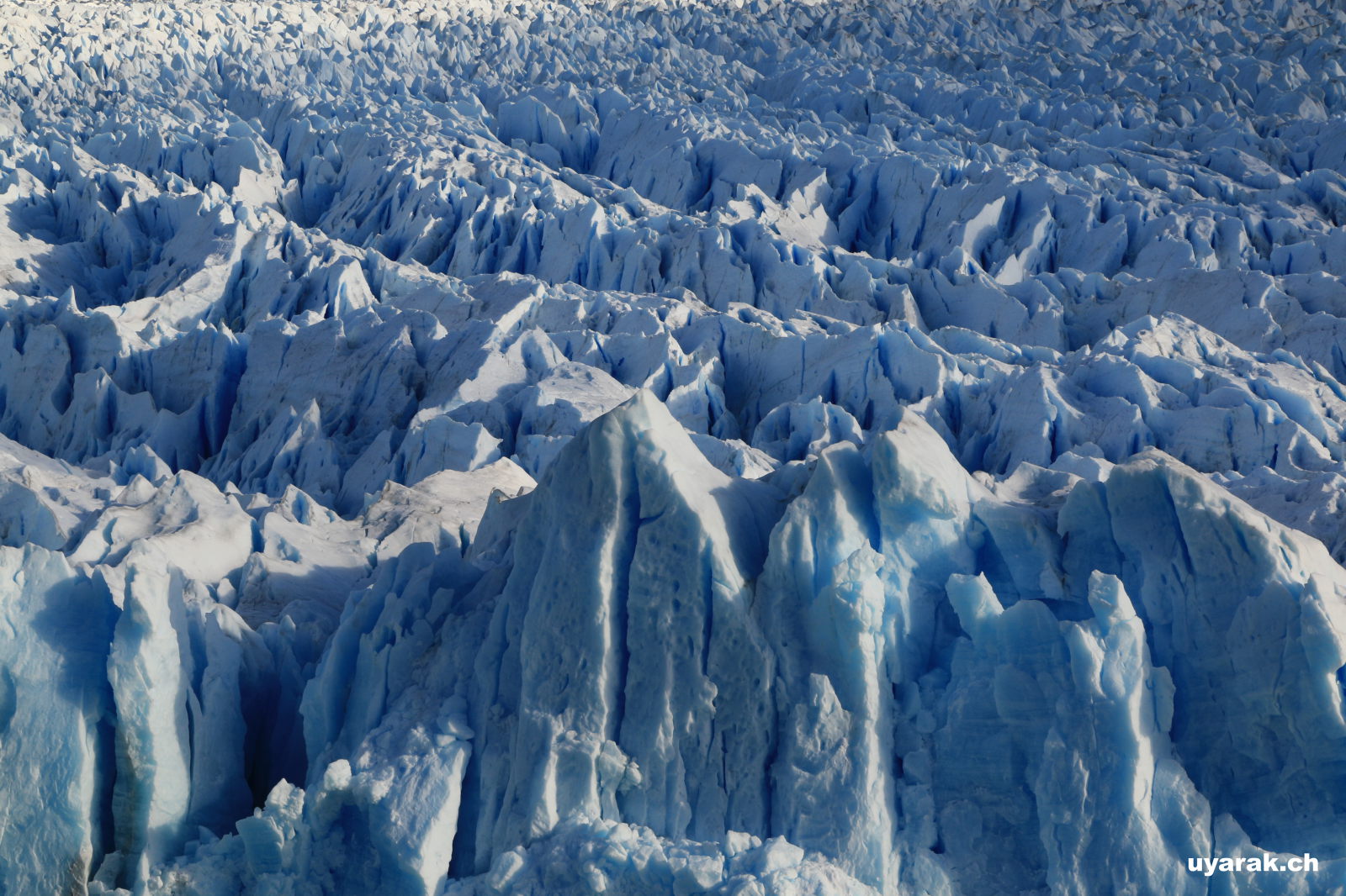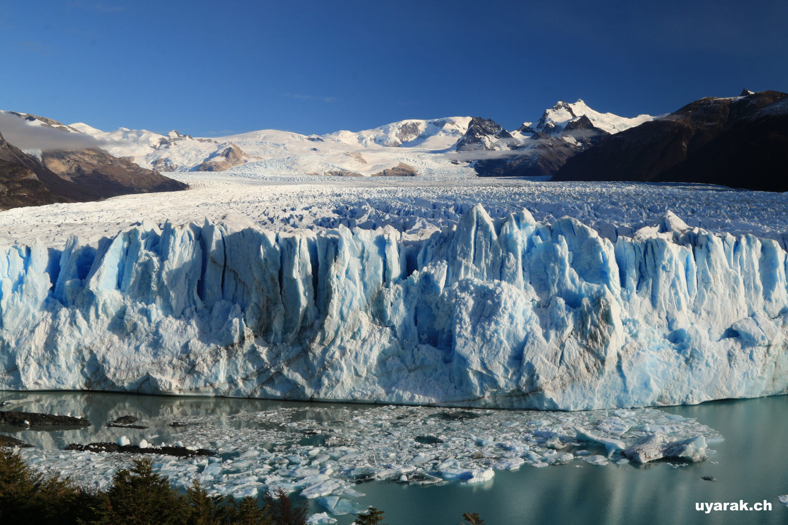 Gerade mal 120 Kilometer Luftlinie trennen El Chaltén und El Calafate, auf der Strasse sind es dann aber fast doppelt so viel. Doch wegen der Ortschaft fährt niemand hierher, das eigentliche Ziel liegt nochmals 75 km weiter westlich: der Glaciar Perito Moreno. Gespannt fahren wir am nächsten Morgen zum Parkeingang und müssen erst einmal leer schlucken: 330 Pesos (ca. Fr. 24) kostet der Eintritt - pro Person und Tag. Zähneknirschend bezahlen wir den überrissenen Preis und fahren hinein in den Park. Leider behält unser Reiseführer recht mit der Aussage, dass Nationalparks in Argentinien wenig mit Umweltschutz zu tun haben und nur als Einnahmequelle dienen. Der Anblick des Gletschers lässt uns die Unfähigkeit der Argentinischen Behörden dann aber schnell vergessen. Blau schimmert die 40 bis 70 m hohe Eiswand vor uns in der Sonne. Die Dimensionen sind gewaltig, der Perito-Moreno-Gletscher ist mit 254 km2 der grösste von unzähligen Auslassgletschern des Campo de Hielo Sur, einem Eisfeld das einen Drittel der Fläche der Schweiz aufweist.