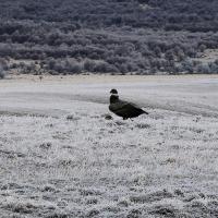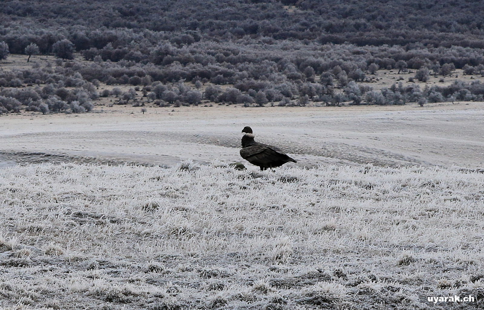 Langsam holpern wir über die hartgefrorene Schotterpiste und hoffen, dass der kleine Grenzübergang westlich von Cancha Carrera ganzjährig geöffnet ist. Wir haben Glück und die Argentinischen Beamten erledigen unsere Papiere trotz Mittagspause. Kaum sitzen wir wieder im Auto, entdeckt Fränzi einen Kondor nur wenige Meter neben der Strasse. Sieben Kilometer weiter westlich müssen sich ihre Chilenischen Kollegen aufgrund der Zeitverschiebung noch eine Stunde gedulden bis zur Mittagspause und so geht es auch hier schnell und unkompliziert. Die ansonsten obligatorische Kontrolle auf mitgeführte Lebensmittel entfällt - das kalte Wetter hat auch seine Vorteile.