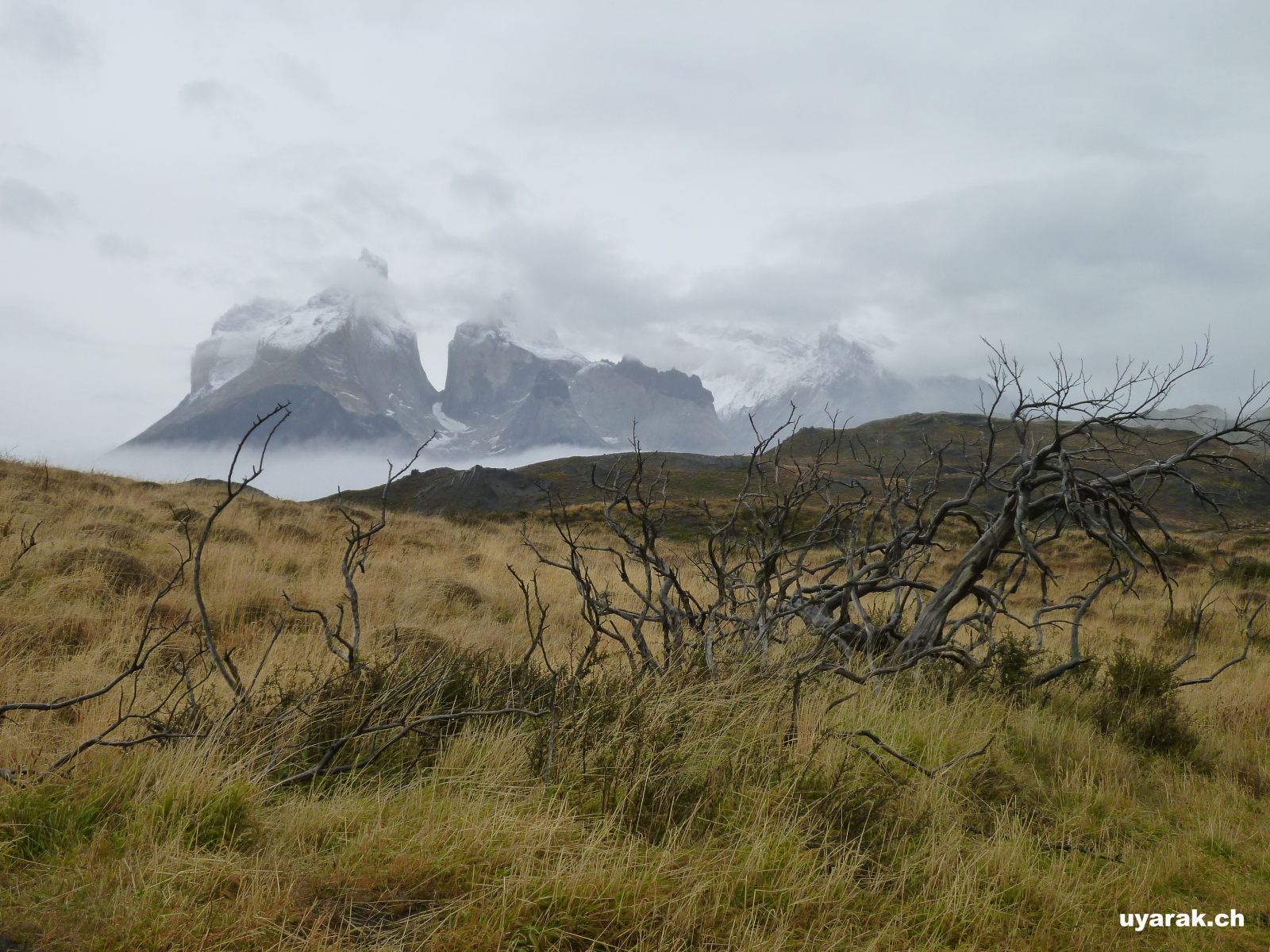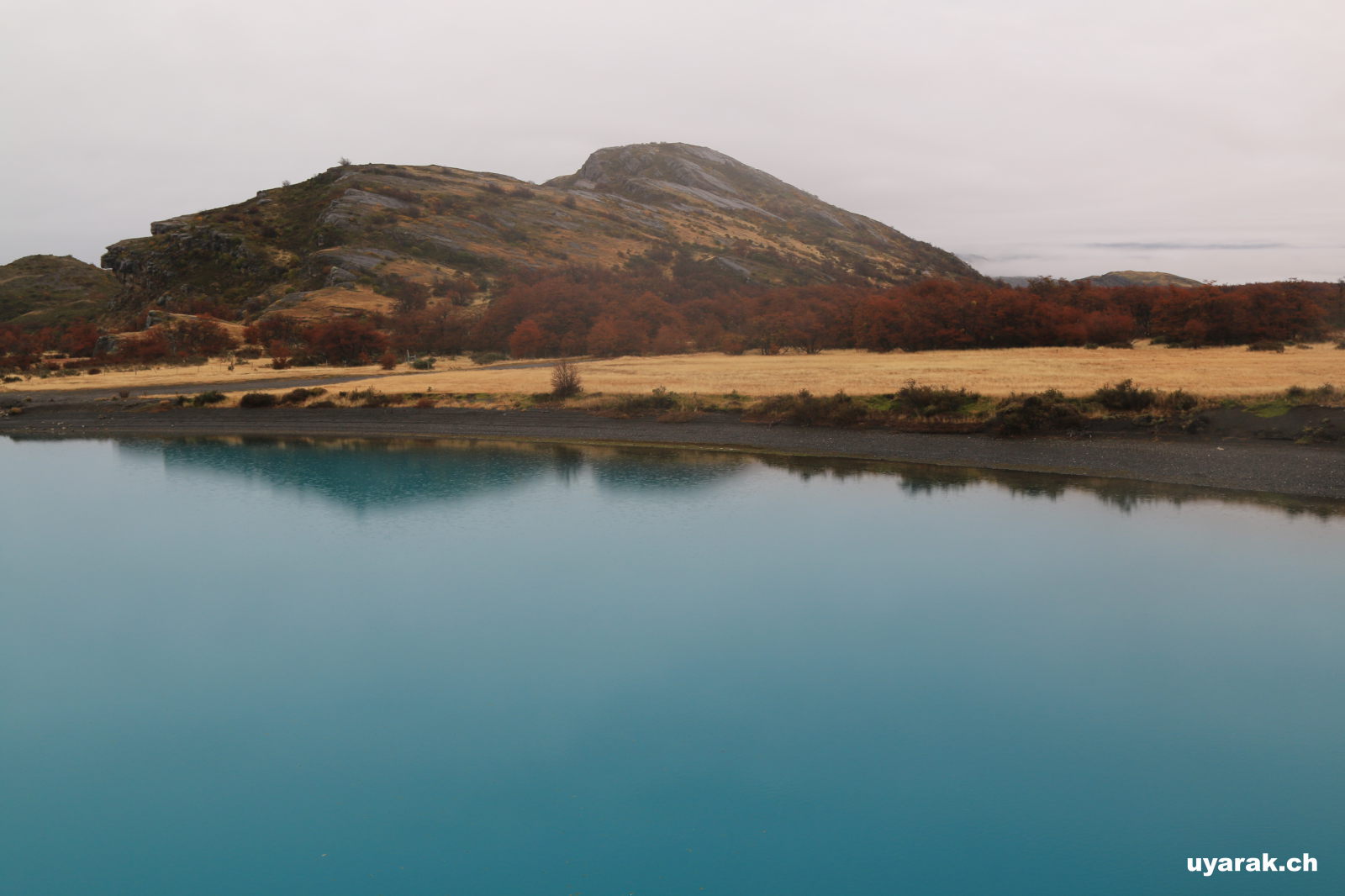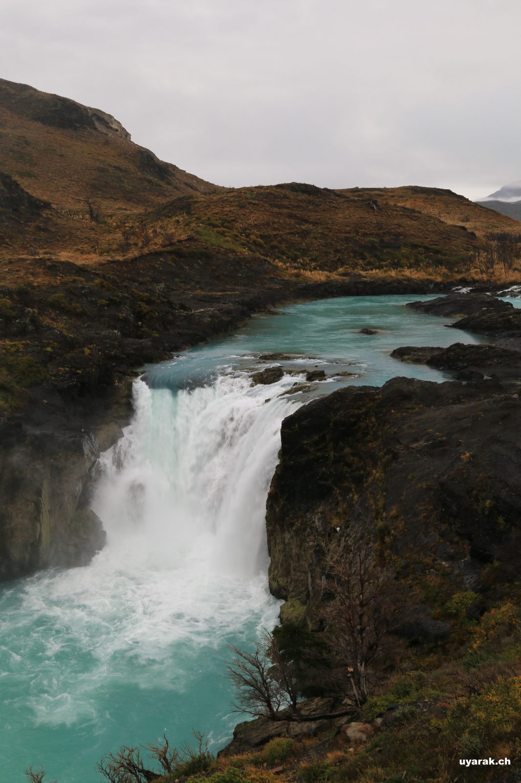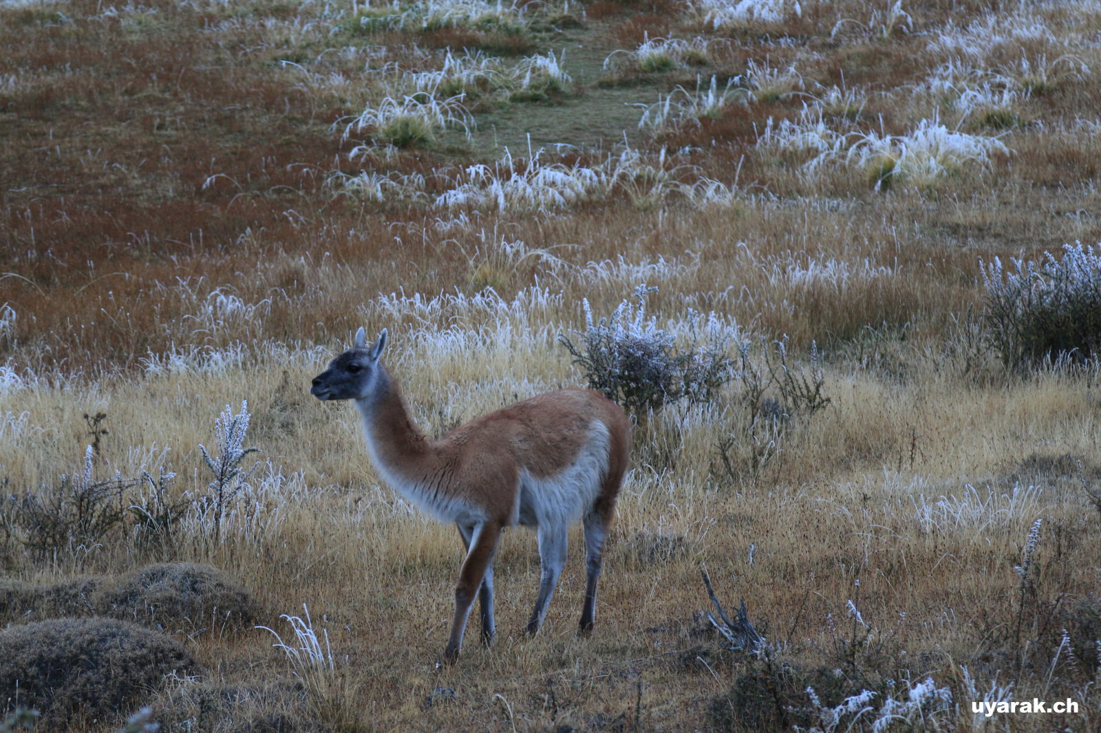 Während am Himmel zusehends dunklere Wolken aufziehen, fahren wir gegen Norden zum Parque Nacional Torres del Paine. In der Ranger-Station erkundigen wir uns nach dem Wetterbericht für morgen - Wolken, Regen, mehr Regen und vielleicht noch etwas Schnee. Bei diesen Aussichten streichen wir die geplante Wanderung und besuchen den Park auf amerikanische Art - mit dem Auto. Bei voll aufgedrehter Heizung fahren wir durch die herrliche Landschaft und bewundern die vielen kleinen Seen mit ihren ganz unterschiedlichen Blautönen. Die Nacht verwandelt die nassen Schotterpisten in Eisbahnen und so lassen wir am nächsten Morgen Uyarak erst mal stehen. Zu Fuss laufen wir zum Salto Grande, einem türkisfarbenen Wasserfall. Zwei Stunden später sind die Strassen dann wieder befahrbar und wir setzten unsere Rundfahrt fort.