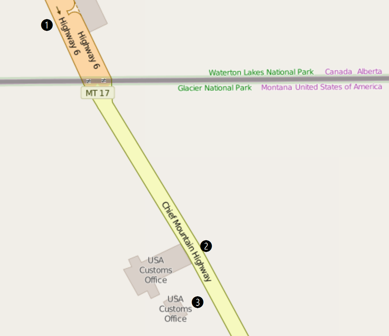 - Langsam am Kanadischen Zoll vorbeifahren ➊. Es sind keine Formalitäten notwendig.